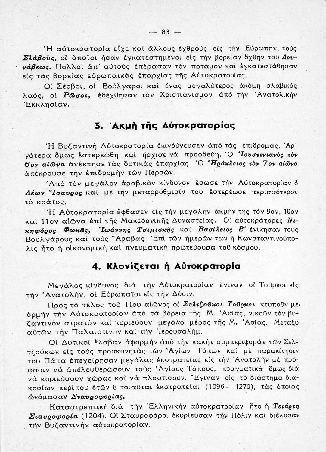 LDR 01126 2200205 4500 035 ## _a01-18446 040 ## _aΙνστιτούτο Εκπαιδευτικής Πολιτικής 041 ## _ael 100 ## _aΓεώργιος Σ. Βλέσσας 110 ## _a18446 245 0# _aΒυζαντινή Ιστορία .Τάξις Ε΄ Δημοτικού 260 ## _aΑθήνα _bΑτλαντίς _c1956 300 ## _a88 _bΣκίτσα, εικόνες (ασπρόμαυρα) 520 ## _aΜαθητικό βοήθημα Ιστορίας Ε΄ Δημοτικού που περιλαμβάνει την ιστορία της Βυζαντινής Αυτοκρατορίας και εστιάζει στο έργο και τη δράση του κάθε αυτοκράτορα μέχρι και την άλωση της Κωνσταντινούπολης. 521 ## _aΕ' Δημοτικού 522 ## _aΕλλάδα 546 ## _aΑπλή καθαρεύουσα 563 ## _aΣκληρό Εξώφυλλο 583 ## _a81102/30-6-1956 _c1956 650 #4 _aΑυτοκρατορία _aΒυζάντιο _aΠαλαιολόγοι _aΧριστιανισμός