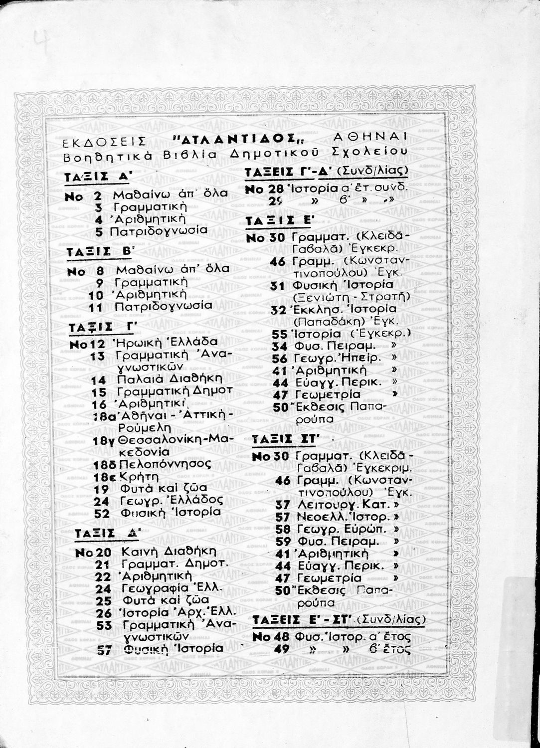 Εκδότης: Ατλαντίς Έτος έκδοσης: 1956 Τόπος έκδοσης: Αθήνα Υπουργική απόφαση / Σύμβαση: 81102/30-6-1956 Έτος έγκρισης: 1956 |