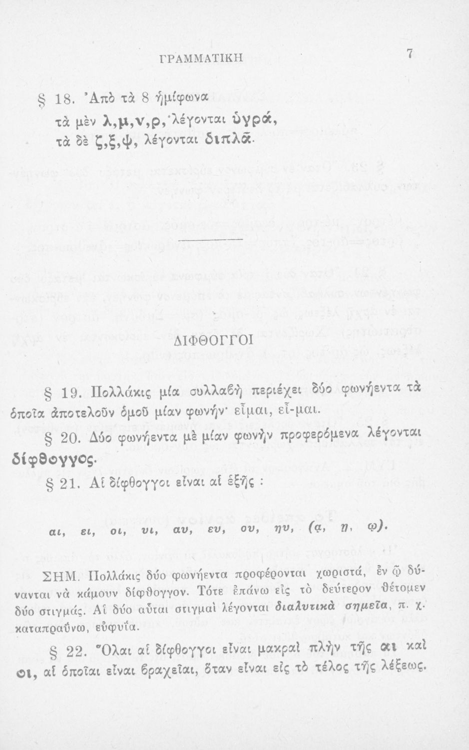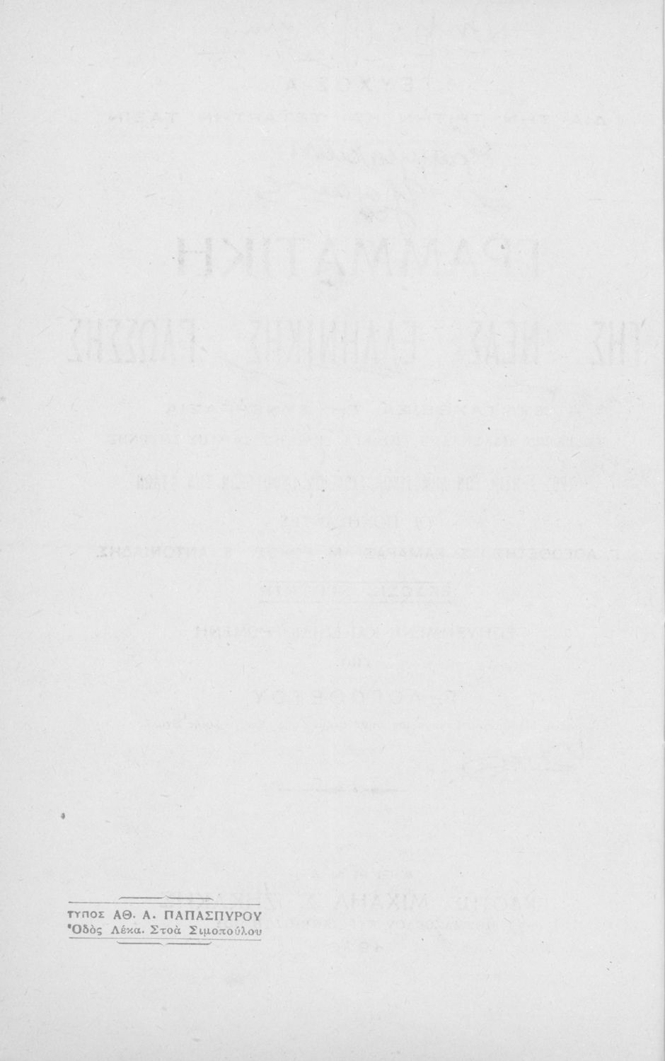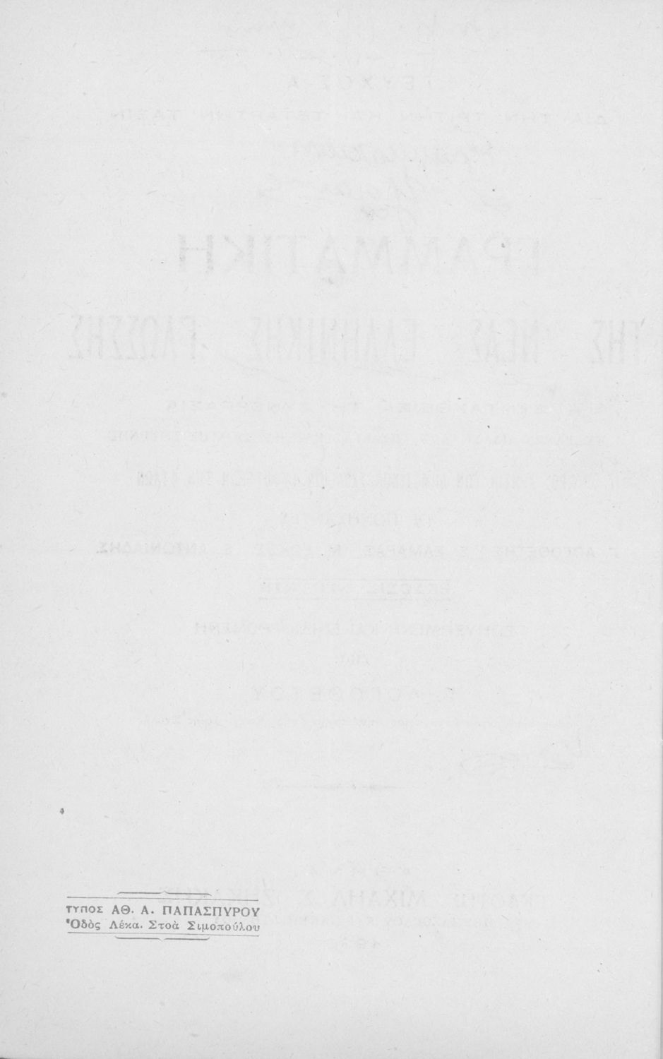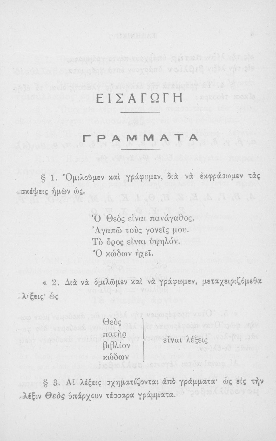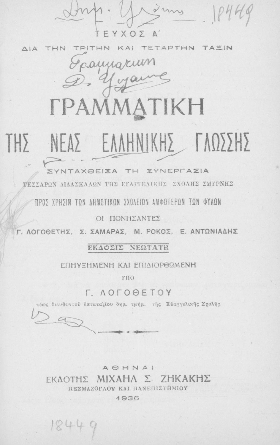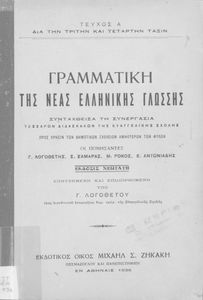 Σχολικό εγχειρίδιο Γ΄ και Δ΄ Δημοτικού που περιέχει τη γραμματικής της νέας ελληνικής. Την έκδοση επιμελήθηκε ο Γ. Λογοθέτης, τέως διευθυντής του επταταξίου δημ. Τμήμ.της Ευαγγελικής Σχολής.