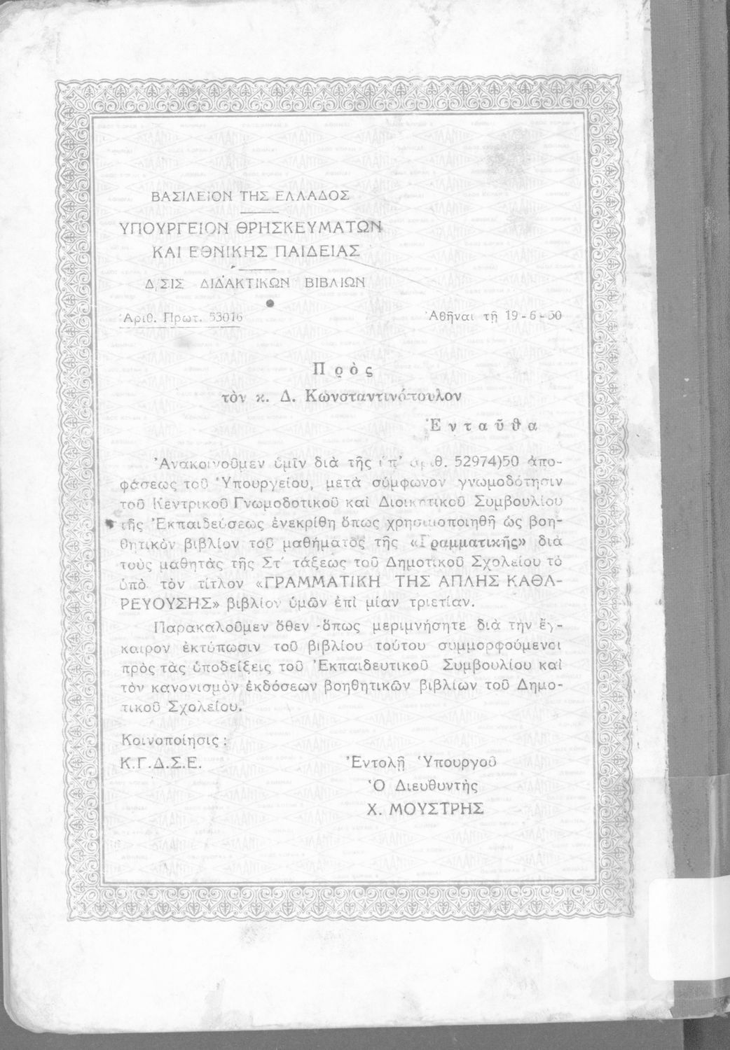 Σχολικό εγχειρίδιο Γλώσσας που περιέχει τη γραμματικής της καθαρεύουσας για τα Δημοτικά σχολεία.
