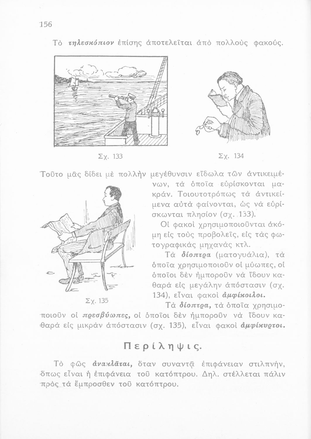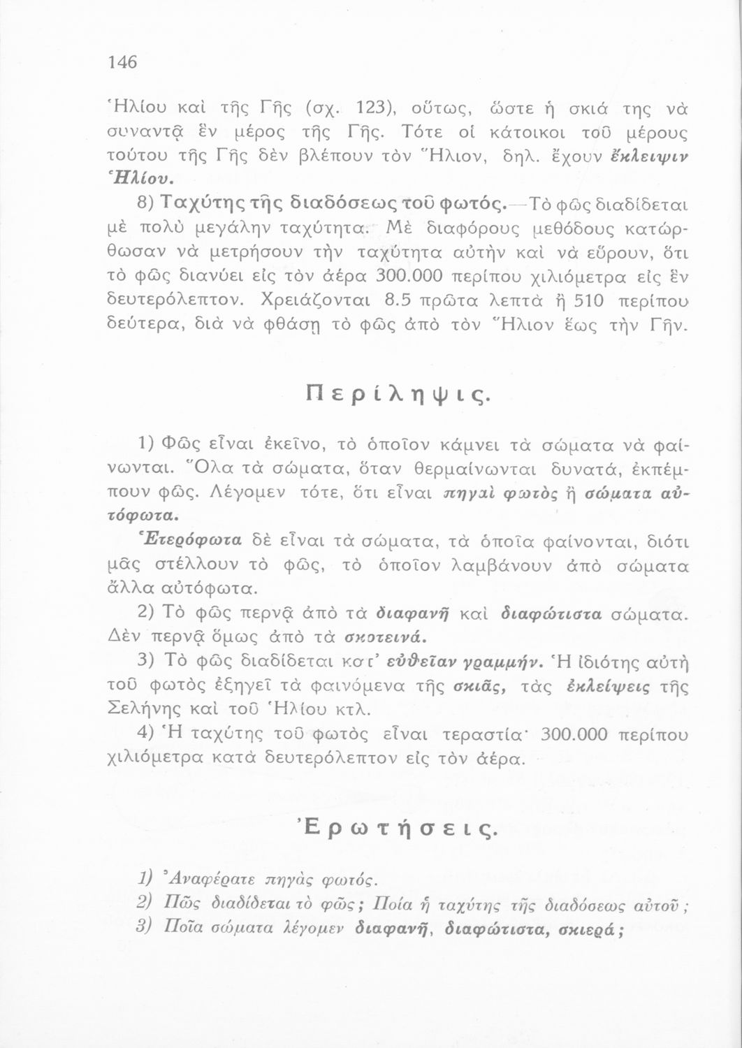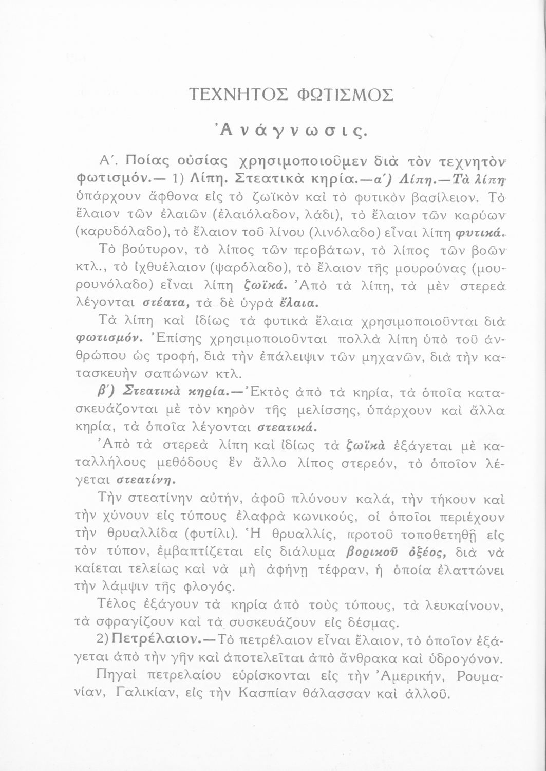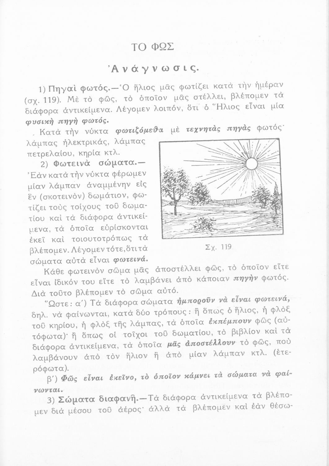 Βαθμίδα εκπαίδευσης: Δευτεροβάθμια Τάξη: Α' Γυμνασίου Μάθημα: Φυσική Γλώσσα: Καθαρεύουσα Παρουσίαση περιεχομένου: Σχολικό εγχειρίδιο της Α΄ Γυμνασίου για το μάθημα της Φυσικής. Παρέχει βασικές γνώσεις της Φυσικής επιστήμης και της Χημείας. Αναλύει τις ιδιότητες των σωμάτων, καθώς και της θερμότητας, του ηλεκτρισμού και του μαγνητισμού, την υδροστατική, την βαρύτητα και την αεροστατική. Σχετικά με τη Χημεία αναφέρεται στα μέταλλα, στα οξέα, τις βάσεις, τα άλατα. Αναφέρεται στην πρακτική εφαρμογή της Φυσικής και της Χημείας στην καθημερινότητά. Επίσης, περιλαμβάνει πολλά από τα όργανα, που χρησιμοποιούνται στη φυσική, και τη χημεία. Περιέχει εικόνες και σχεδιαγράμματα τα οποία βοηθούν τη διδασκαλία. Προτείνεται μια συγκεκριμένη δομή για τη διδασκαλία σύμφωνα με την οποία το μάθημα διαρθρώνεται αρχικά στην ανάγνωση, που αναφέρεται στη θεωρία, στην περίληψη των σημαντικότερων σημείων, στις ερωτήσεις κατανόησης και τέλος στο γύμνασμα, το οποίο είναι η πρακτική εφαρμογή για την εμπέδωση της θεωρίας. |