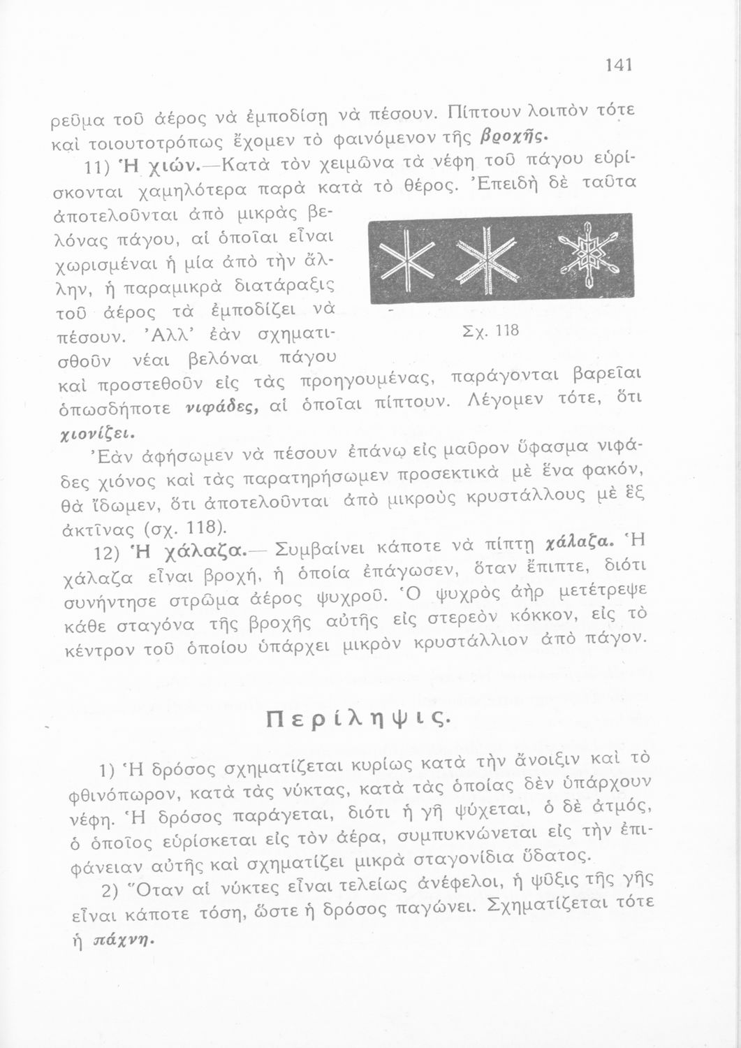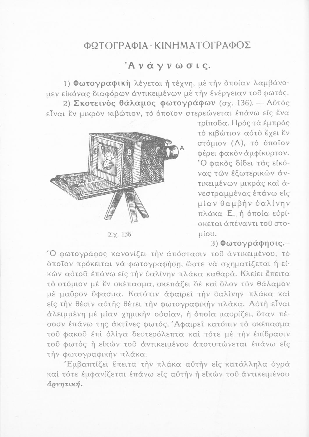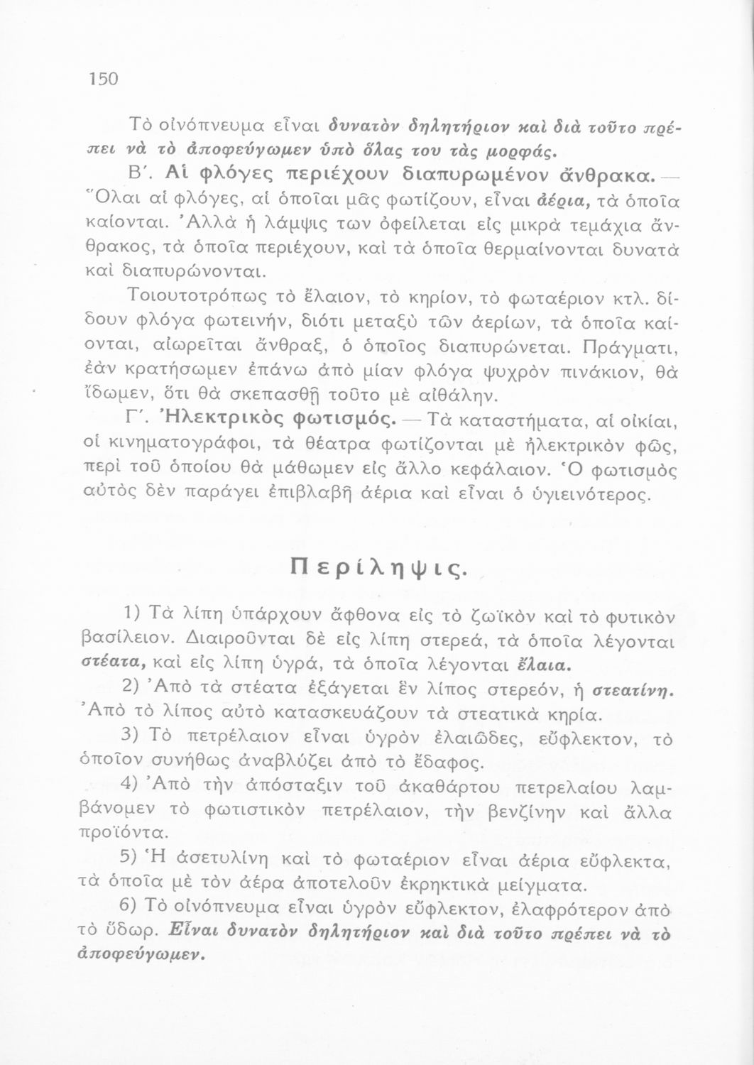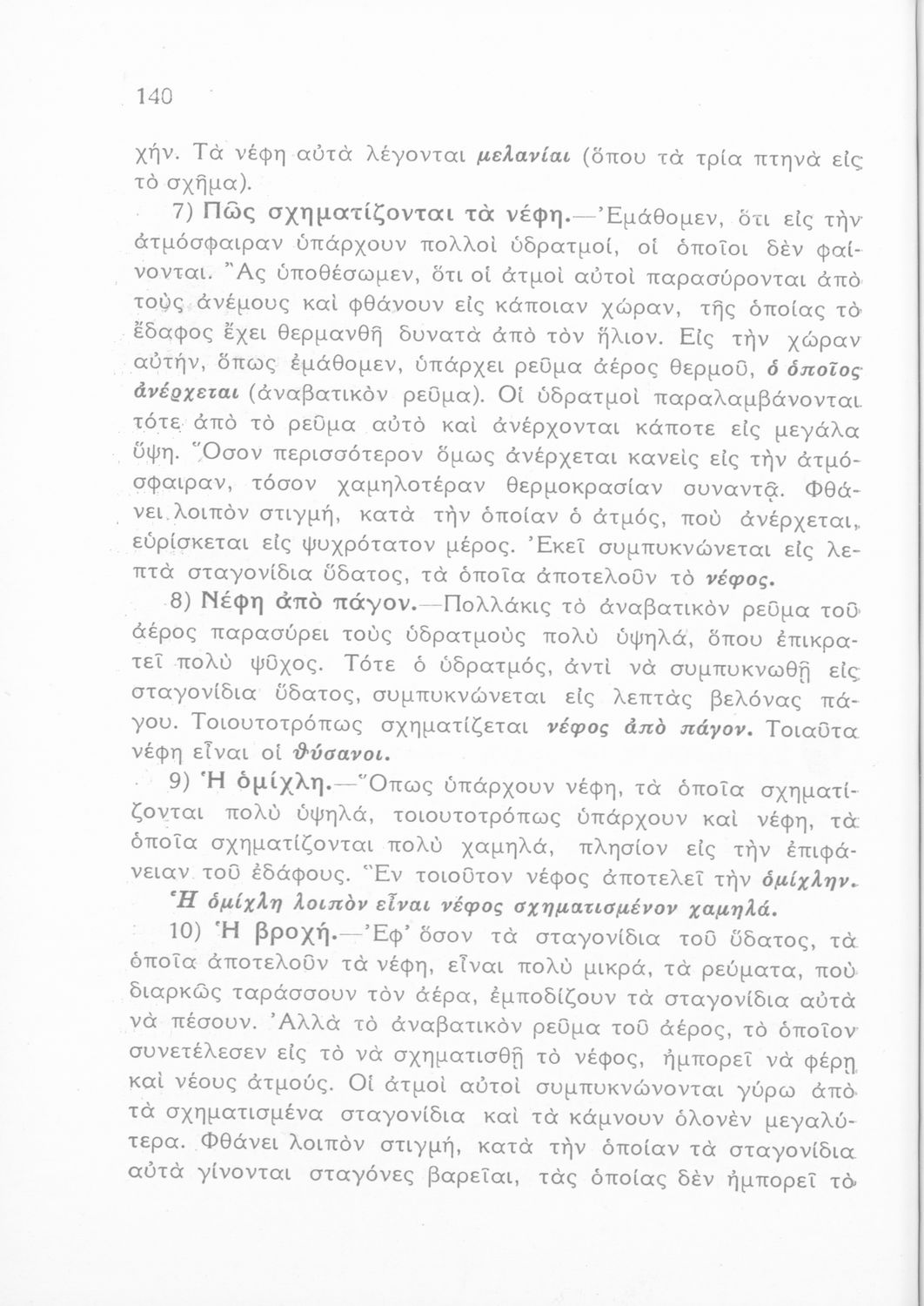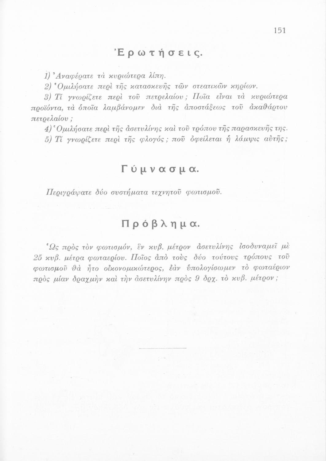 Βαθμίδα εκπαίδευσης: Δευτεροβάθμια Τάξη: Α' Γυμνασίου Μάθημα: Φυσική Γλώσσα: Καθαρεύουσα Παρουσίαση περιεχομένου: Σχολικό εγχειρίδιο της Α΄ Γυμνασίου για το μάθημα της Φυσικής. Παρέχει βασικές γνώσεις της Φυσικής επιστήμης και της Χημείας. Αναλύει τις ιδιότητες των σωμάτων, καθώς και της θερμότητας, του ηλεκτρισμού και του μαγνητισμού, την υδροστατική, την βαρύτητα και την αεροστατική. Σχετικά με τη Χημεία αναφέρεται στα μέταλλα, στα οξέα, τις βάσεις, τα άλατα. Αναφέρεται στην πρακτική εφαρμογή της Φυσικής και της Χημείας στην καθημερινότητά. Επίσης, περιλαμβάνει πολλά από τα όργανα, που χρησιμοποιούνται στη φυσική, και τη χημεία. Περιέχει εικόνες και σχεδιαγράμματα τα οποία βοηθούν τη διδασκαλία. Προτείνεται μια συγκεκριμένη δομή για τη διδασκαλία σύμφωνα με την οποία το μάθημα διαρθρώνεται αρχικά στην ανάγνωση, που αναφέρεται στη θεωρία, στην περίληψη των σημαντικότερων σημείων, στις ερωτήσεις κατανόησης και τέλος στο γύμνασμα, το οποίο είναι η πρακτική εφαρμογή για την εμπέδωση της θεωρίας. |