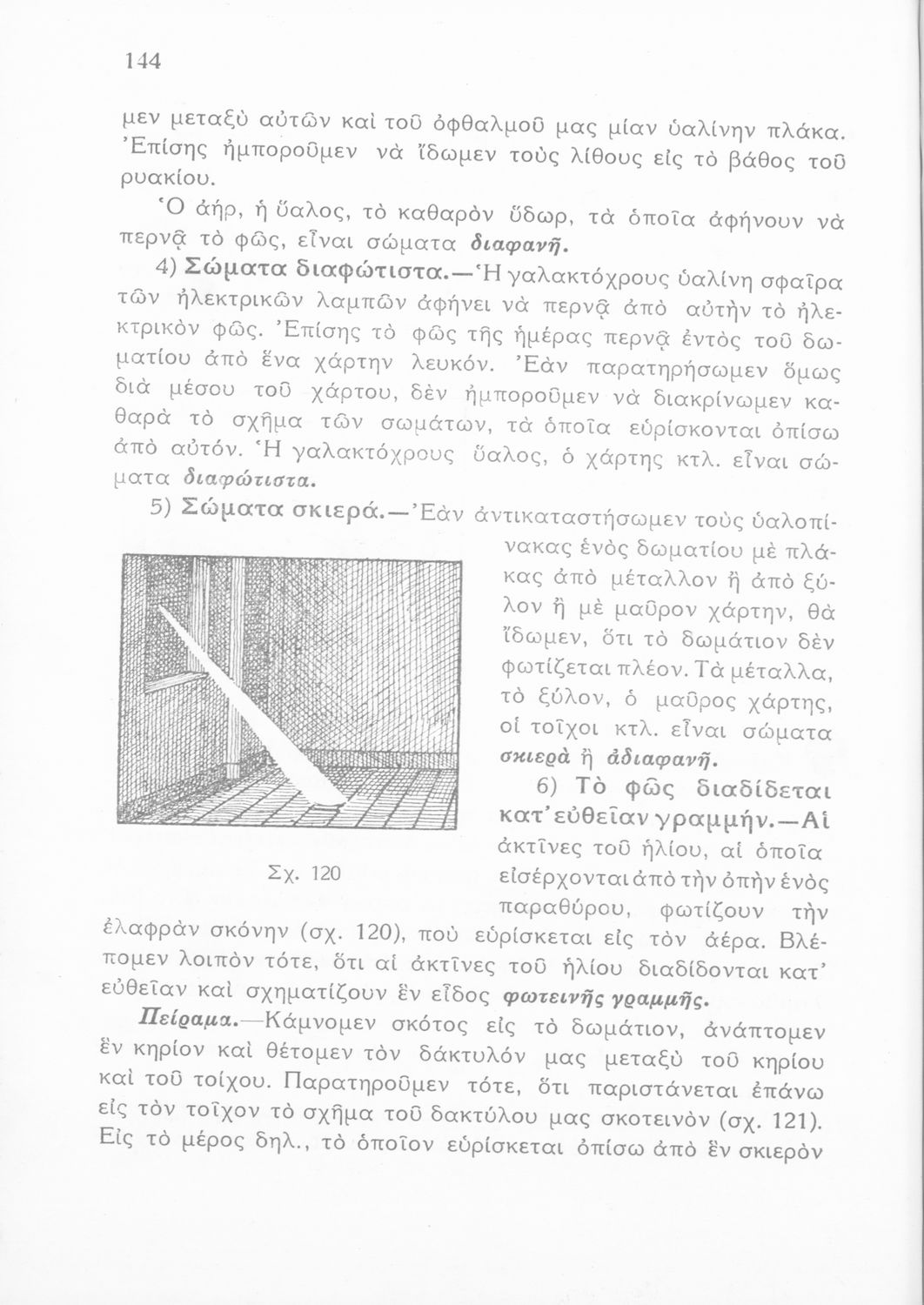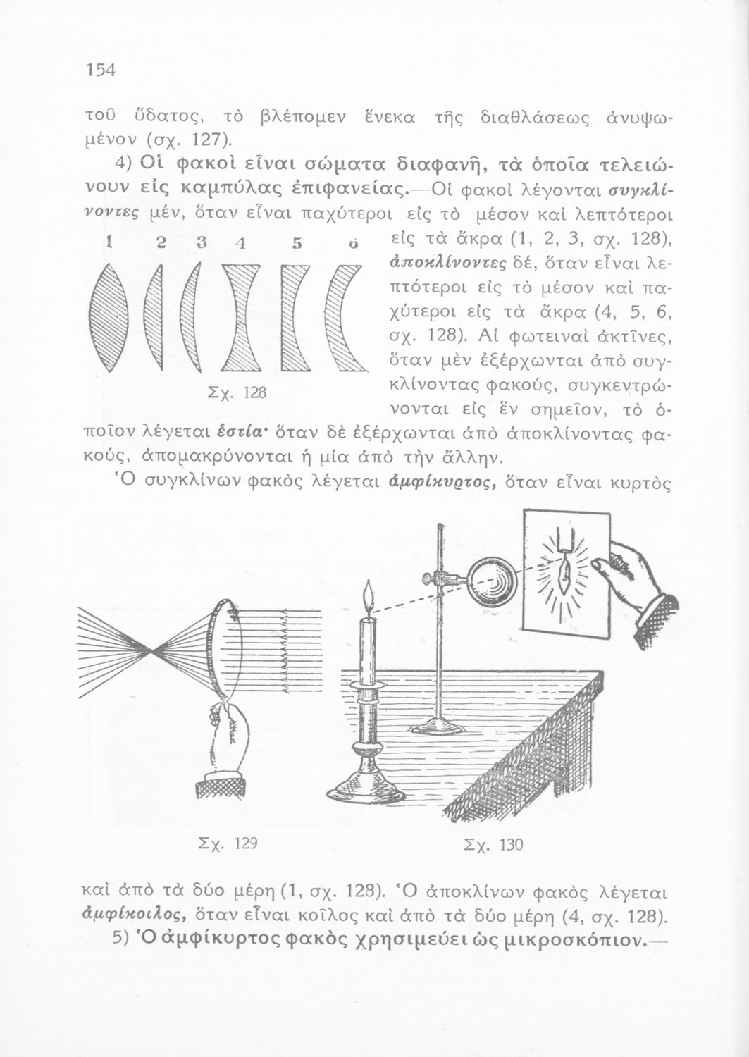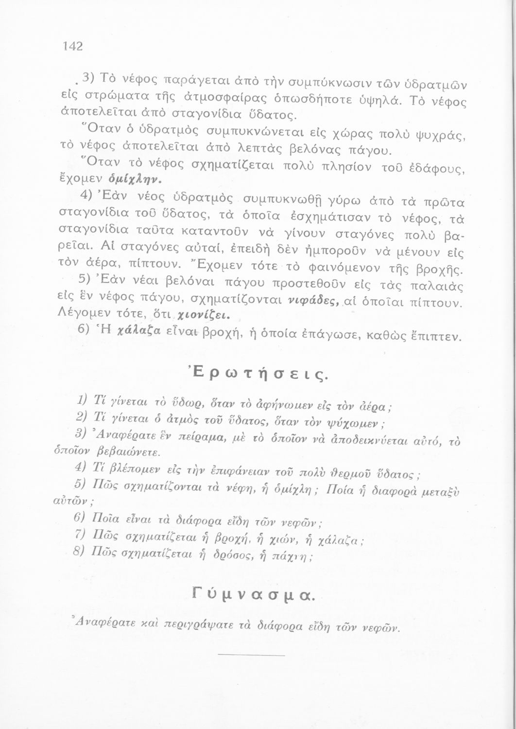 Σχολικό εγχειρίδιο της Α΄ Γυμνασίου για το μάθημα της Φυσικής. Παρέχει βασικές γνώσεις της Φυσικής επιστήμης και της Χημείας. Αναλύει τις ιδιότητες των σωμάτων, καθώς και της θερμότητας, του ηλεκτρισμού και του μαγνητισμού, την υδροστατική, την βαρύτητα και την αεροστατική. Σχετικά με τη Χημεία αναφέρεται στα μέταλλα, στα οξέα, τις βάσεις, τα άλατα. Αναφέρεται στην πρακτική εφαρμογή της Φυσικής και της Χημείας στην καθημερινότητά. Επίσης, περιλαμβάνει πολλά από τα όργανα, που χρησιμοποιούνται στη φυσική, και τη χημεία. Περιέχει εικόνες και σχεδιαγράμματα τα οποία βοηθούν τη διδασκαλία. Προτείνεται μια συγκεκριμένη δομή για τη διδασκαλία σύμφωνα με την οποία το μάθημα διαρθρώνεται αρχικά στην ανάγνωση, που αναφέρεται στη θεωρία, στην περίληψη των σημαντικότερων σημείων, στις ερωτήσεις κατανόησης και τέλος στο γύμνασμα, το οποίο είναι η πρακτική εφαρμογή για την εμπέδωση της θεωρίας.