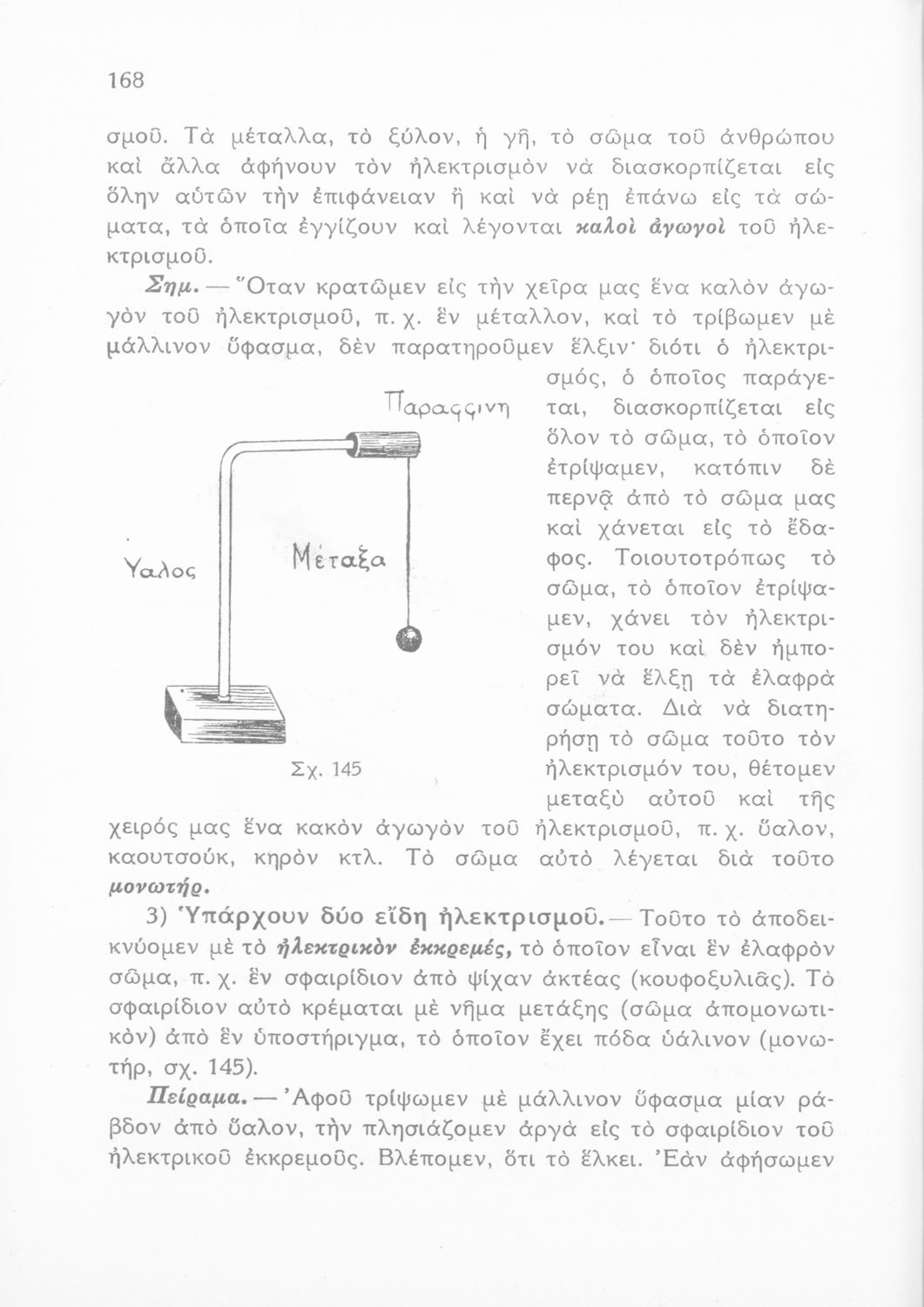 Σχολικό εγχειρίδιο της Α΄ Γυμνασίου για το μάθημα της Φυσικής. Παρέχει βασικές γνώσεις της Φυσικής επιστήμης και της Χημείας. Αναλύει τις ιδιότητες των σωμάτων, καθώς και της θερμότητας, του ηλεκτρισμού και του μαγνητισμού, την υδροστατική, την βαρύτητα και την αεροστατική. Σχετικά με τη Χημεία αναφέρεται στα μέταλλα, στα οξέα, τις βάσεις, τα άλατα. Αναφέρεται στην πρακτική εφαρμογή της Φυσικής και της Χημείας στην καθημερινότητά. Επίσης, περιλαμβάνει πολλά από τα όργανα, που χρησιμοποιούνται στη φυσική, και τη χημεία. Περιέχει εικόνες και σχεδιαγράμματα τα οποία βοηθούν τη διδασκαλία. Προτείνεται μια συγκεκριμένη δομή για τη διδασκαλία σύμφωνα με την οποία το μάθημα διαρθρώνεται αρχικά στην ανάγνωση, που αναφέρεται στη θεωρία, στην περίληψη των σημαντικότερων σημείων, στις ερωτήσεις κατανόησης και τέλος στο γύμνασμα, το οποίο είναι η πρακτική εφαρμογή για την εμπέδωση της θεωρίας.