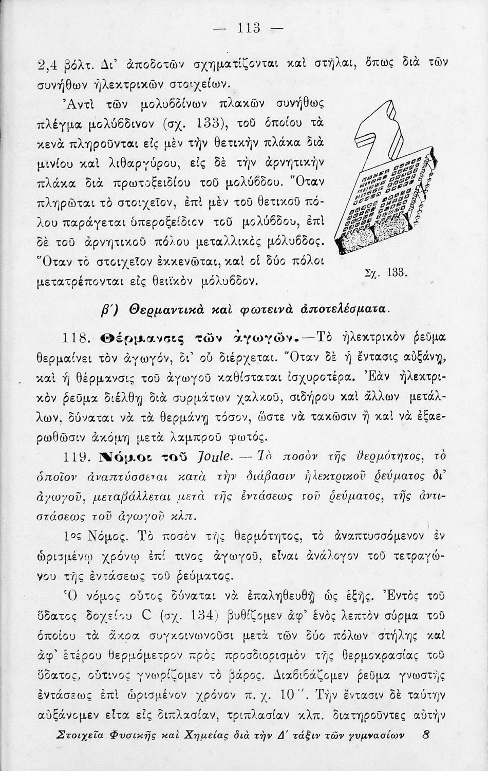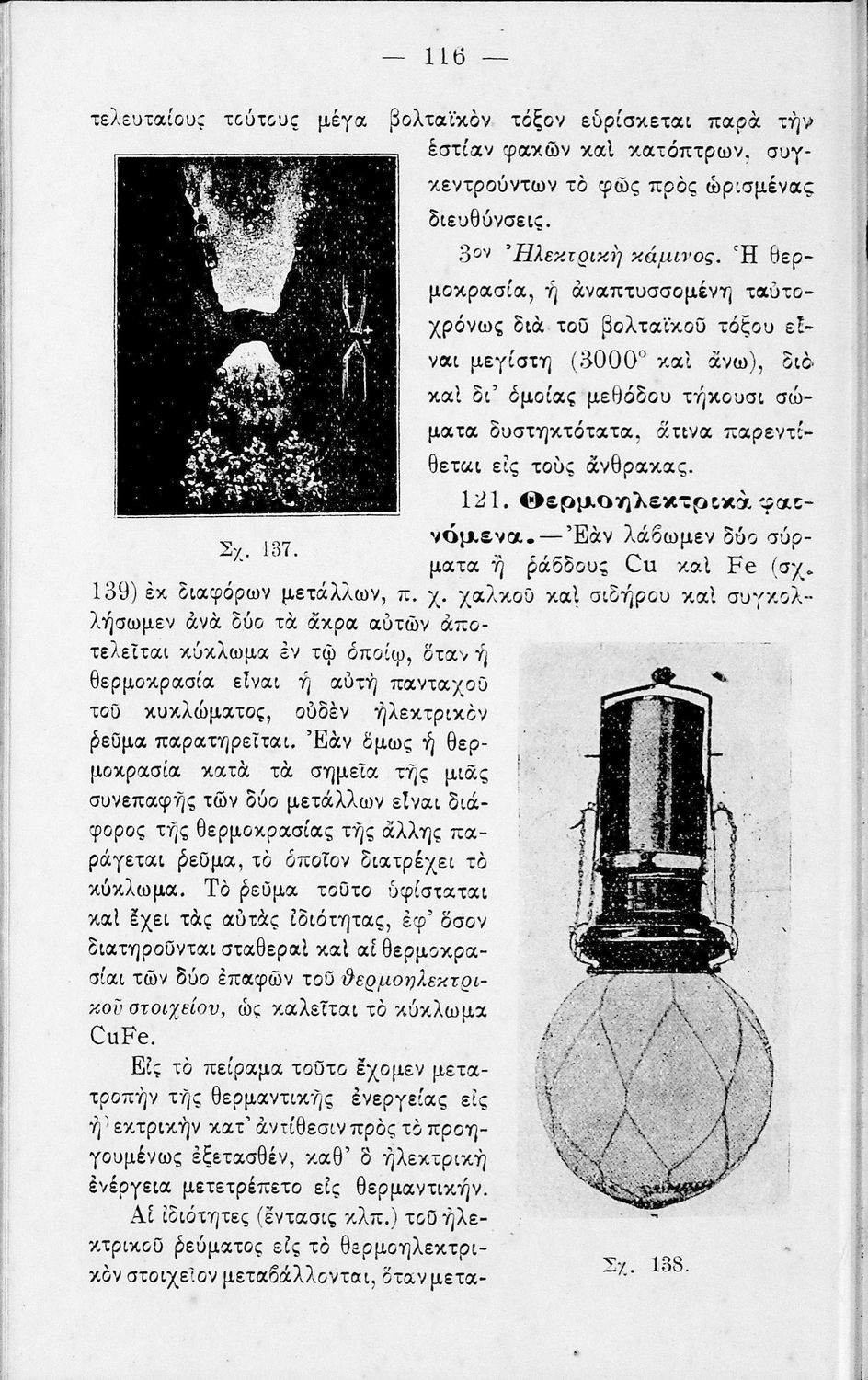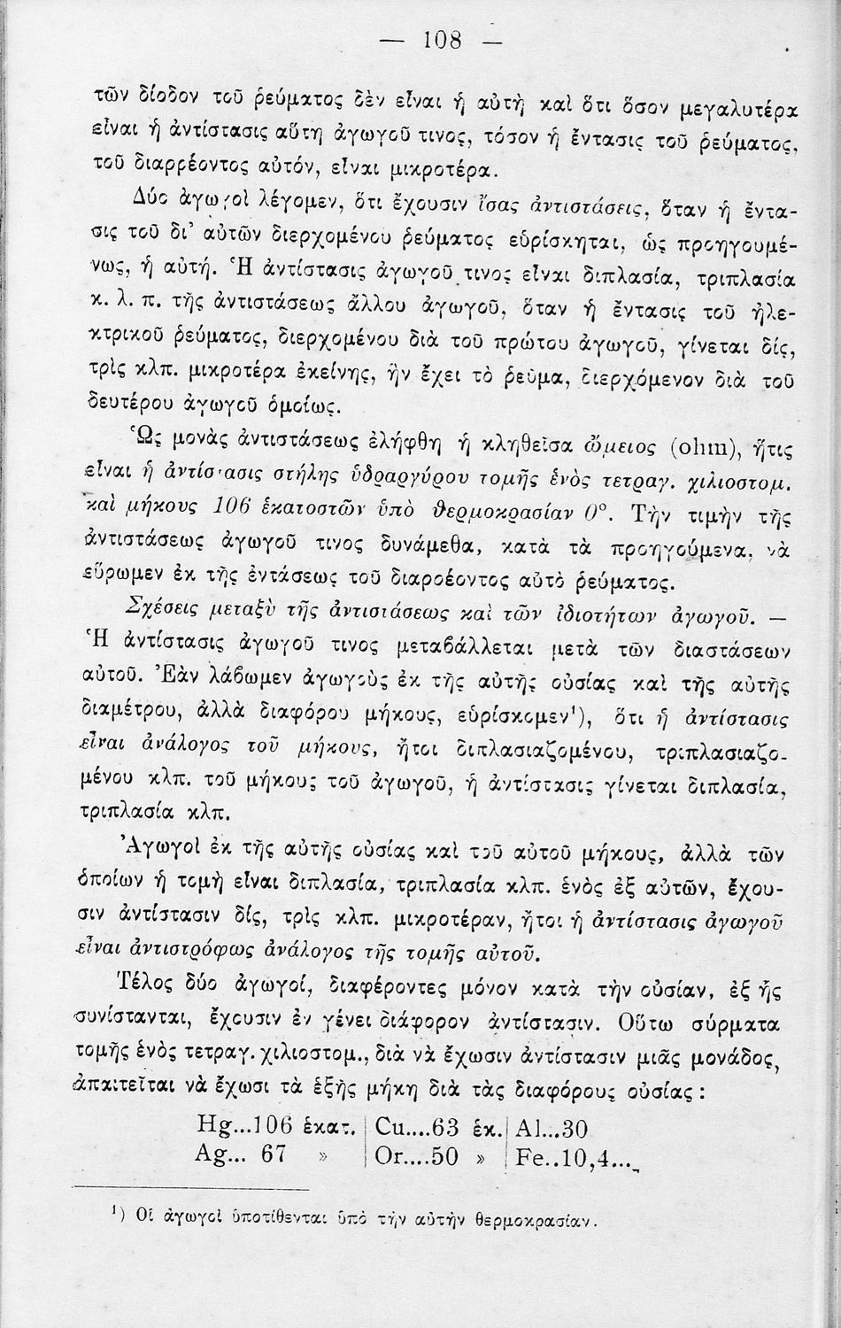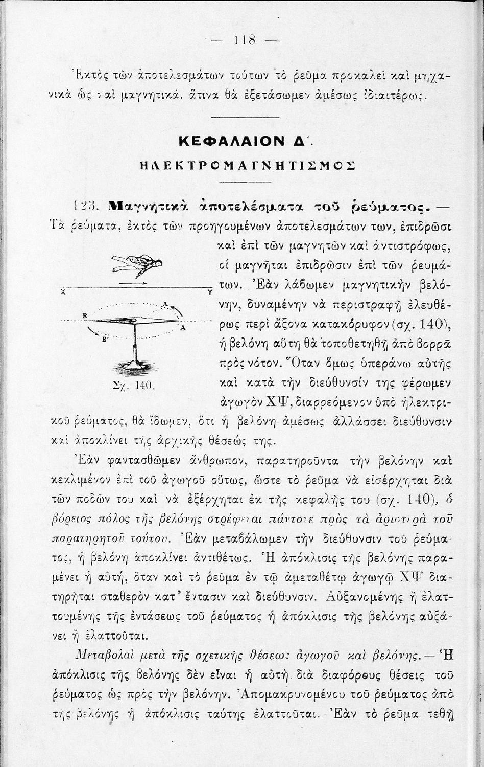 Βαθμίδα εκπαίδευσης: Δευτεροβάθμια Τάξη: Δ' Γυμνασίου Μάθημα: Φυσική Γλώσσα: Καθαρεύουσα Παρουσίαση περιεχομένου: Σχολικό εγχειρίδιο της Δ΄ Γυμνασίου για το μάθημα της Φυσικής. Παρέχει βασικές γνώσεις της φυσικής επιστήμης και της χημείας. Αναλύει τις ιδιότητες των σωμάτων, καθώς και της θερμότητας, του ηλεκτρισμού και του μαγνητισμού, την υδροστατική, την βαρύτητα και την αεροστατική. Αναφέρει πολλά από τα όργανα, που χρησιμοποιούνται στη φυσική, καθώς και τις πρακτικές εφαρμογές της επιστήμης στην καθημερινότητα. Περιέχει εικόνες και σχεδιαγράμματα τα οποία βοηθούν τη διδασκαλία. |