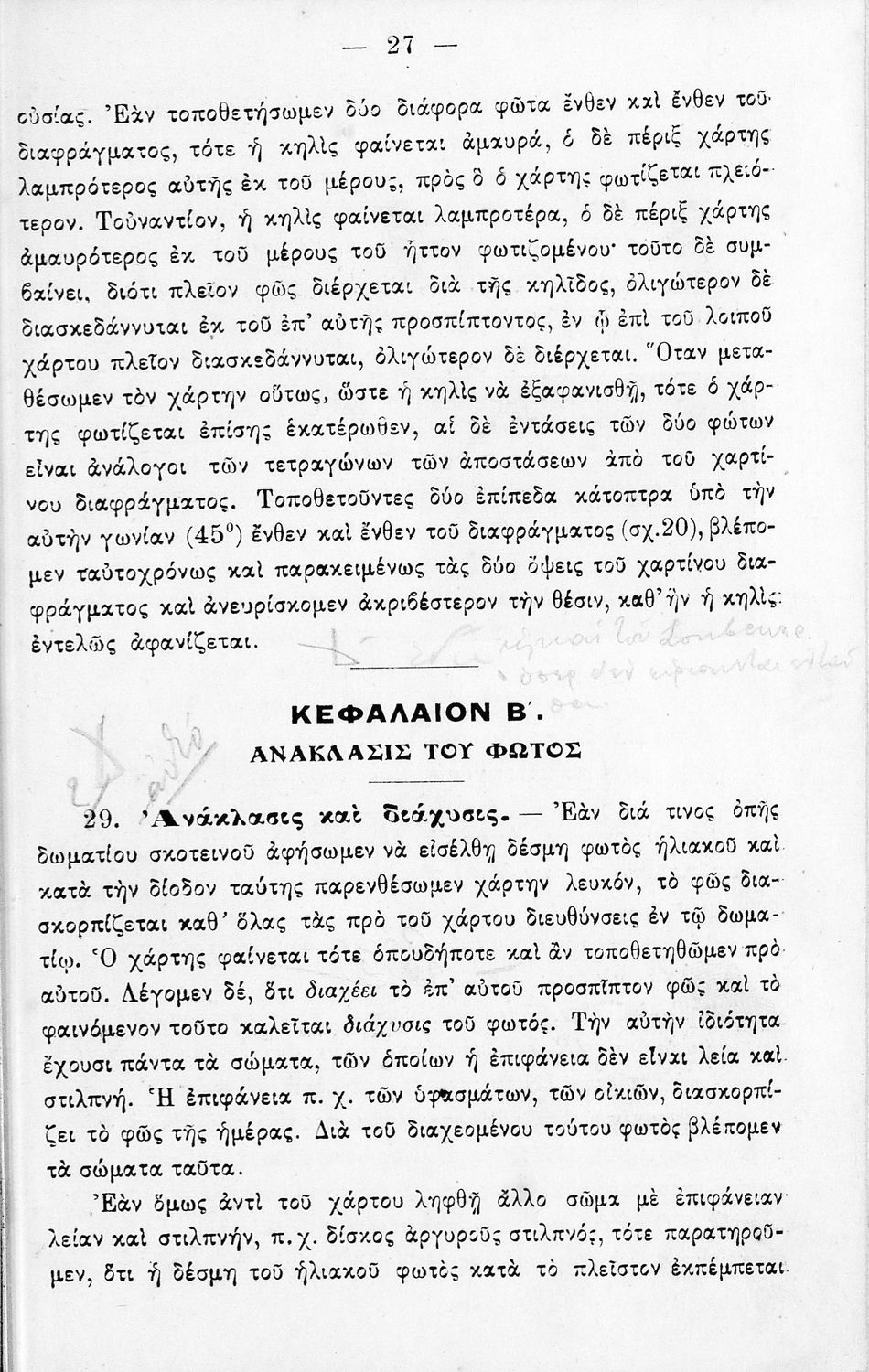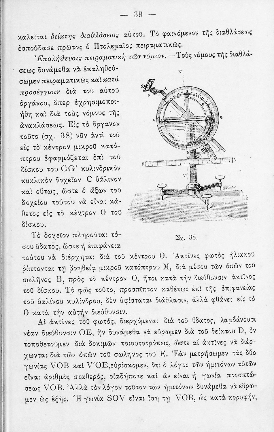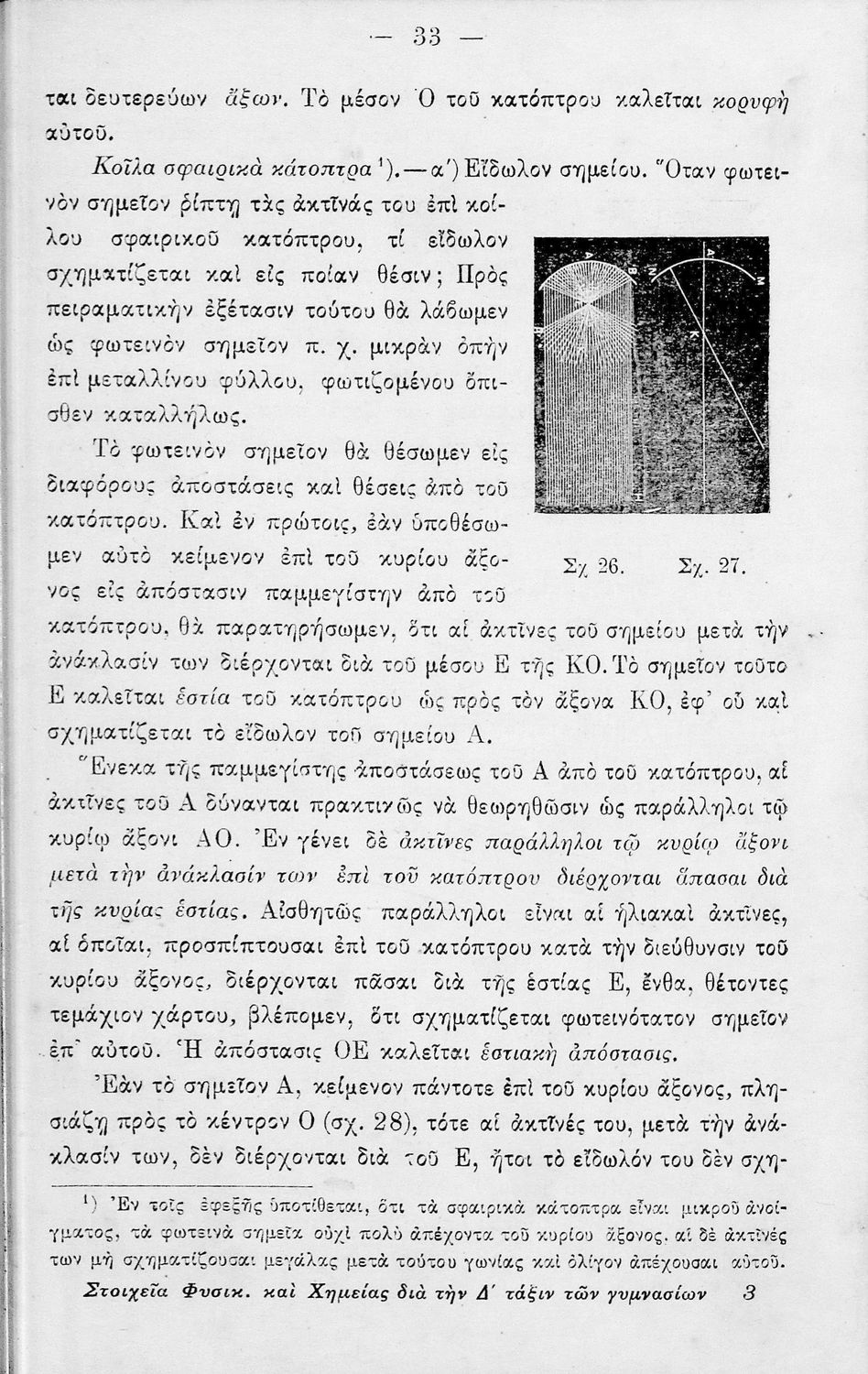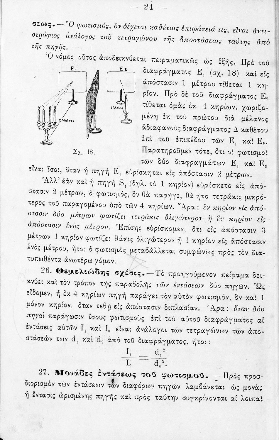 Βαθμίδα εκπαίδευσης: Δευτεροβάθμια Τάξη: Δ' Γυμνασίου Μάθημα: Φυσική Γλώσσα: Καθαρεύουσα Παρουσίαση περιεχομένου: Σχολικό εγχειρίδιο της Δ΄ Γυμνασίου για το μάθημα της Φυσικής. Παρέχει βασικές γνώσεις της φυσικής επιστήμης και της χημείας. Αναλύει τις ιδιότητες των σωμάτων, καθώς και της θερμότητας, του ηλεκτρισμού και του μαγνητισμού, την υδροστατική, την βαρύτητα και την αεροστατική. Αναφέρει πολλά από τα όργανα, που χρησιμοποιούνται στη φυσική, καθώς και τις πρακτικές εφαρμογές της επιστήμης στην καθημερινότητα. Περιέχει εικόνες και σχεδιαγράμματα τα οποία βοηθούν τη διδασκαλία. |