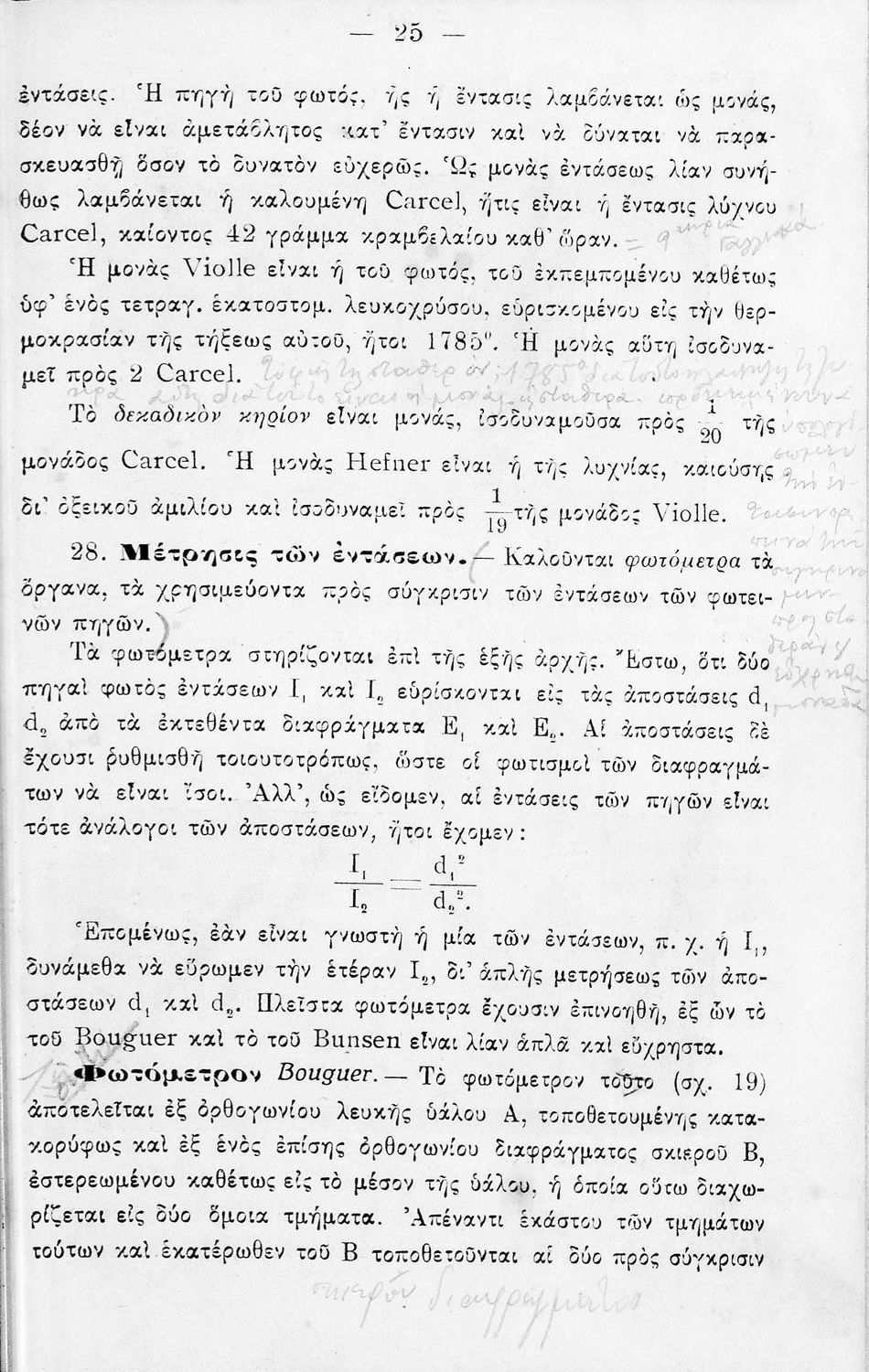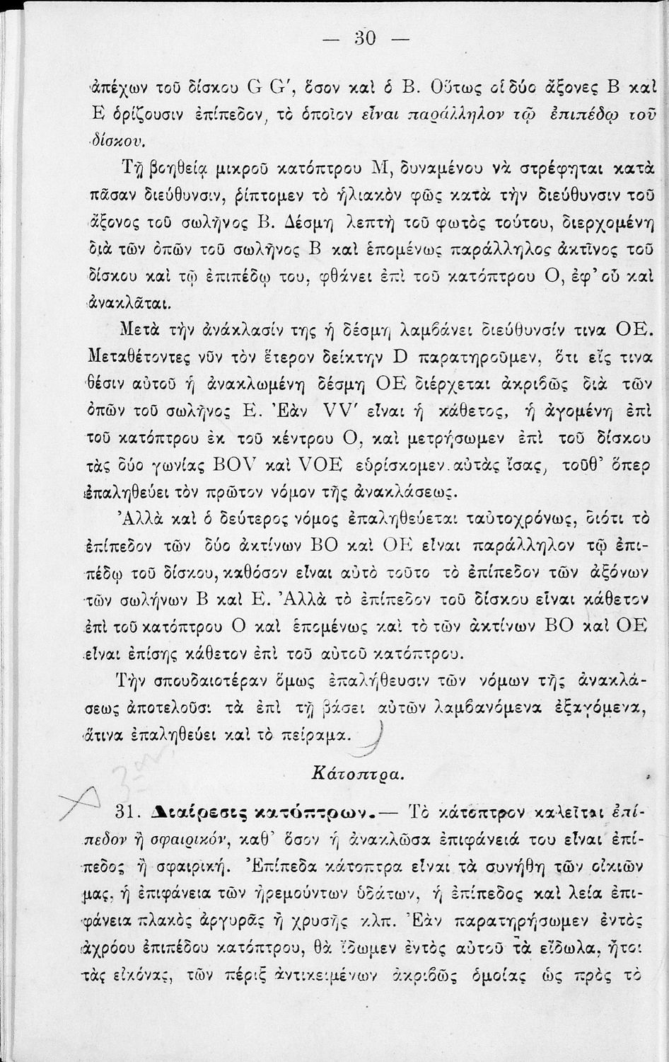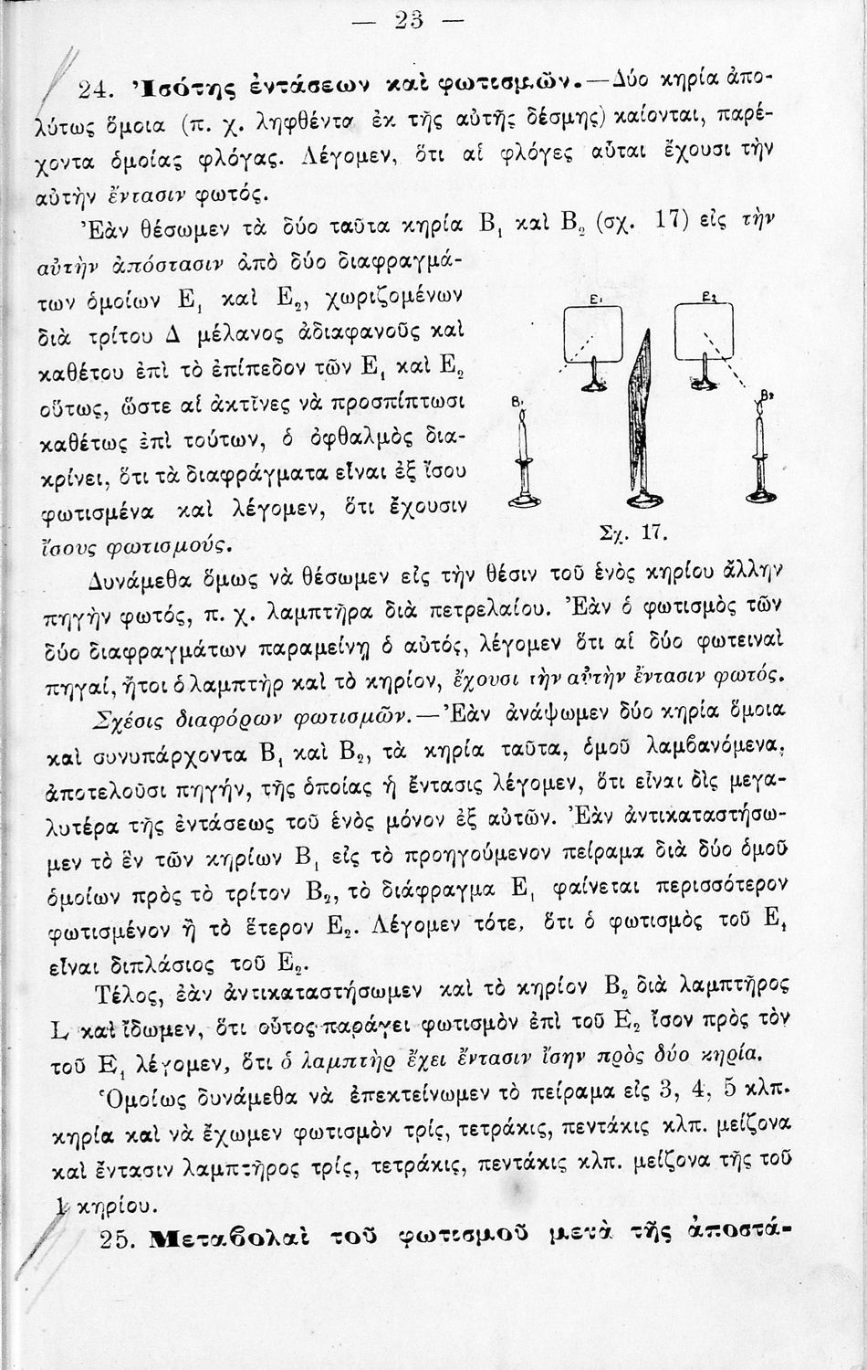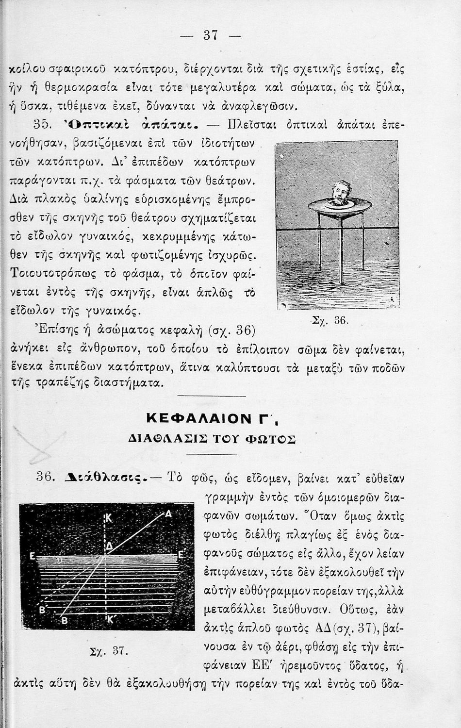 Βαθμίδα εκπαίδευσης: Δευτεροβάθμια Τάξη: Δ' Γυμνασίου Μάθημα: Φυσική Γλώσσα: Καθαρεύουσα Παρουσίαση περιεχομένου: Σχολικό εγχειρίδιο της Δ΄ Γυμνασίου για το μάθημα της Φυσικής. Παρέχει βασικές γνώσεις της φυσικής επιστήμης και της χημείας. Αναλύει τις ιδιότητες των σωμάτων, καθώς και της θερμότητας, του ηλεκτρισμού και του μαγνητισμού, την υδροστατική, την βαρύτητα και την αεροστατική. Αναφέρει πολλά από τα όργανα, που χρησιμοποιούνται στη φυσική, καθώς και τις πρακτικές εφαρμογές της επιστήμης στην καθημερινότητα. Περιέχει εικόνες και σχεδιαγράμματα τα οποία βοηθούν τη διδασκαλία. |