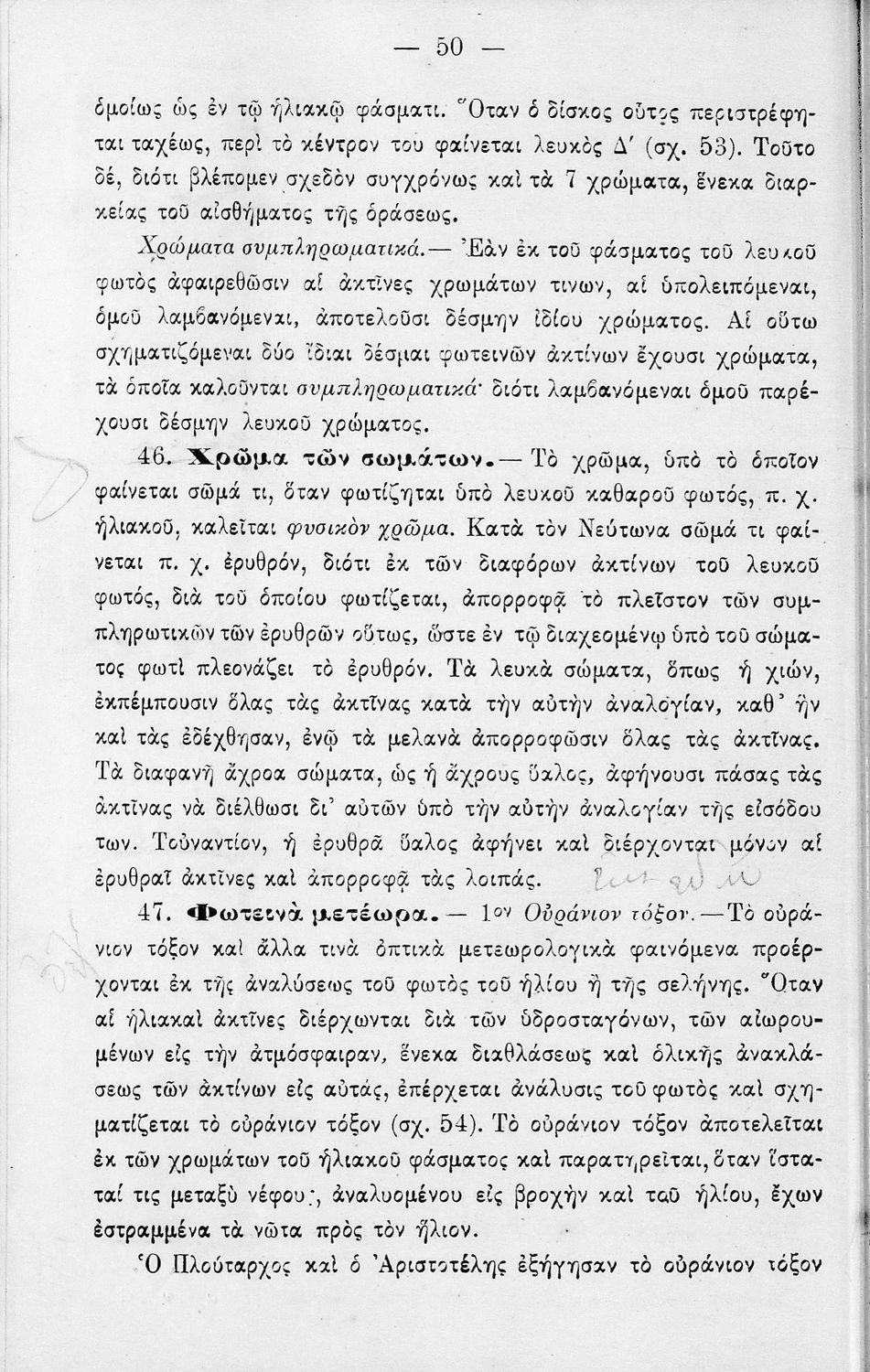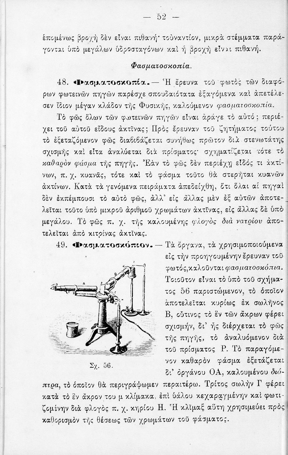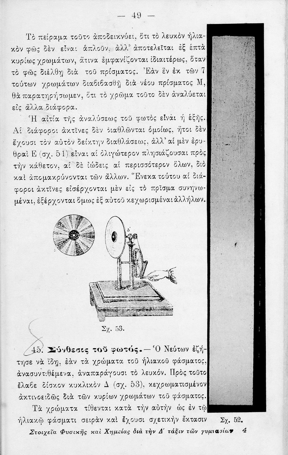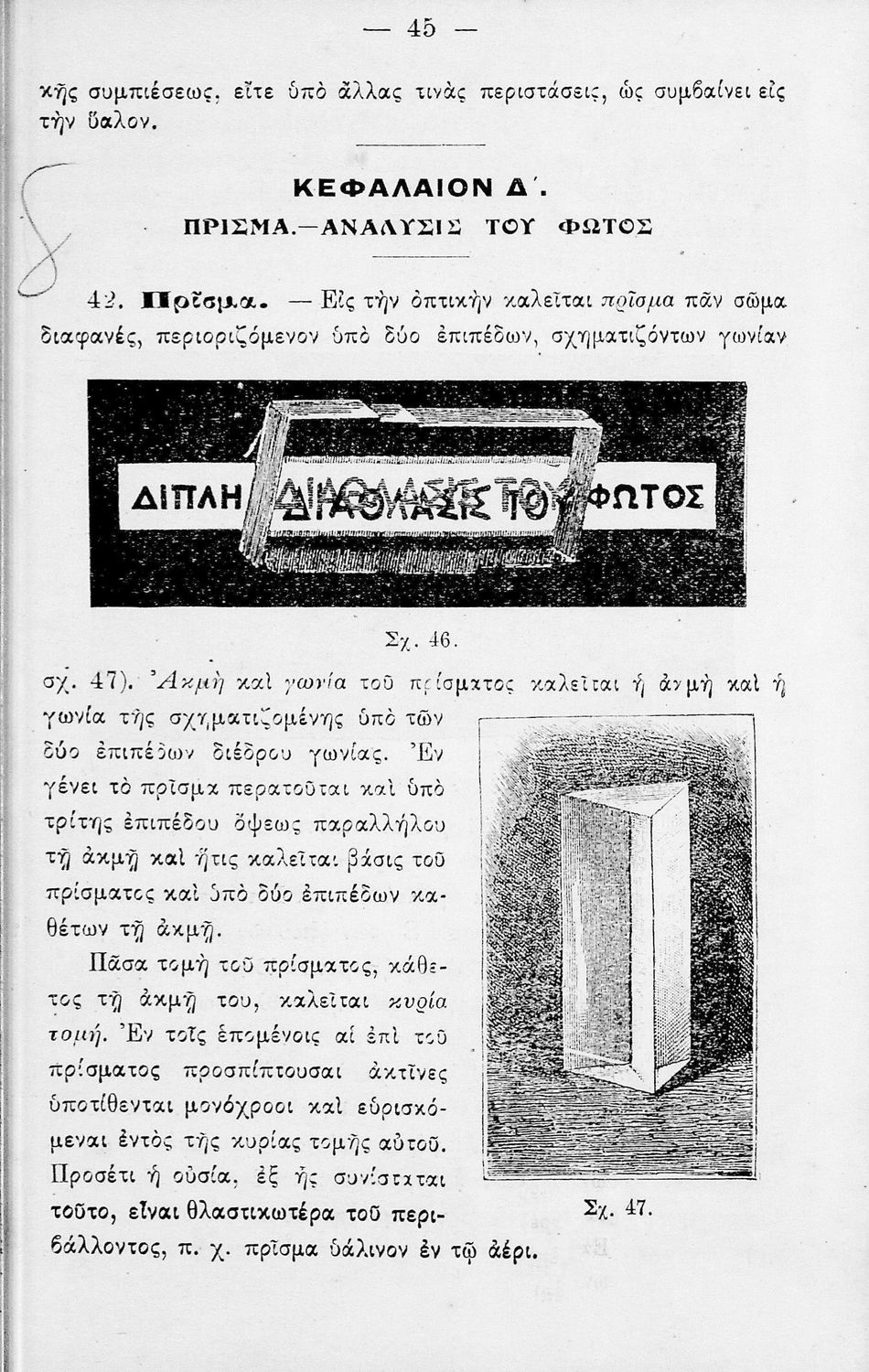 Βαθμίδα εκπαίδευσης: Δευτεροβάθμια Τάξη: Δ' Γυμνασίου Μάθημα: Φυσική Γλώσσα: Καθαρεύουσα Παρουσίαση περιεχομένου: Σχολικό εγχειρίδιο της Δ΄ Γυμνασίου για το μάθημα της Φυσικής. Παρέχει βασικές γνώσεις της φυσικής επιστήμης και της χημείας. Αναλύει τις ιδιότητες των σωμάτων, καθώς και της θερμότητας, του ηλεκτρισμού και του μαγνητισμού, την υδροστατική, την βαρύτητα και την αεροστατική. Αναφέρει πολλά από τα όργανα, που χρησιμοποιούνται στη φυσική, καθώς και τις πρακτικές εφαρμογές της επιστήμης στην καθημερινότητα. Περιέχει εικόνες και σχεδιαγράμματα τα οποία βοηθούν τη διδασκαλία. |
