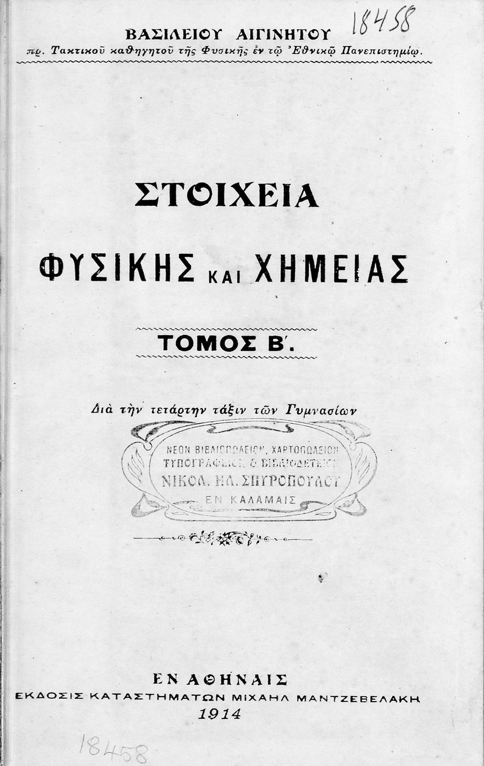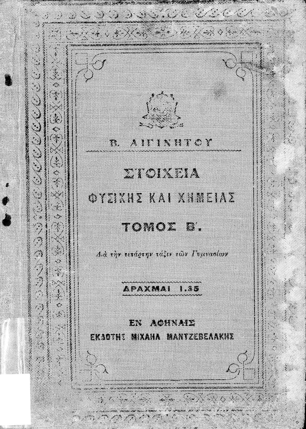 Τίτλος: Στοιχεία Φυσικής και Χημείας τόμος Β΄ δια την Τετάρτη Τάξιν των Γυμνασίων