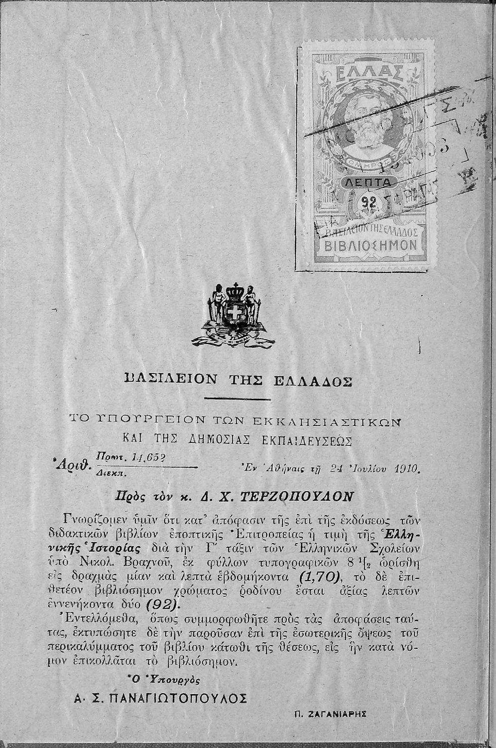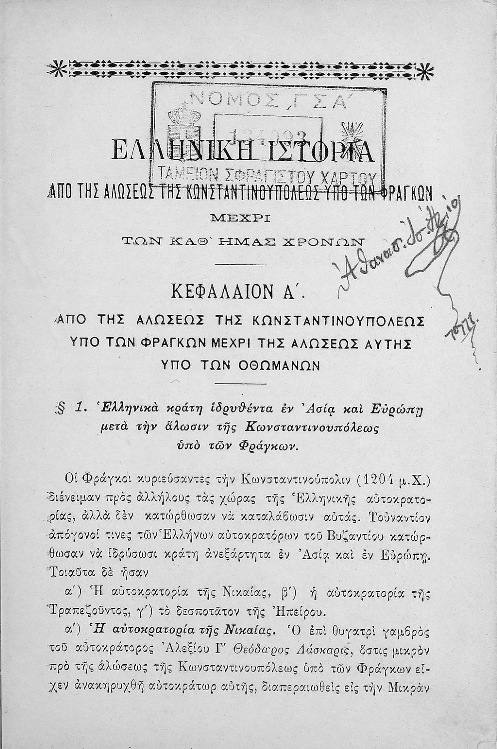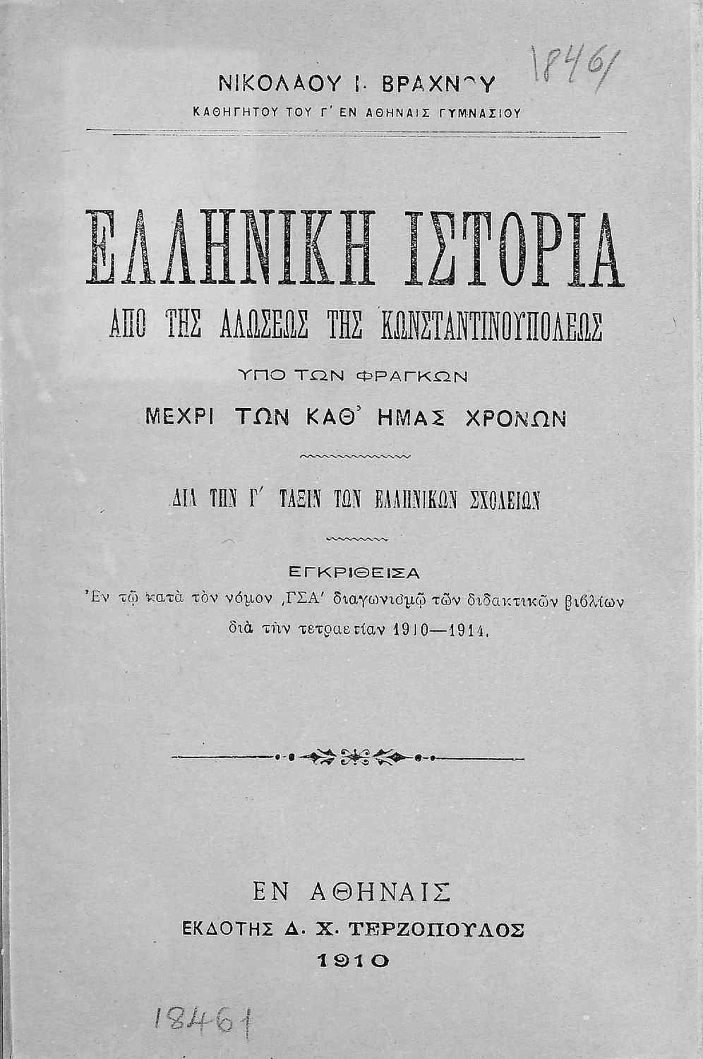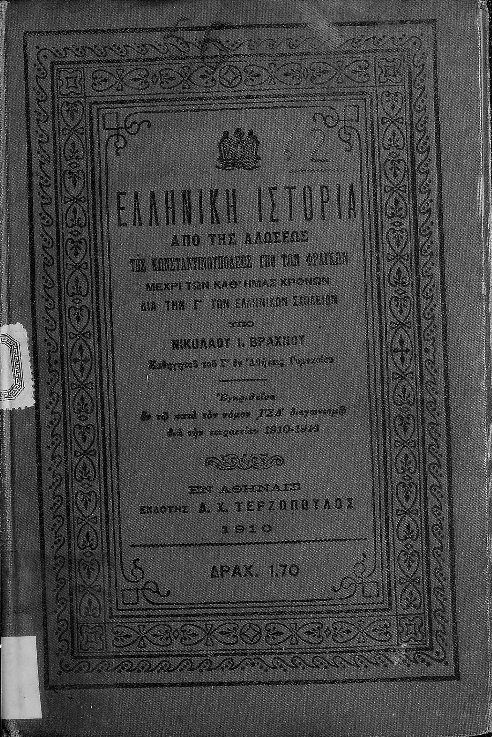 Τίτλος: Ελληνική Ιστορία Από της αλώσεως της Κωνσταντινουπόλεως υπό των Φράγκων μέχρι των καθ΄ ημάς χρόνων δια την Γ΄ Τάξιν των Ελληνικών Σχολείων