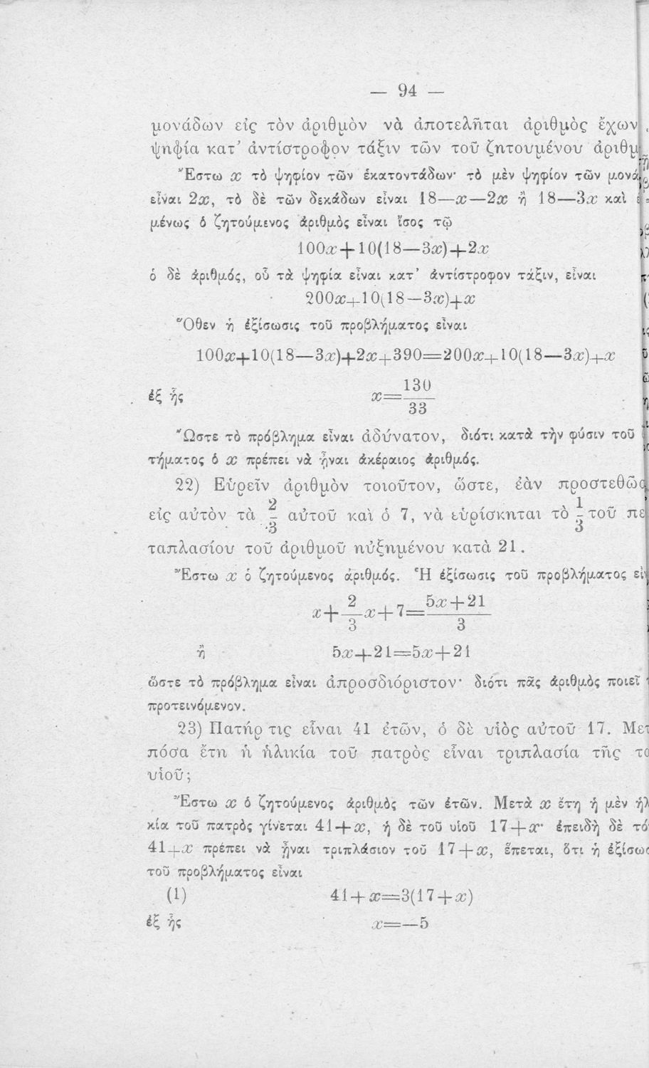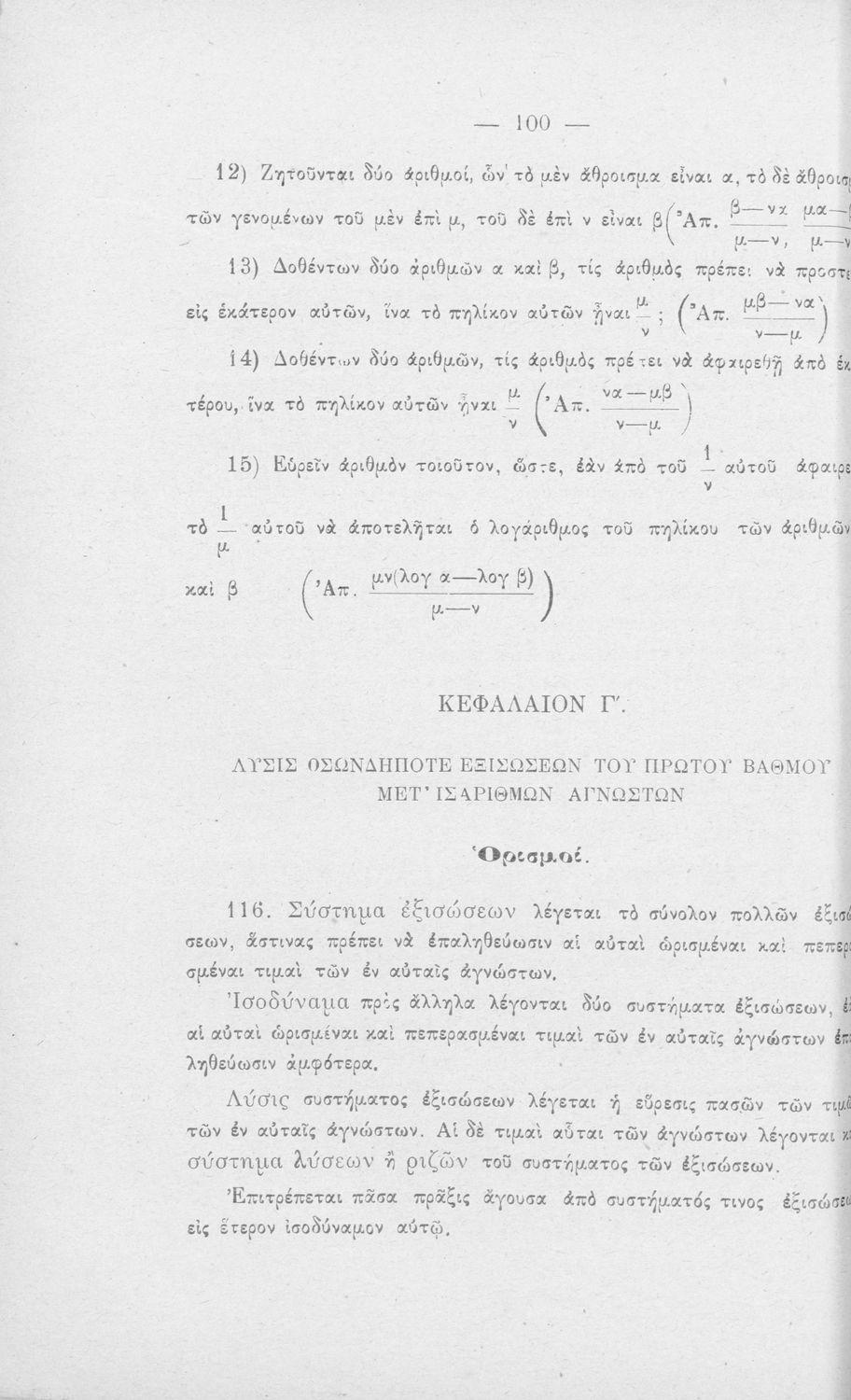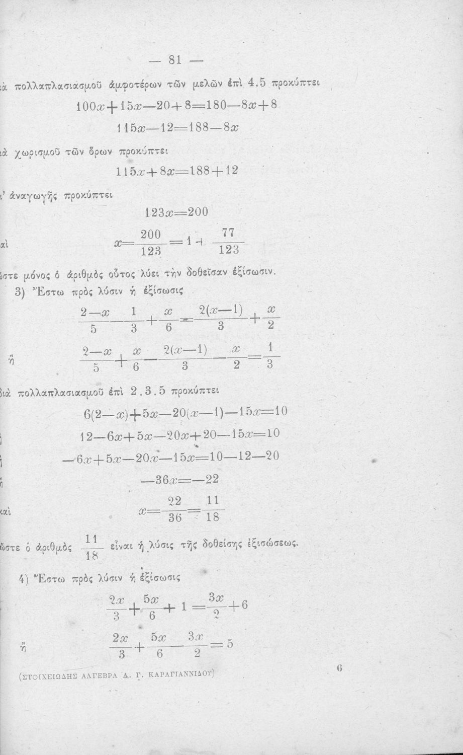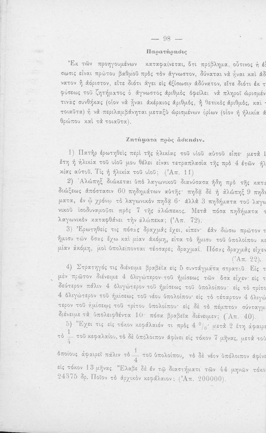 Σχολικό εγχειρίδιο Άλγεβρας Γυμνασίου που περιέχει θεωρία και ασκήσεις. Ο συγγραφέας ήταν υφηγητής στο Εθνικό Πανεπιστήμιο.
