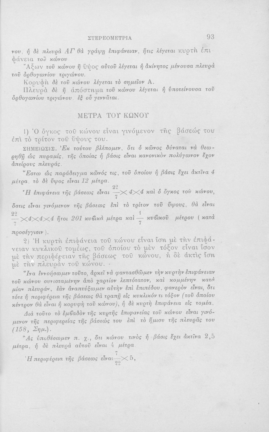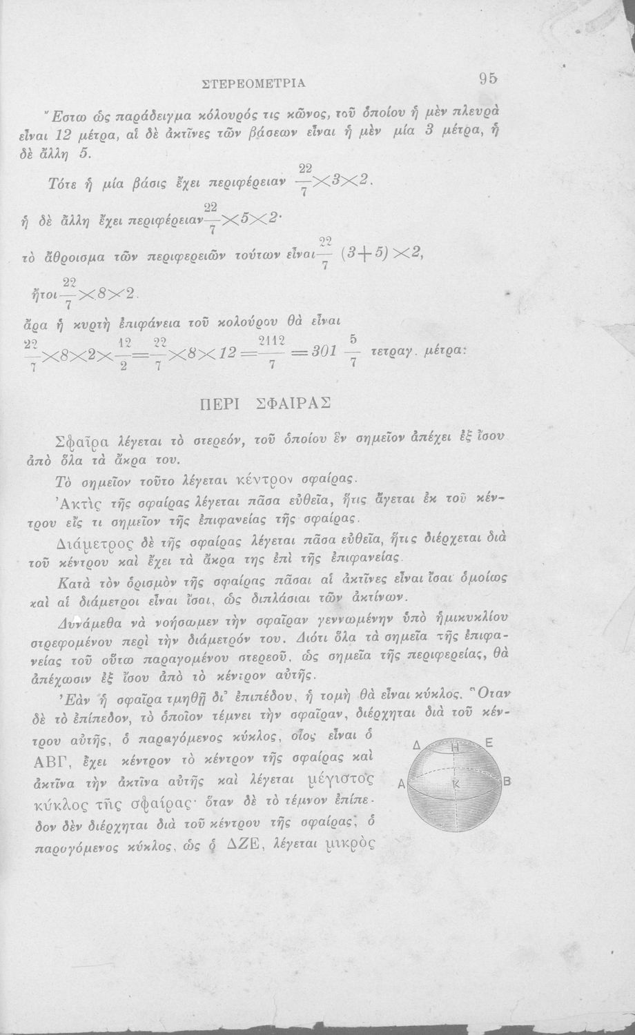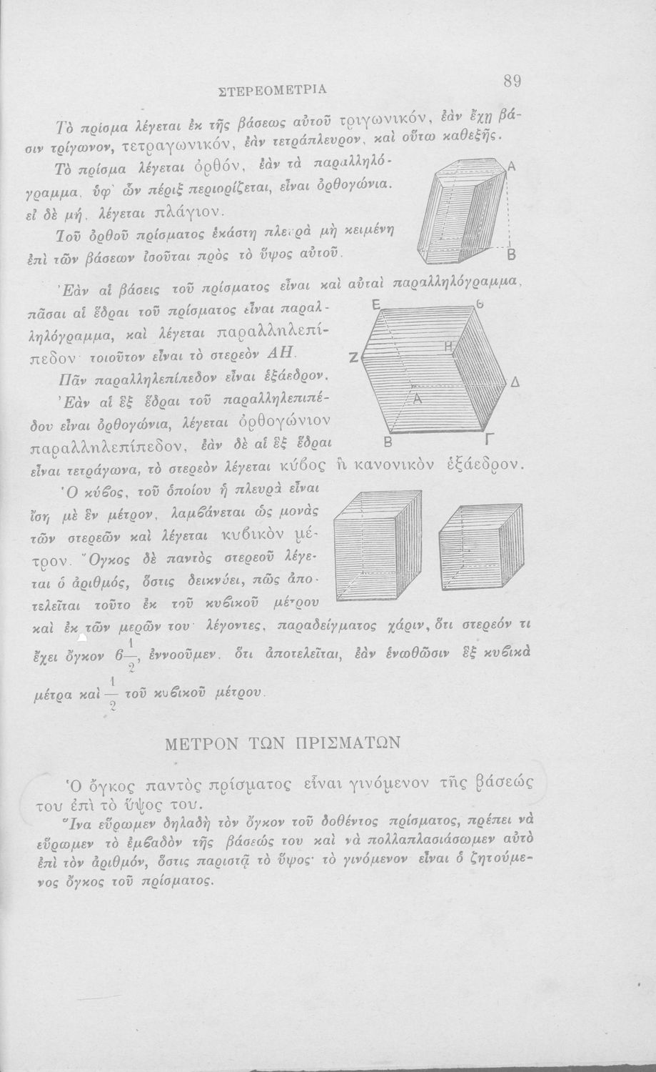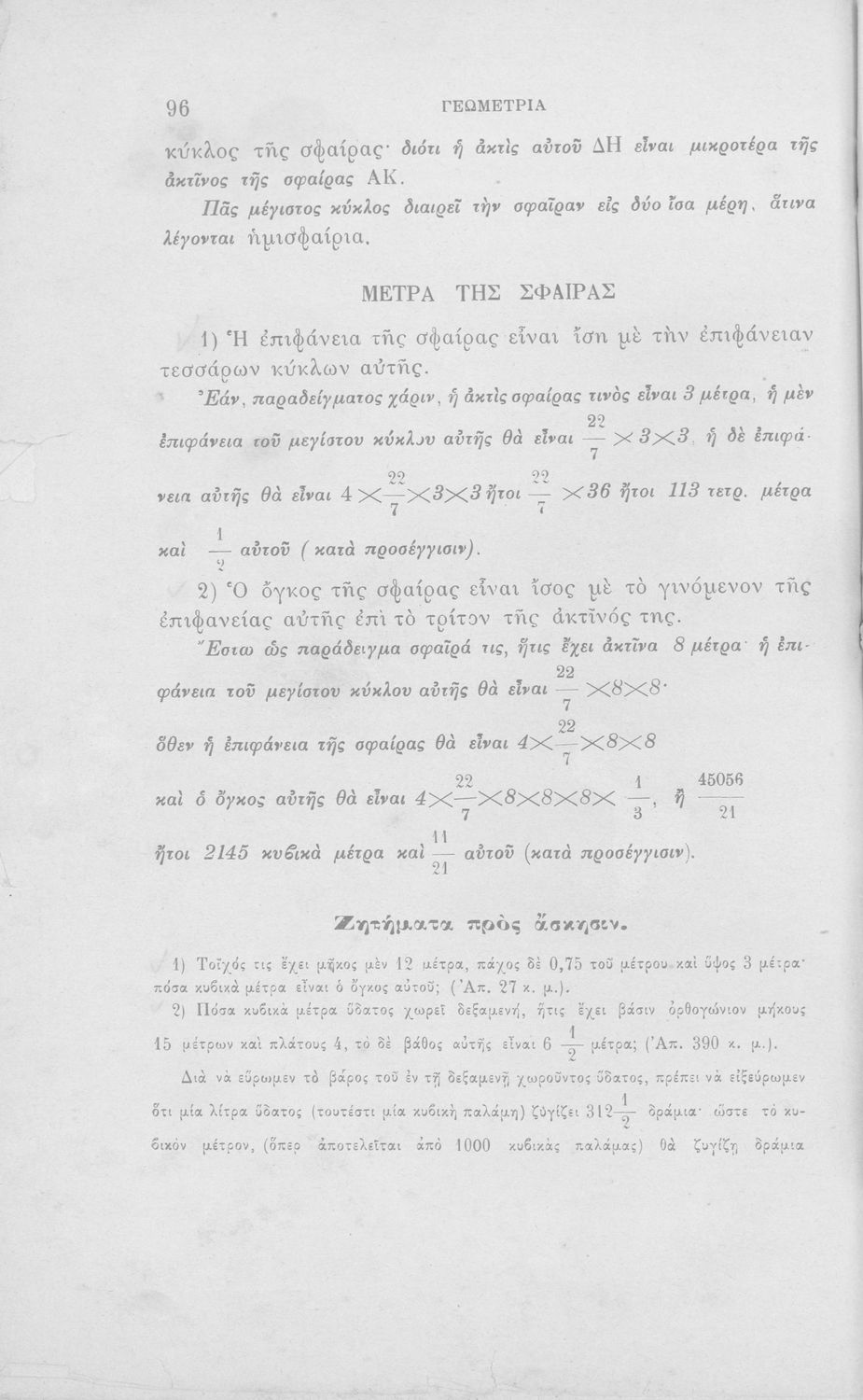 Σχολικό εγχειρίδιο Γεωμετρίας για τα Ελληνικά και Αστικά Σχολεία που περιέχει θεωρία και ασκήσεις και είναι χωρισμένο σε Επιπεδομετρία και Στερεομετρία.