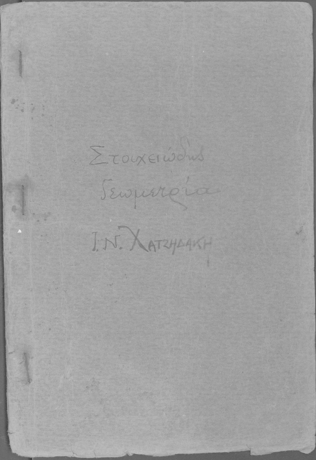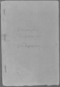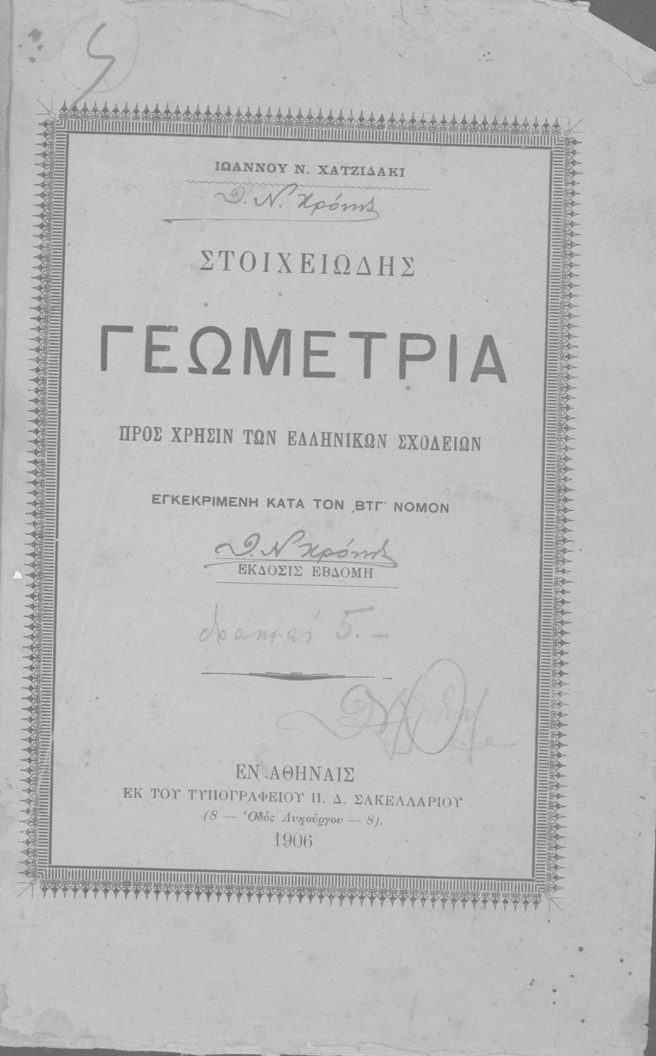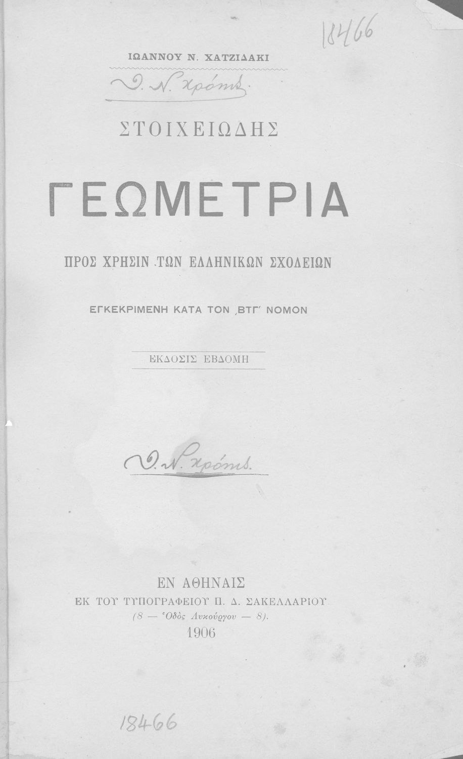 Κωδικός αναγνώρισης: 01-18466 Τίτλος: Στοιχειώδης γεωμετρία προς χρήσιν των Ελληνικών Σχολείων Συγγραφέας: Ιωάννης Ν. Χατζιδάκις Μέγεθος και υπόστρωμα: Σχολικό εγχειρίδιο, 24εκ., μαλακό εξώφυλλο, 98 σελίδες. Σκίτσα (ασπρόμαυρα). |