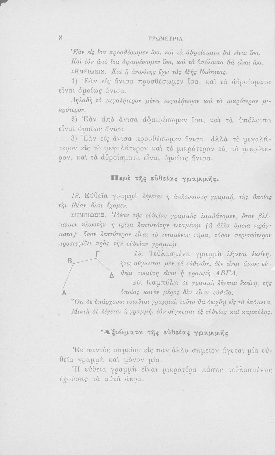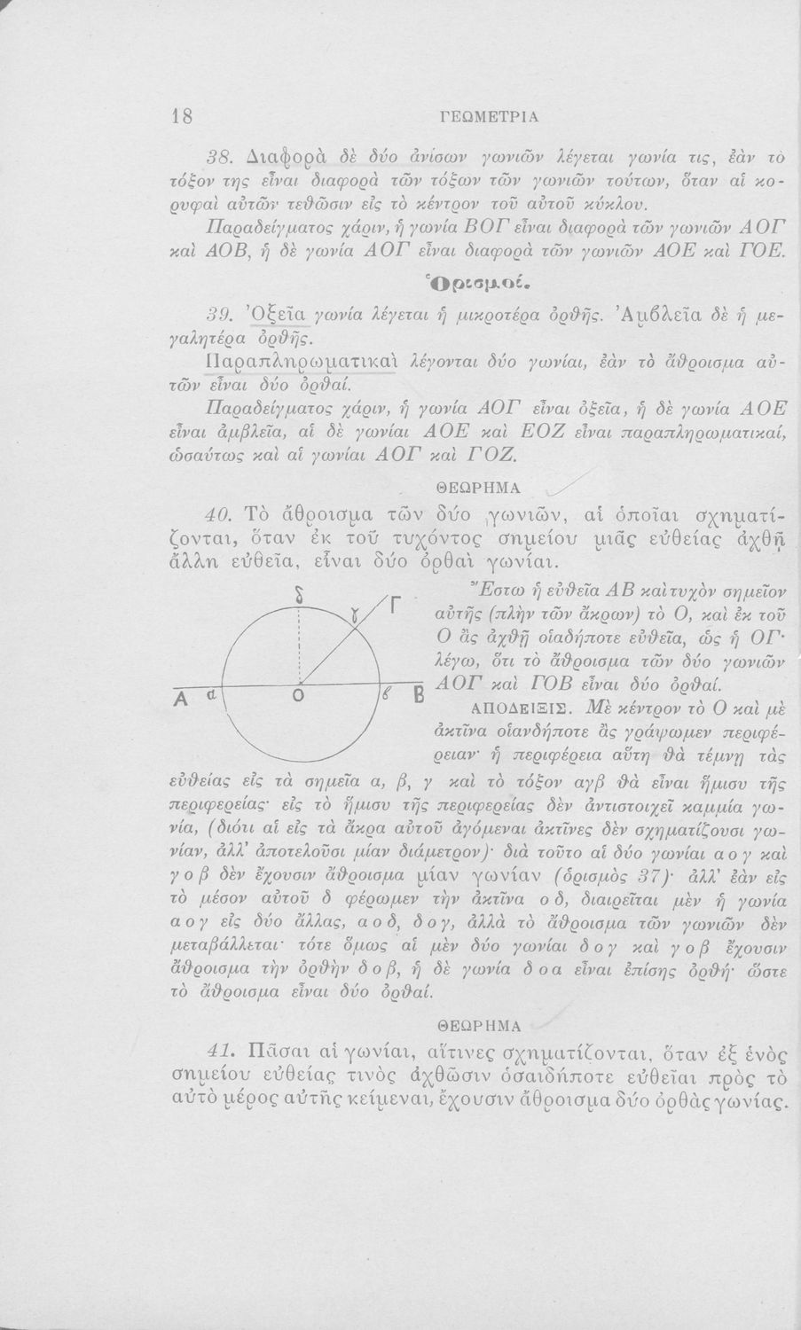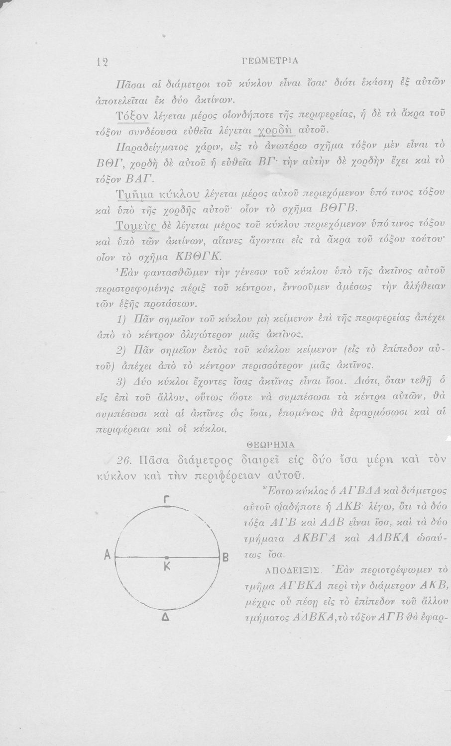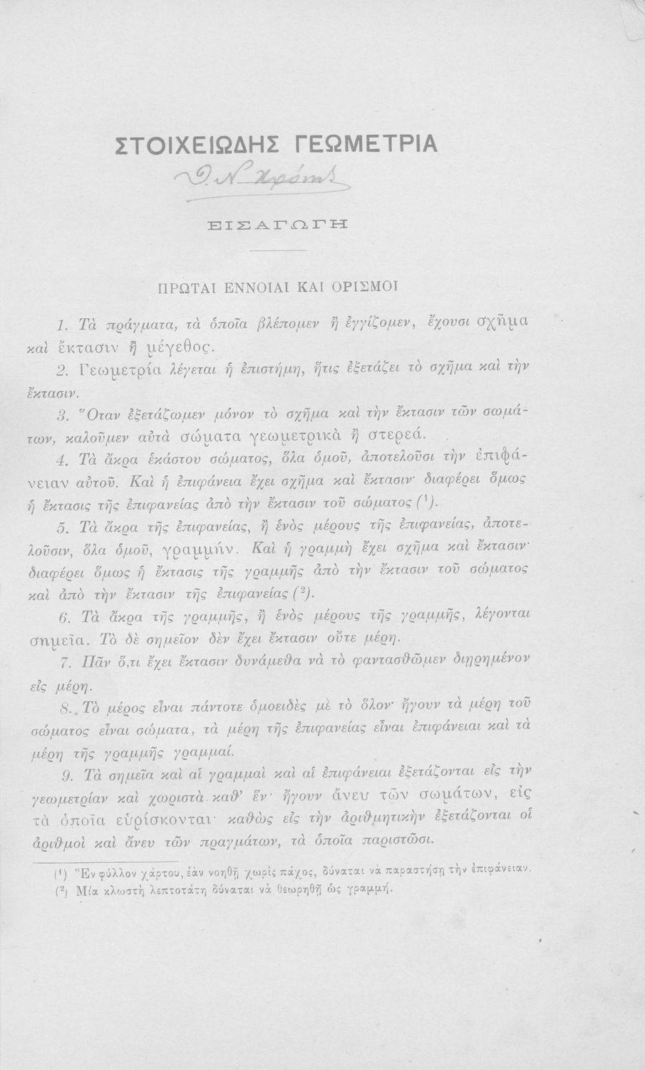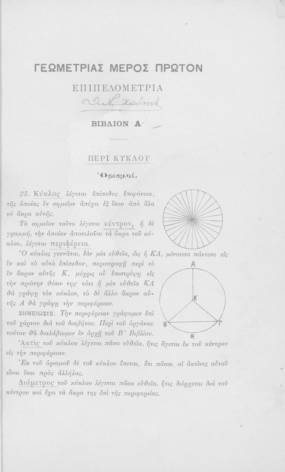 Σχολικό εγχειρίδιο Γεωμετρίας για τα Ελληνικά Σχολεία που είναι χωρισμένο σε θεωρήματα, ορισμούς και ασκήσεις και εστιάζει στην Επιπεδομετρία και τη Στερεομετρία.