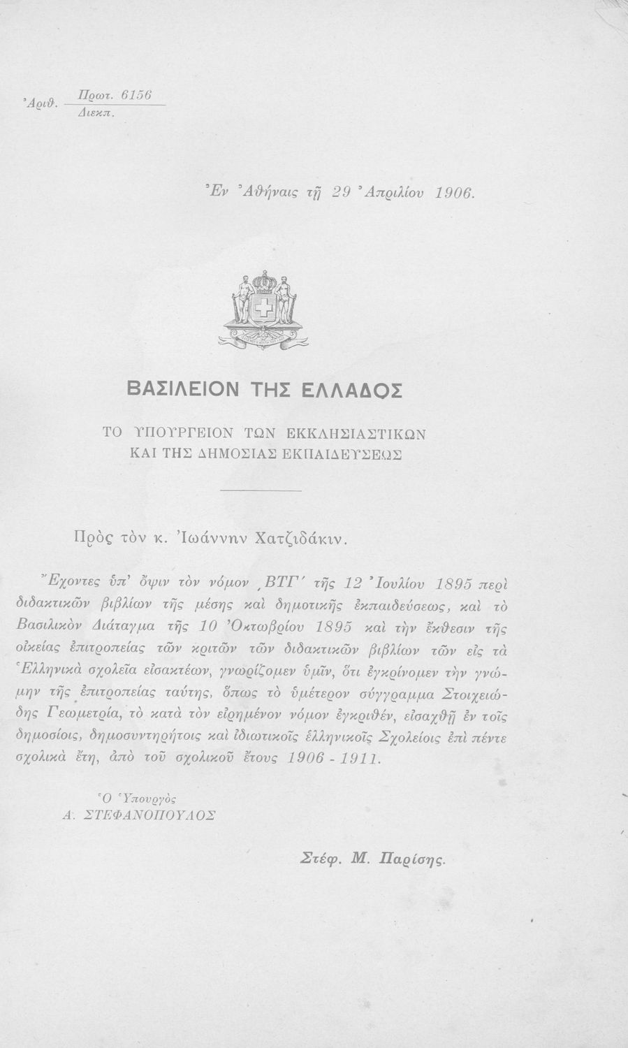 Εκδότης: Π. Δ. Σακελλαρίου Έτος έκδοσης: 1906 Τόπος έκδοσης: Αθήνα Έκδοση: 7η Υπουργική απόφαση / Σύμβαση: 6156/29-4-1906 Έτος έγκρισης: 1906 |