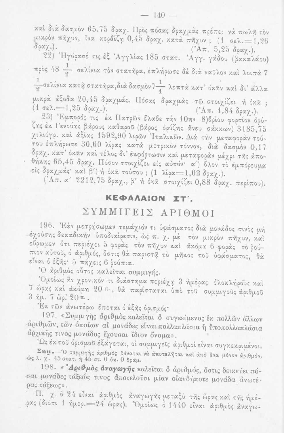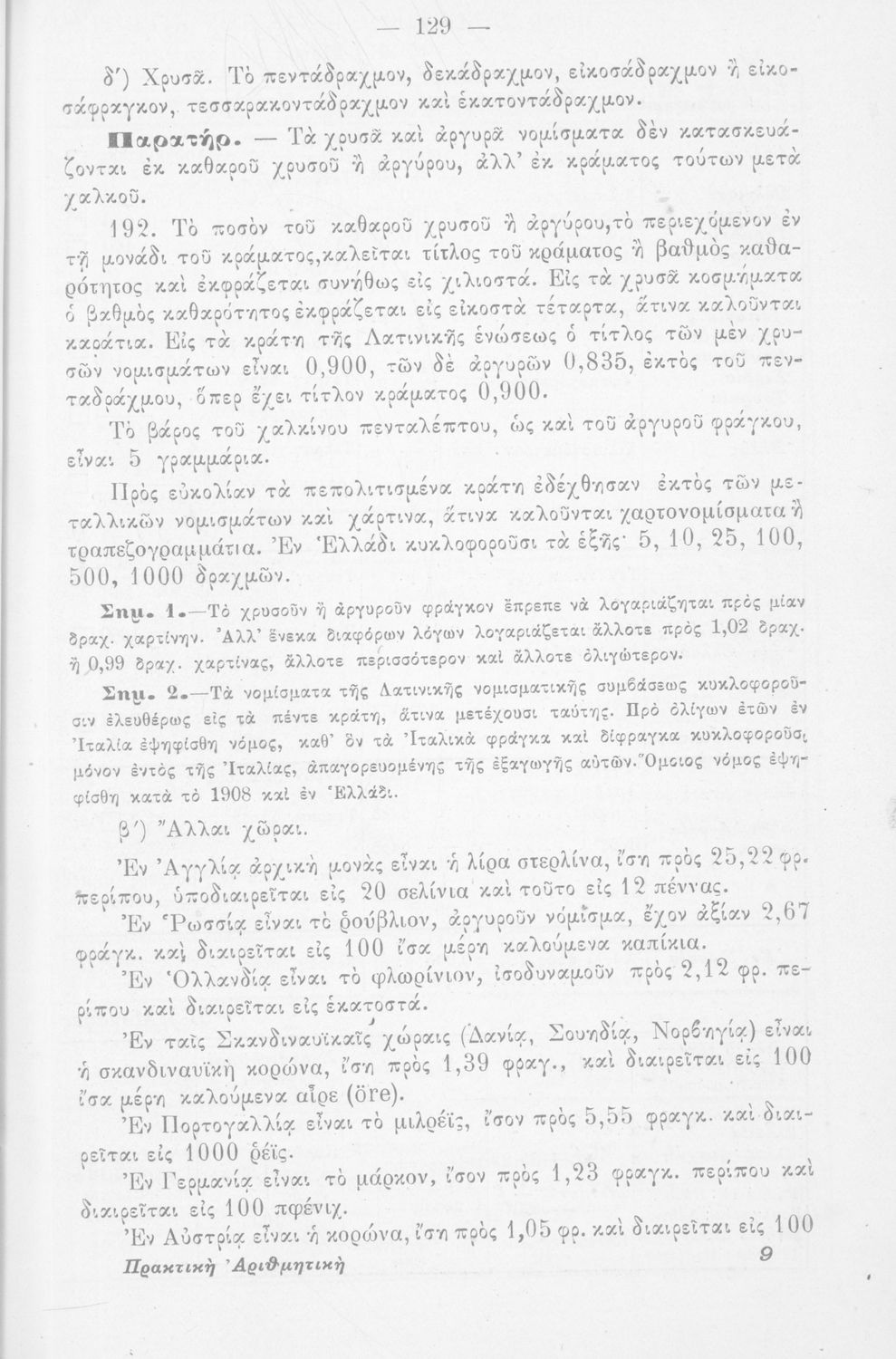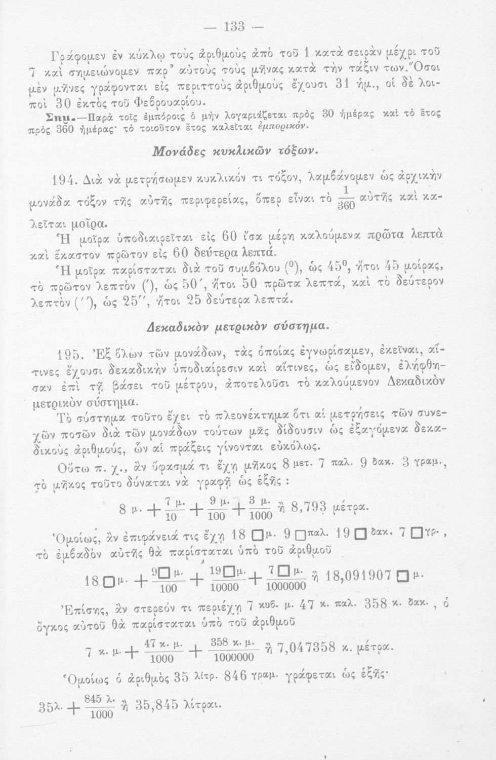 Σχολικό εγχειρίδιο Αριθμητικής για τα Ελληνικά και Αστικά Σχολεία και τα Παρθεναγωγεία που εστιάζει στις αριθμητικές πράξεις, τα κλάσματα, τους δεκαδικούς και συμμιγείς αριθμούς, και τις δυνάμεις. Περιέχει και