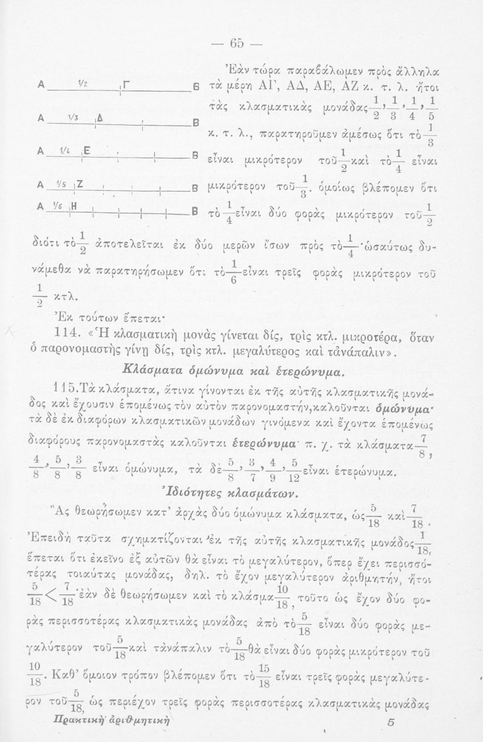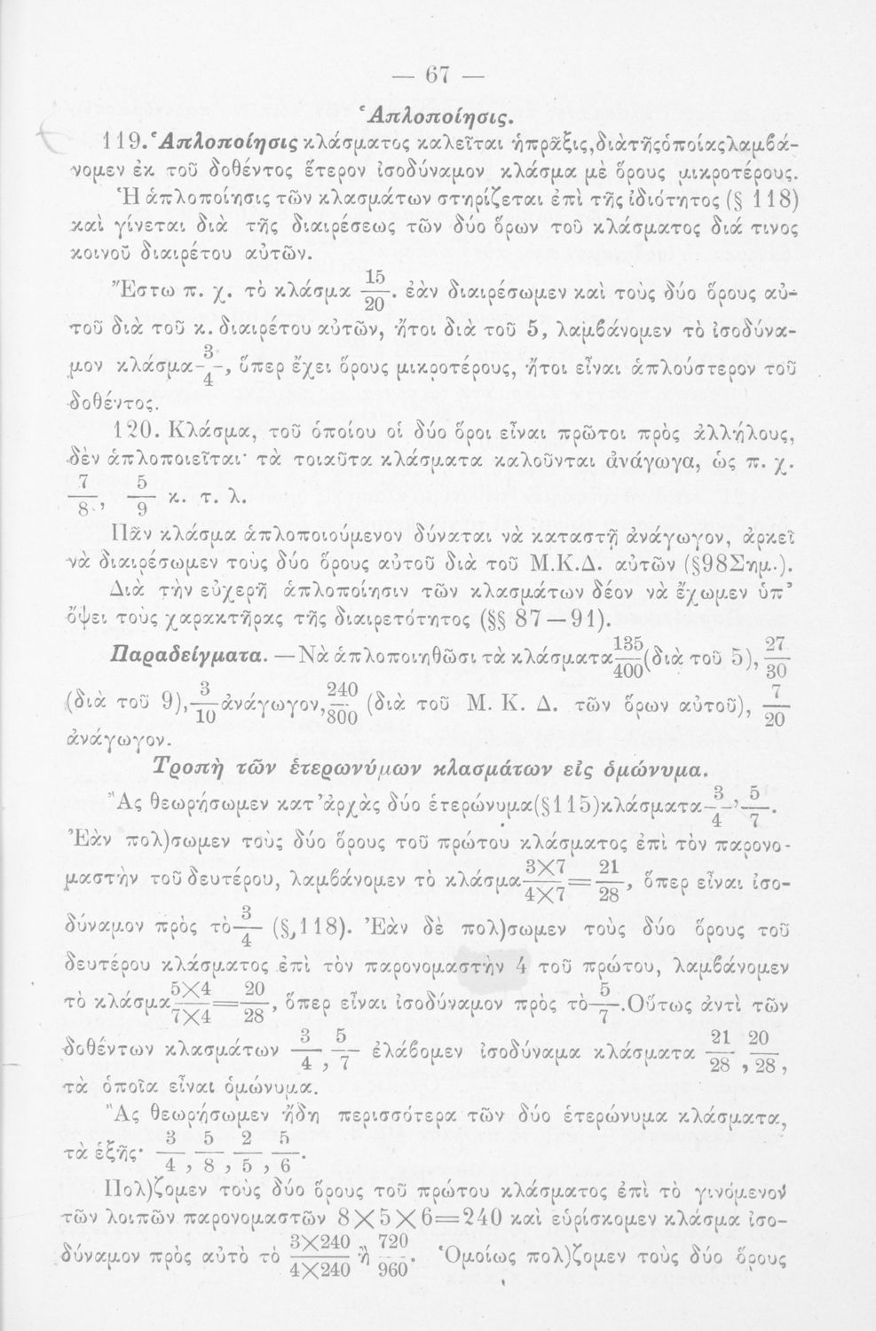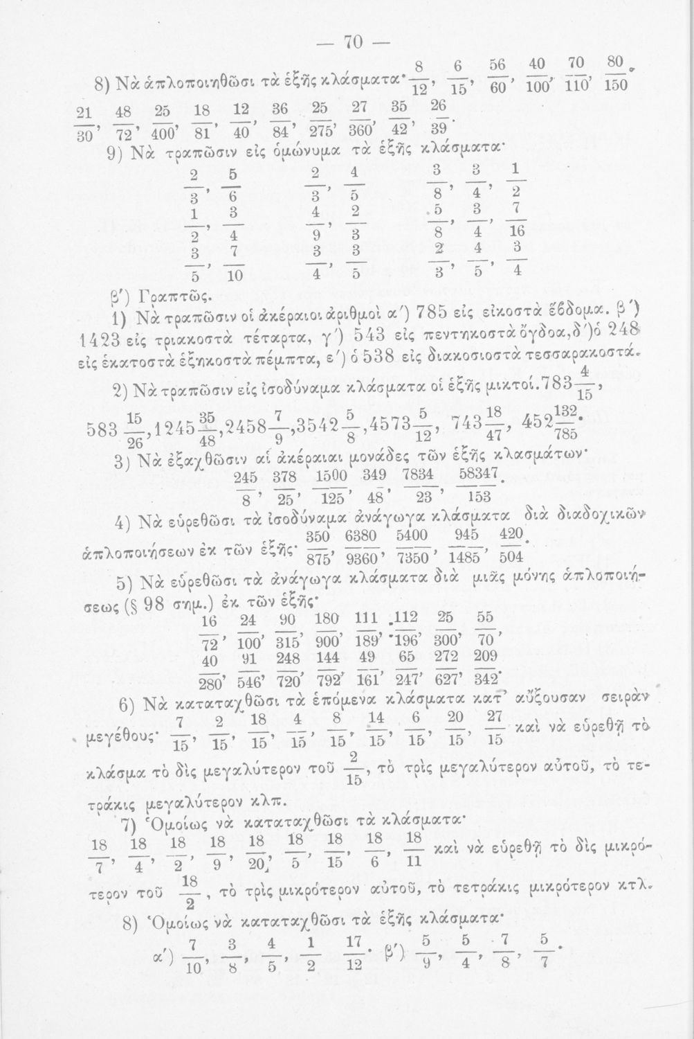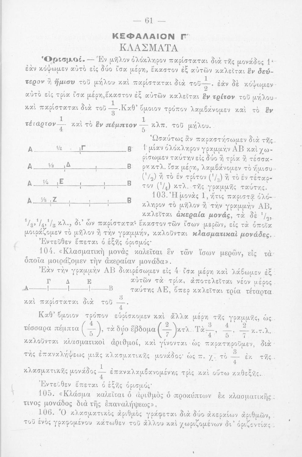 Βαθμίδα εκπαίδευσης: Δευτεροβάθμια Τάξη: Ελληνικό Σχολείο / Παρθεναγωγείο Μάθημα: Μαθηματικά Γλώσσα: Καθαρεύουσα Παρουσίαση περιεχομένου: Σχολικό εγχειρίδιο Αριθμητικής για τα Ελληνικά Σχολεία και Παρθεναγωγεία που περιέχει θεωρία και ασκήσεις και εστιάζει στις αριθμητικές πράξεις και τις ιδιότητές τους. Περιέχει και στοιχεία λογιστικής. |