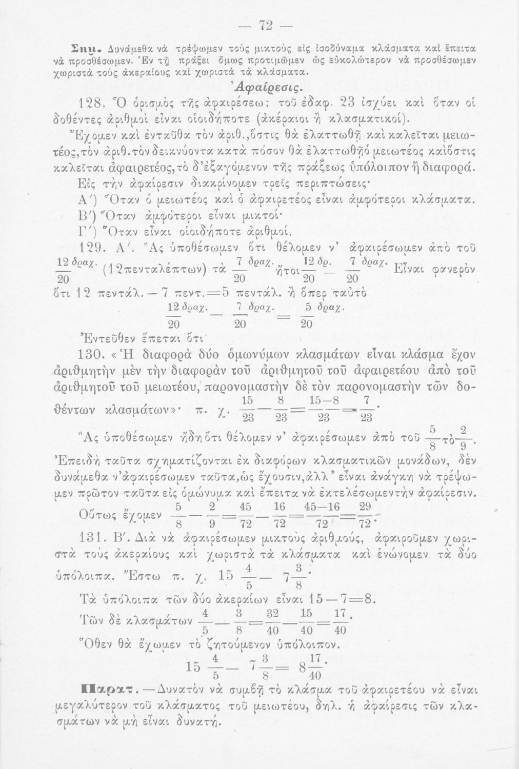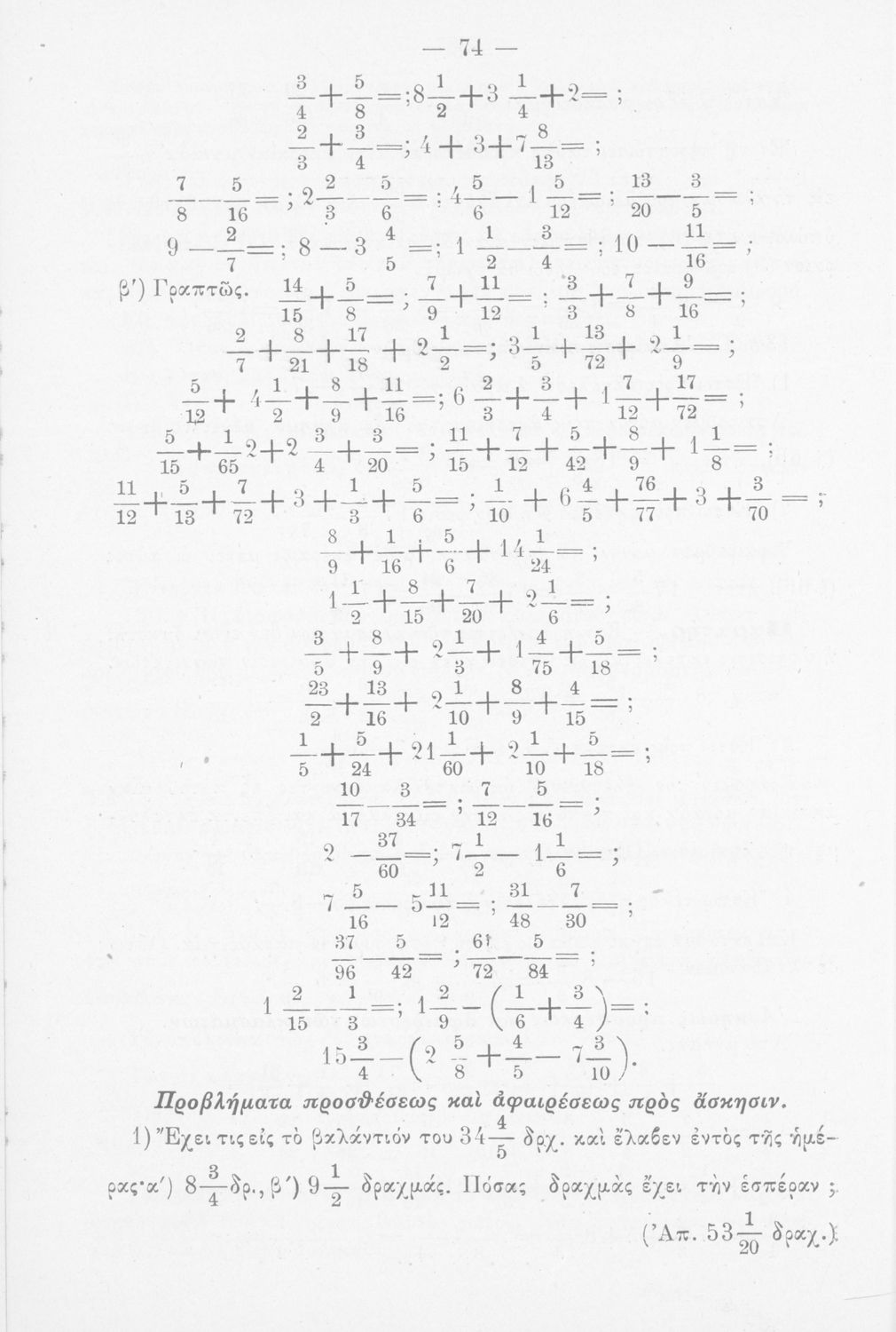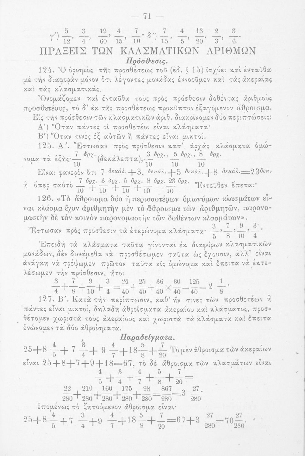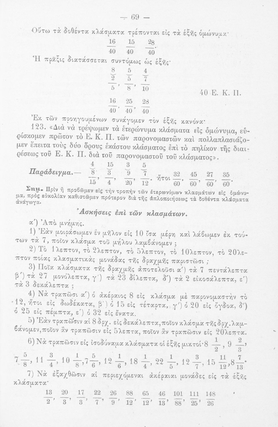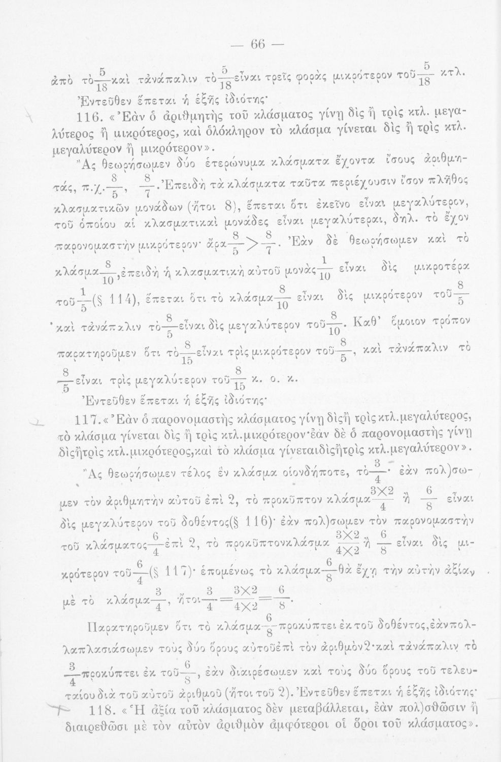 Βαθμίδα εκπαίδευσης: Δευτεροβάθμια Τάξη: Ελληνικό Σχολείο / Παρθεναγωγείο Μάθημα: Μαθηματικά Γλώσσα: Καθαρεύουσα Παρουσίαση περιεχομένου: Σχολικό εγχειρίδιο Αριθμητικής για τα Ελληνικά Σχολεία και Παρθεναγωγεία που περιέχει θεωρία και ασκήσεις και εστιάζει στις αριθμητικές πράξεις και τις ιδιότητές τους. Περιέχει και στοιχεία λογιστικής. |