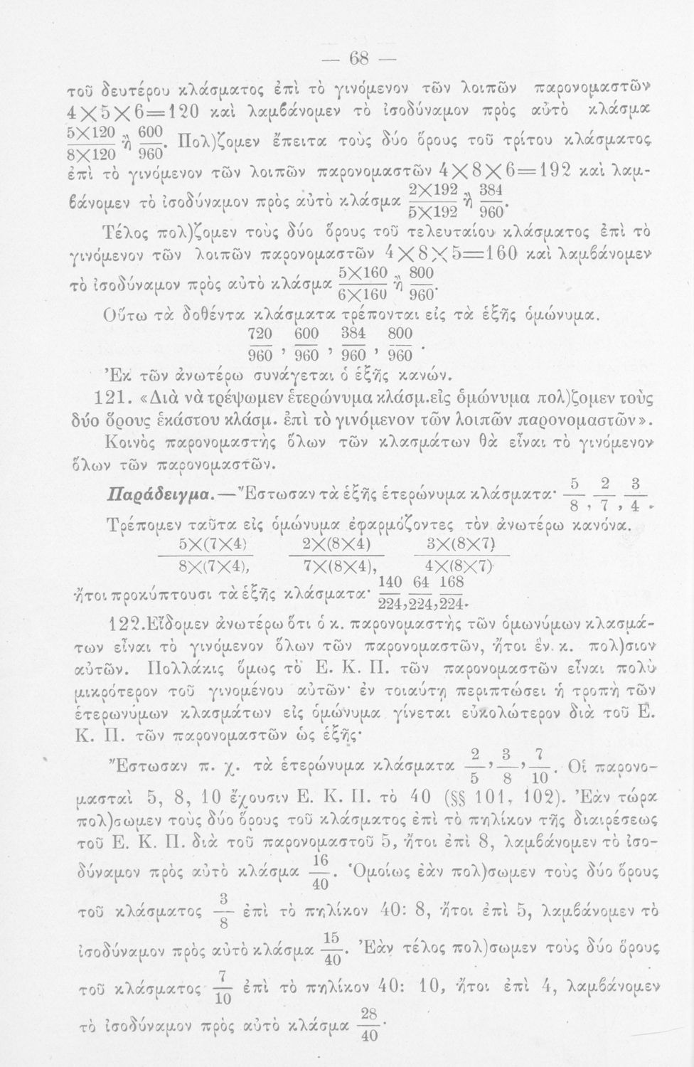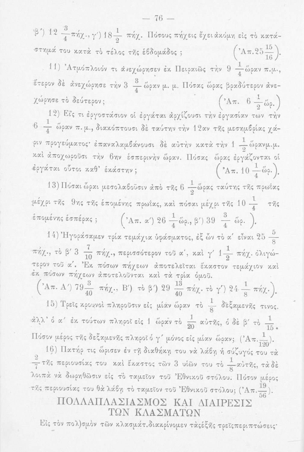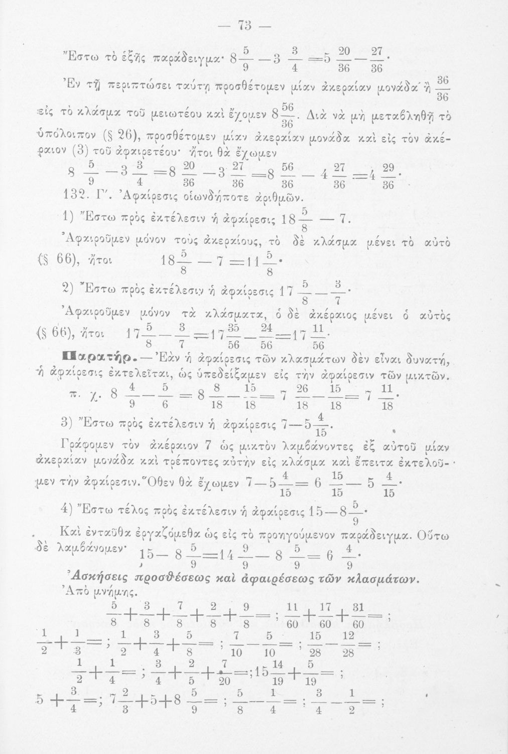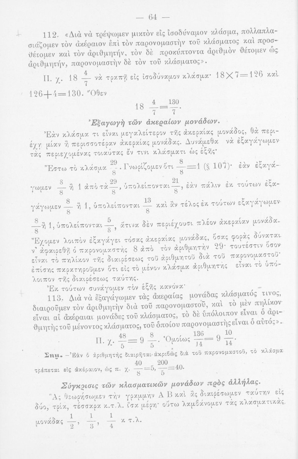 Βαθμίδα εκπαίδευσης: Δευτεροβάθμια Τάξη: Ελληνικό Σχολείο / Παρθεναγωγείο Μάθημα: Μαθηματικά Γλώσσα: Καθαρεύουσα Παρουσίαση περιεχομένου: Σχολικό εγχειρίδιο Αριθμητικής για τα Ελληνικά Σχολεία και Παρθεναγωγεία που περιέχει θεωρία και ασκήσεις και εστιάζει στις αριθμητικές πράξεις και τις ιδιότητές τους. Περιέχει και στοιχεία λογιστικής. |