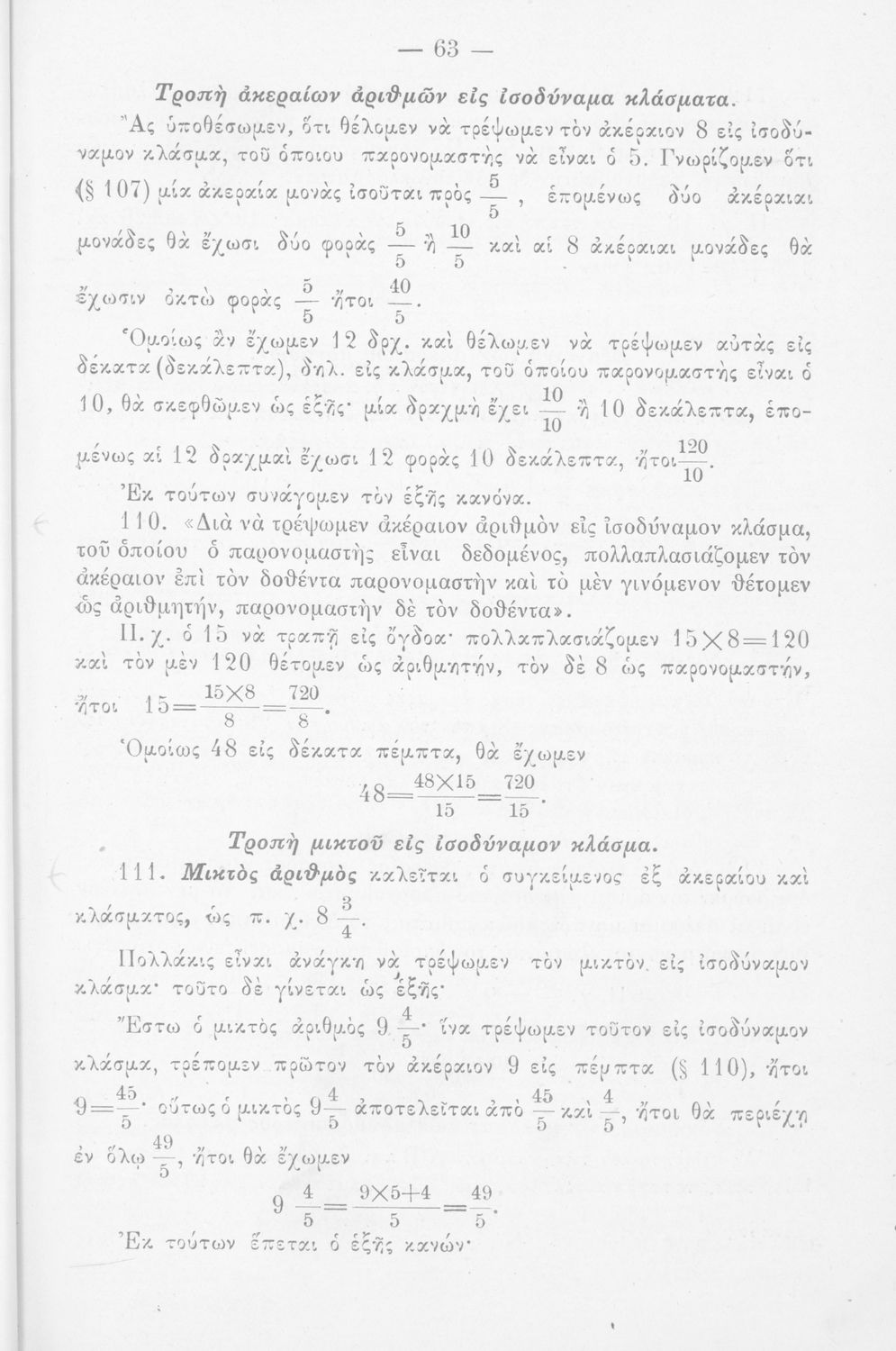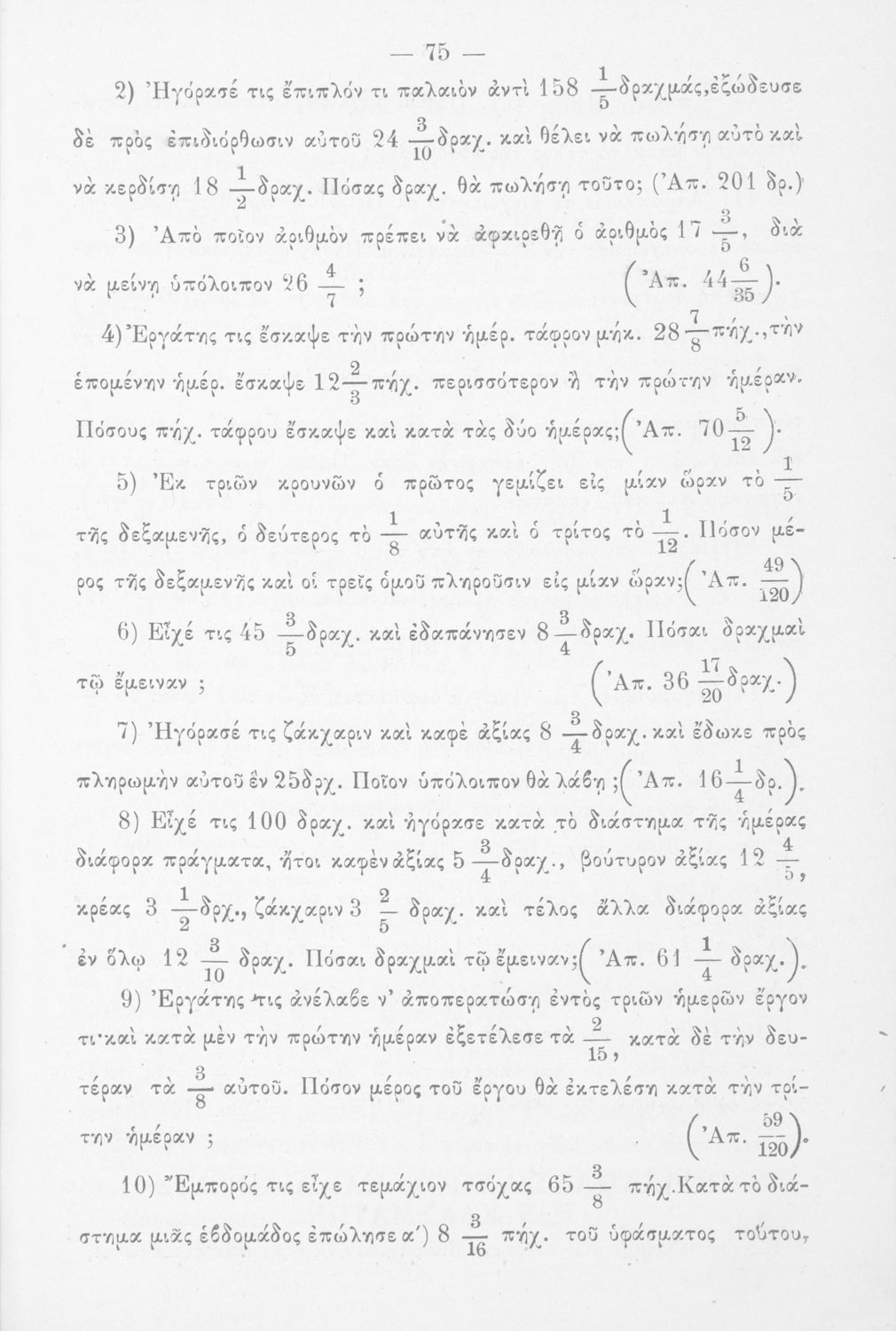 Σχολικό εγχειρίδιο Αριθμητικής για τα Ελληνικά Σχολεία και Παρθεναγωγεία που περιέχει θεωρία και ασκήσεις και εστιάζει στις αριθμητικές πράξεις και τις ιδιότητές τους. Περιέχει και στοιχεία λογιστικής.