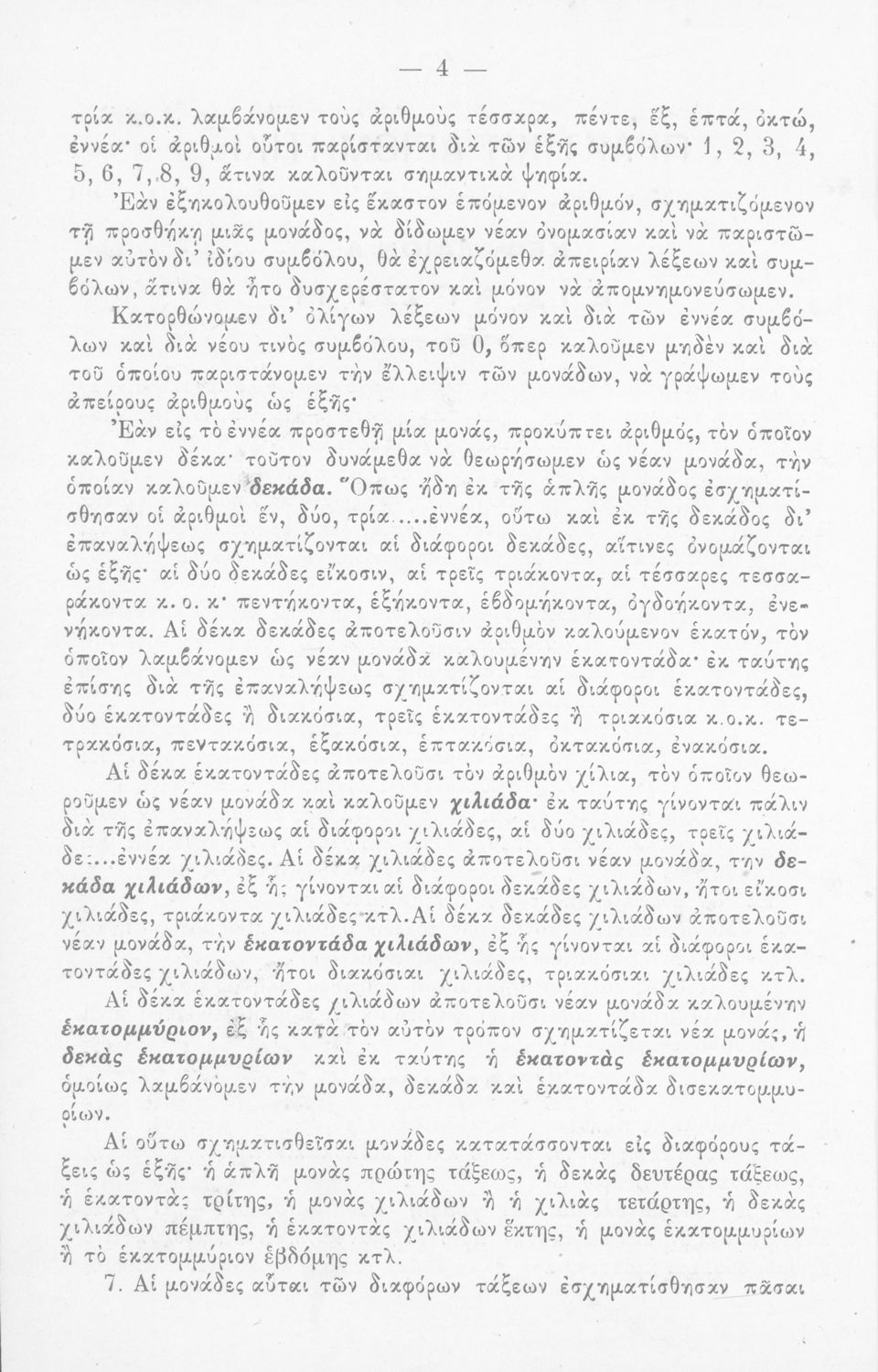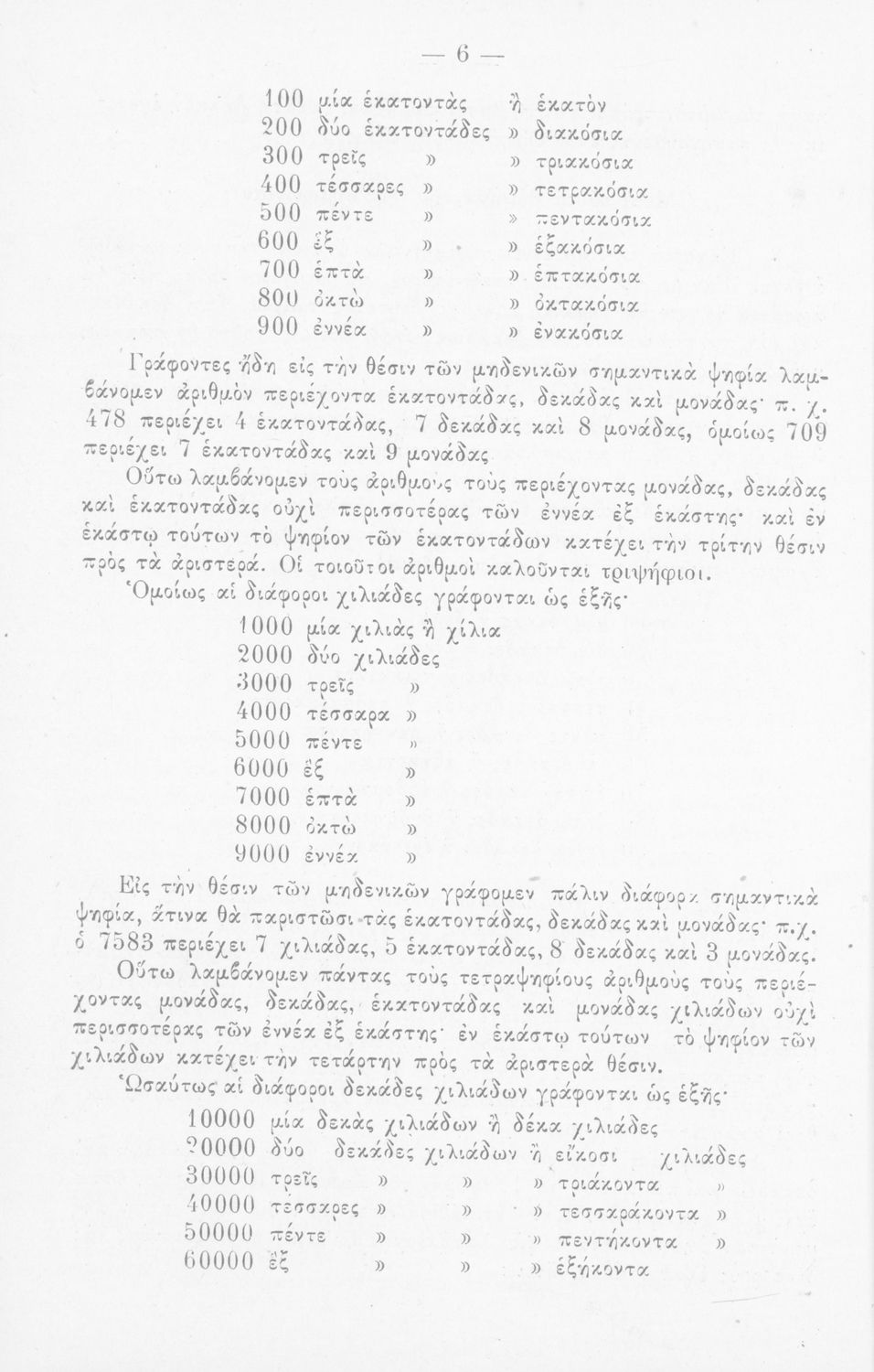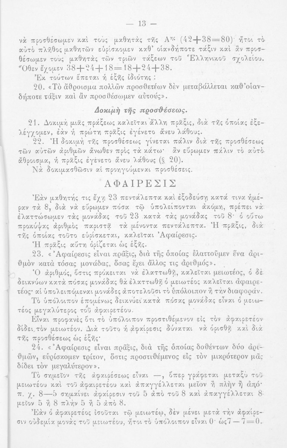 Σχολικό εγχειρίδιο Αριθμητικής για τα Ελληνικά Σχολεία και Παρθεναγωγεία που περιέχει θεωρία και ασκήσεις και εστιάζει στις αριθμητικές πράξεις και τις ιδιότητές τους. Περιέχει και στοιχεία λογιστικής.