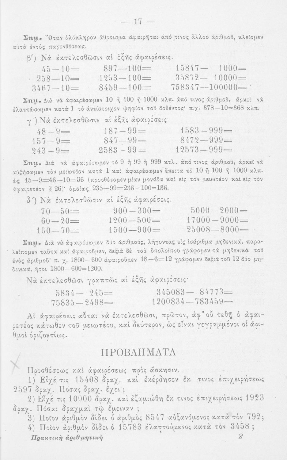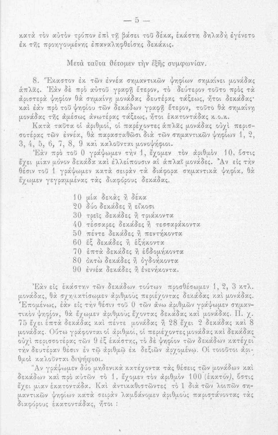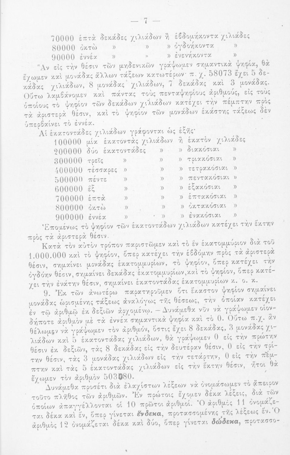 Σχολικό εγχειρίδιο Αριθμητικής για τα Ελληνικά Σχολεία και Παρθεναγωγεία που περιέχει θεωρία και ασκήσεις και εστιάζει στις αριθμητικές πράξεις και τις ιδιότητές τους. Περιέχει και στοιχεία λογιστικής.