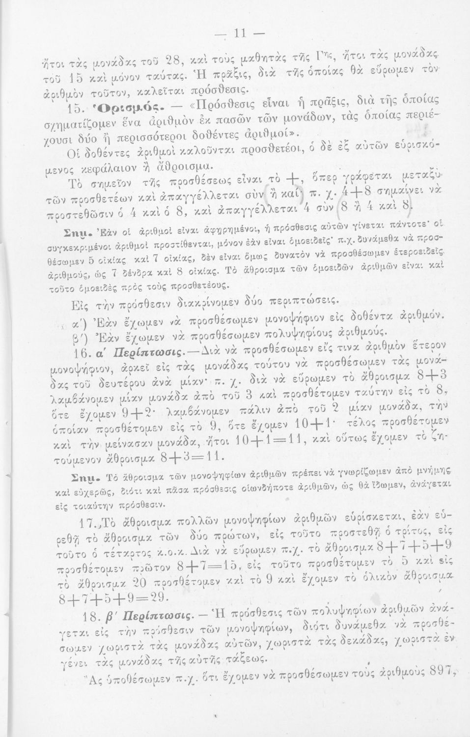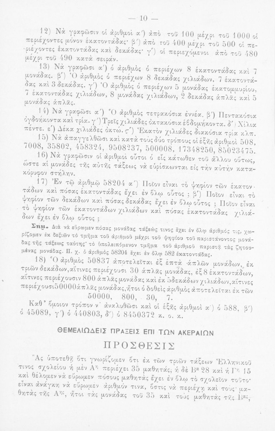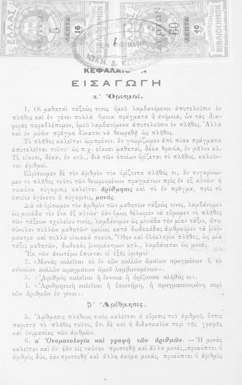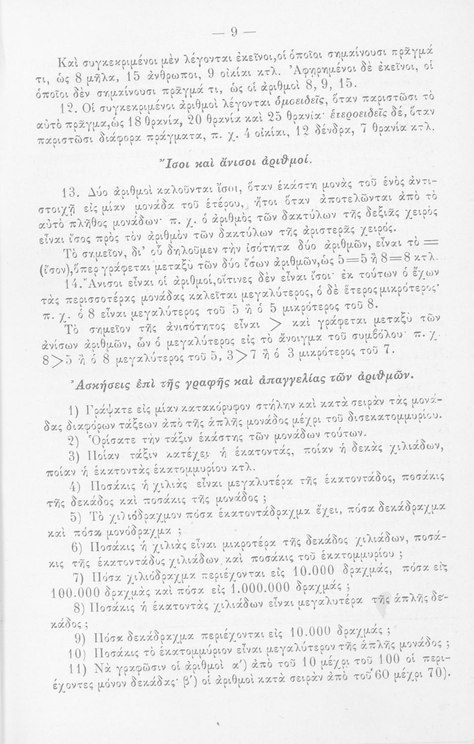 Βαθμίδα εκπαίδευσης: Δευτεροβάθμια Τάξη: Ελληνικό Σχολείο / Παρθεναγωγείο Μάθημα: Μαθηματικά Γλώσσα: Καθαρεύουσα Παρουσίαση περιεχομένου: Σχολικό εγχειρίδιο Αριθμητικής για τα Ελληνικά Σχολεία και Παρθεναγωγεία που περιέχει θεωρία και ασκήσεις και εστιάζει στις αριθμητικές πράξεις και τις ιδιότητές τους. Περιέχει και στοιχεία λογιστικής. |