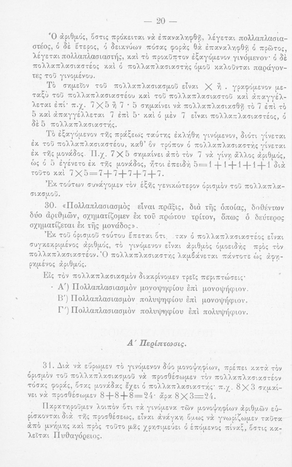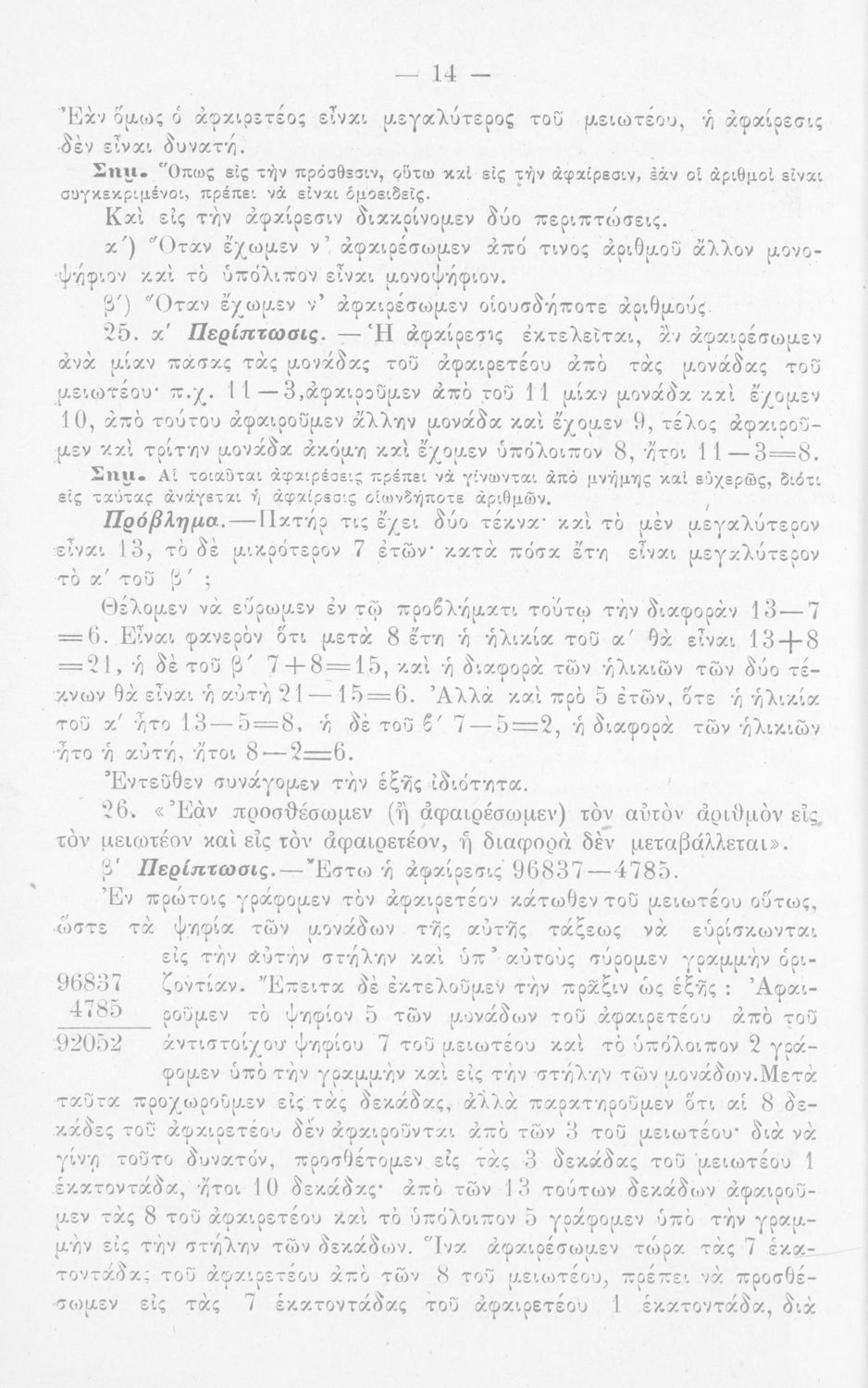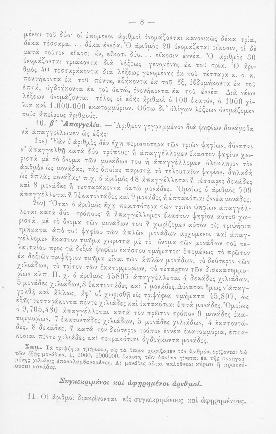 Βαθμίδα εκπαίδευσης: Δευτεροβάθμια Τάξη: Ελληνικό Σχολείο / Παρθεναγωγείο Μάθημα: Μαθηματικά Γλώσσα: Καθαρεύουσα Παρουσίαση περιεχομένου: Σχολικό εγχειρίδιο Αριθμητικής για τα Ελληνικά Σχολεία και Παρθεναγωγεία που περιέχει θεωρία και ασκήσεις και εστιάζει στις αριθμητικές πράξεις και τις ιδιότητές τους. Περιέχει και στοιχεία λογιστικής. |