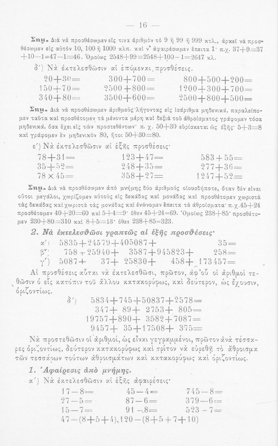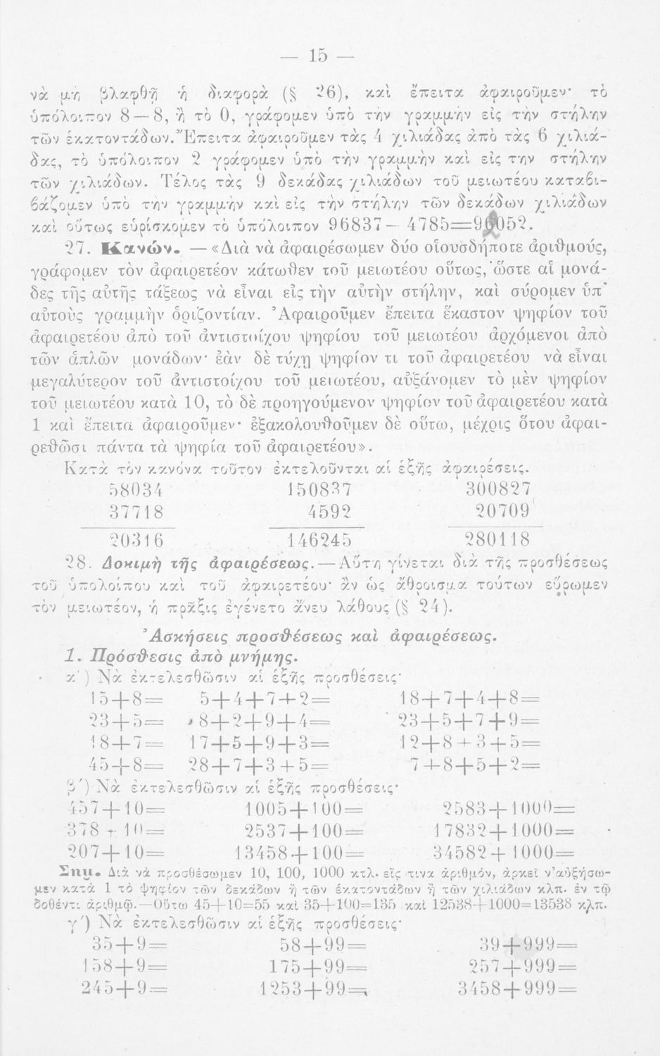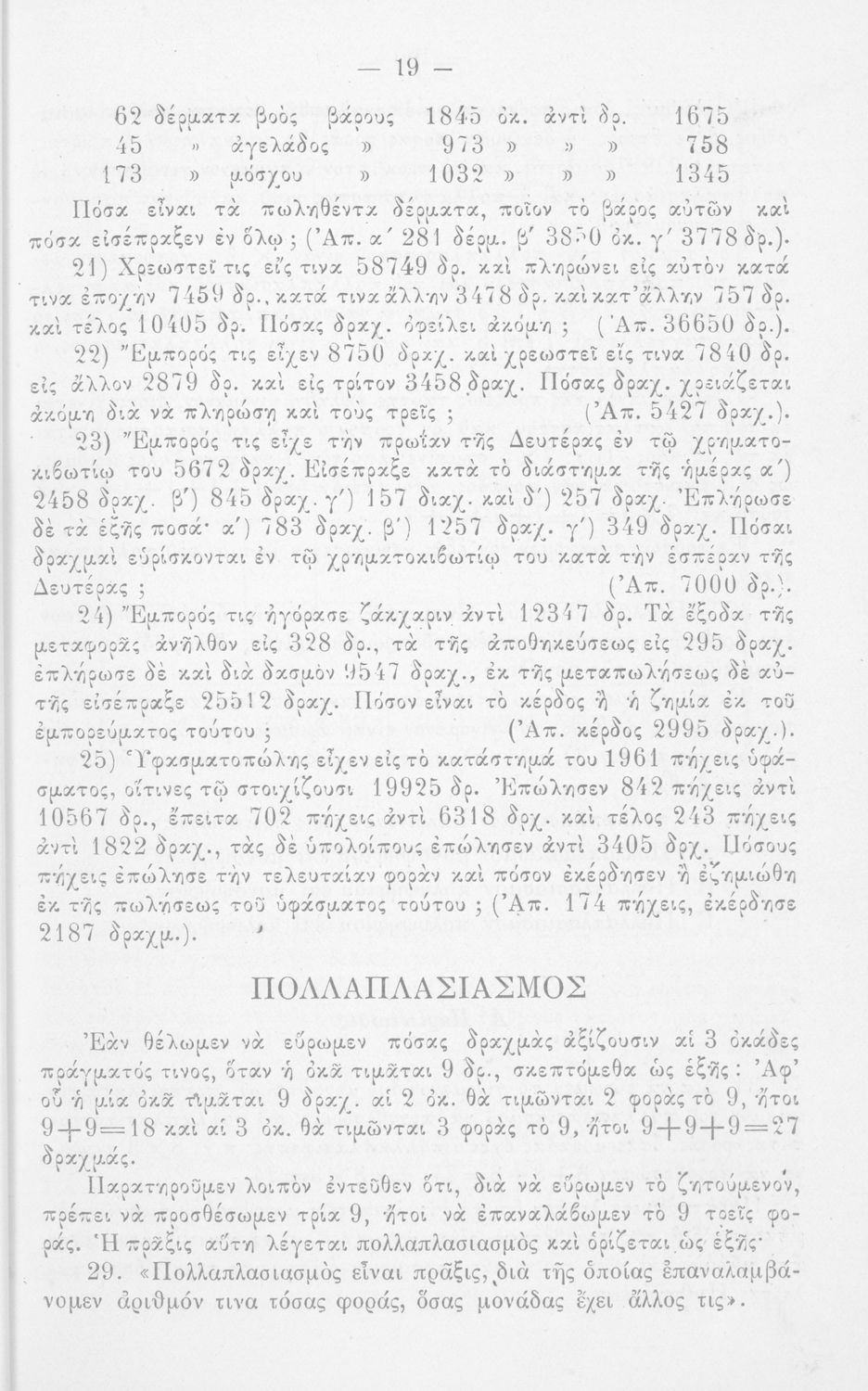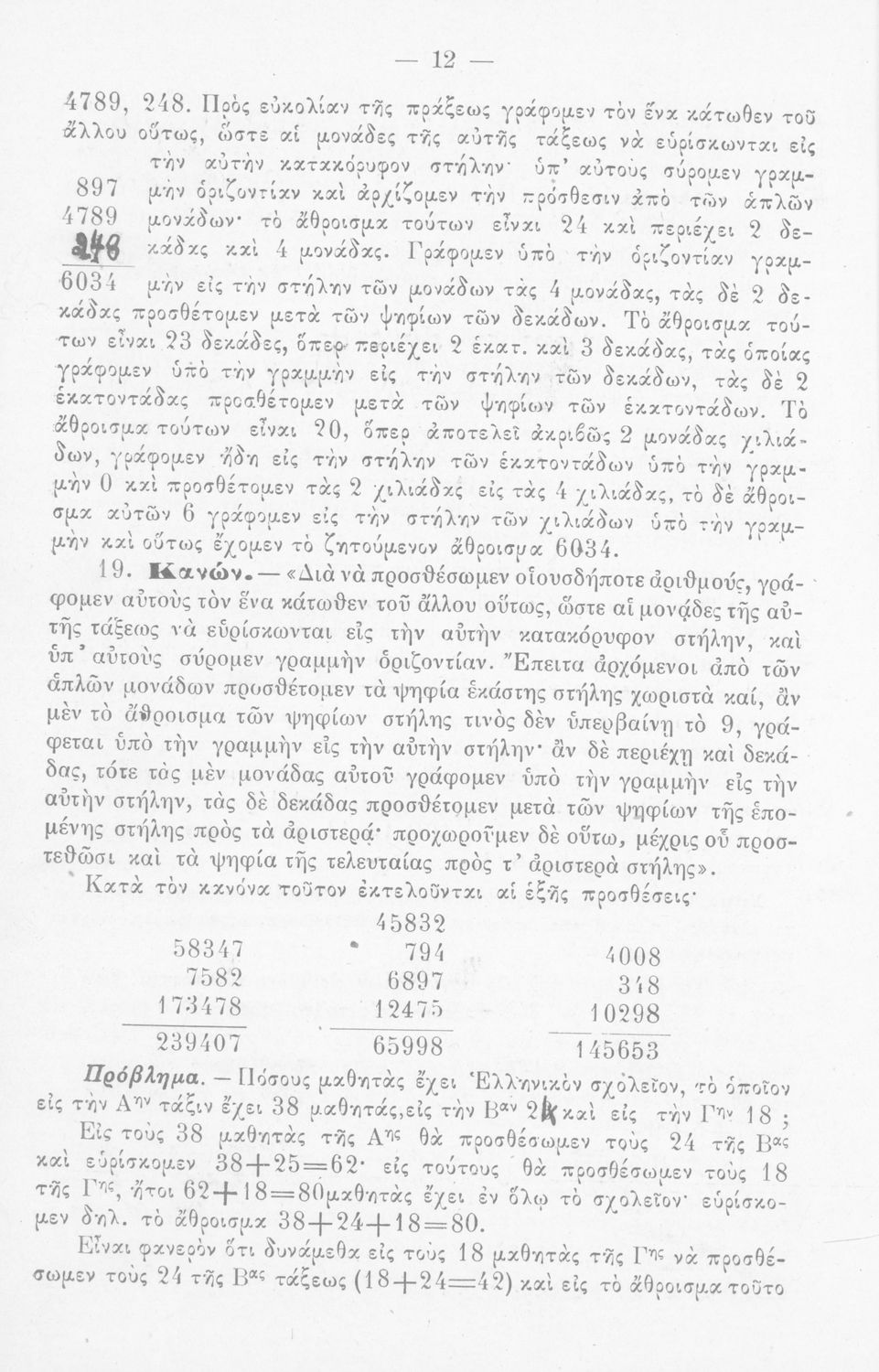 Βαθμίδα εκπαίδευσης: Δευτεροβάθμια Τάξη: Ελληνικό Σχολείο / Παρθεναγωγείο Μάθημα: Μαθηματικά Γλώσσα: Καθαρεύουσα Παρουσίαση περιεχομένου: Σχολικό εγχειρίδιο Αριθμητικής για τα Ελληνικά Σχολεία και Παρθεναγωγεία που περιέχει θεωρία και ασκήσεις και εστιάζει στις αριθμητικές πράξεις και τις ιδιότητές τους. Περιέχει και στοιχεία λογιστικής. |