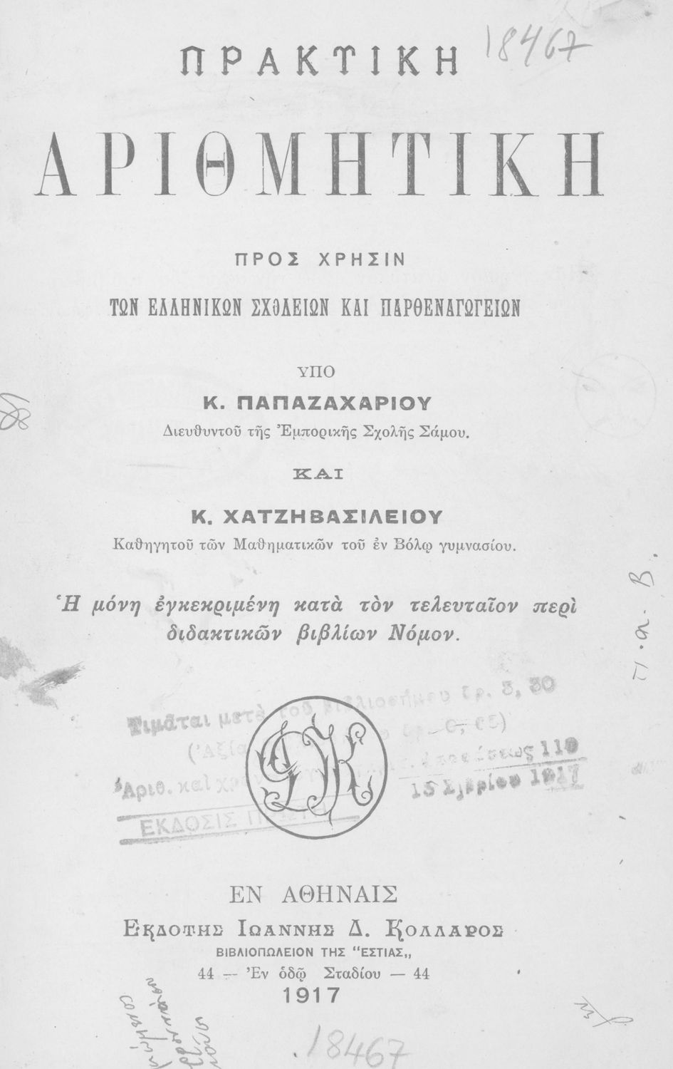 Εκδότης: Ιωάννης Δ. Κολλάρος Έτος έκδοσης: 1917 Τόπος έκδοσης: Αθήνα |