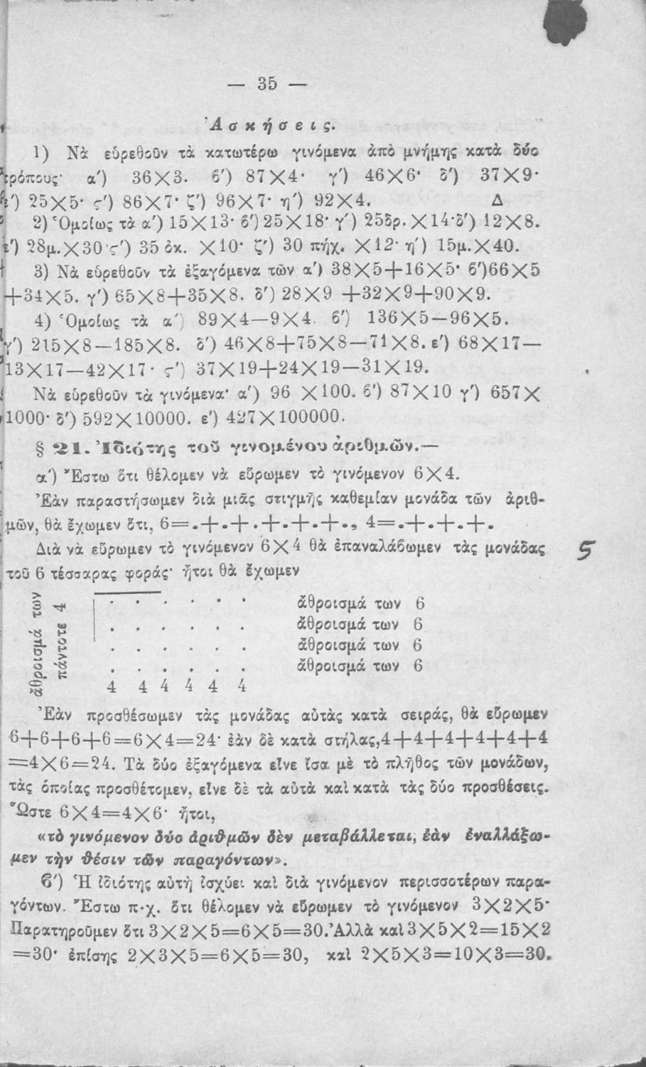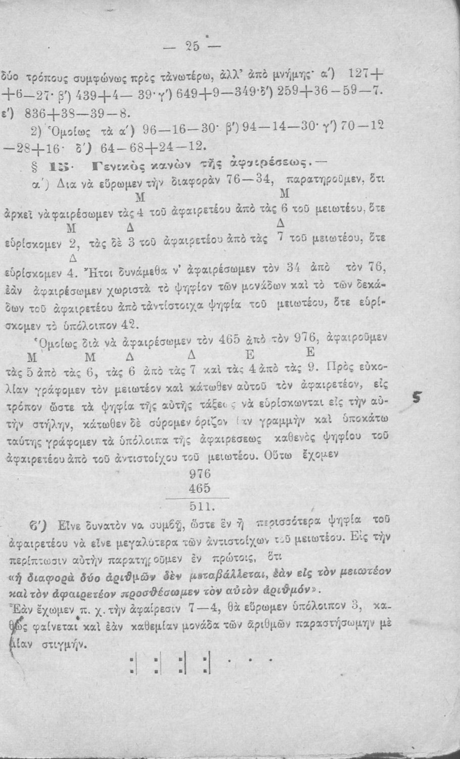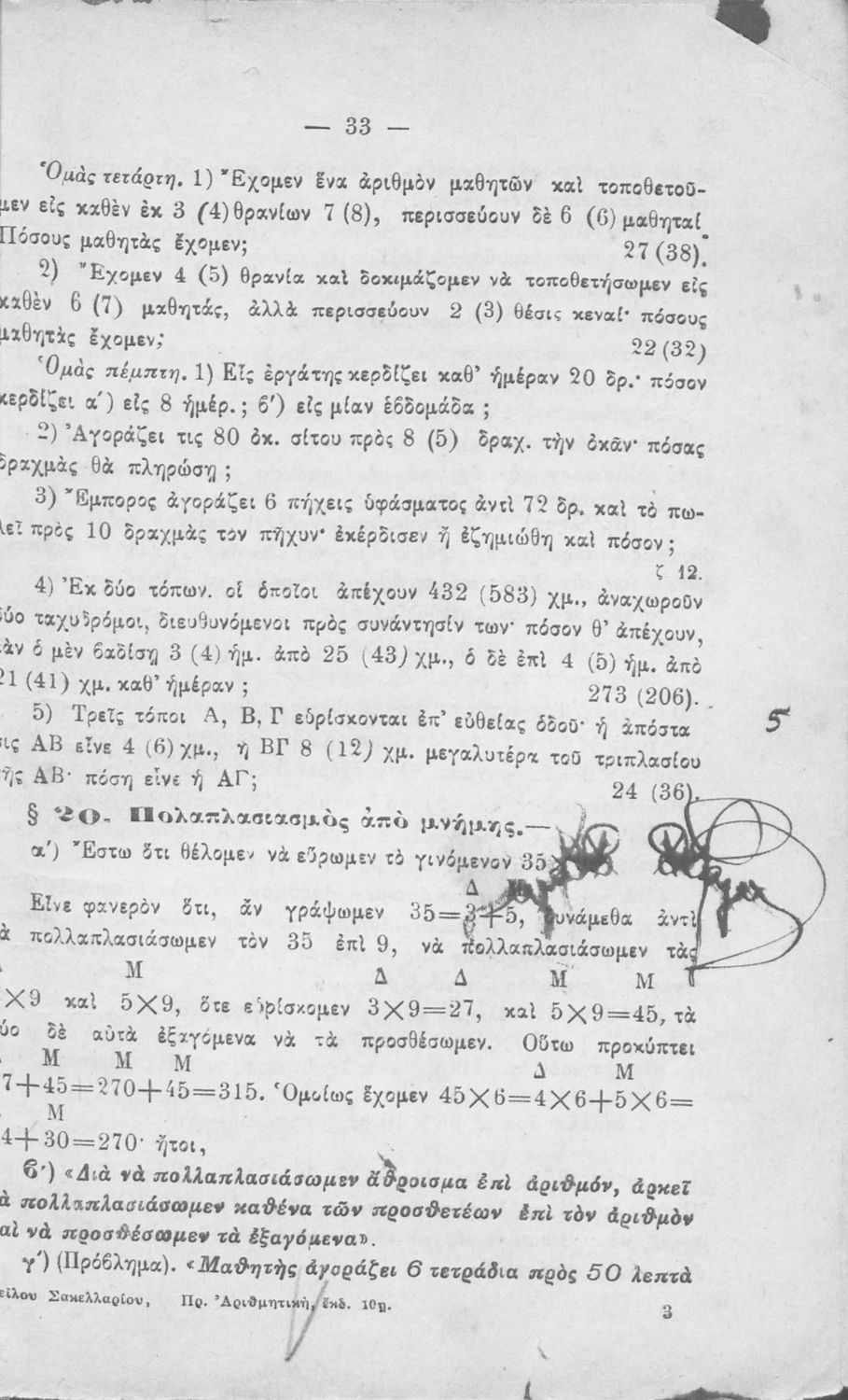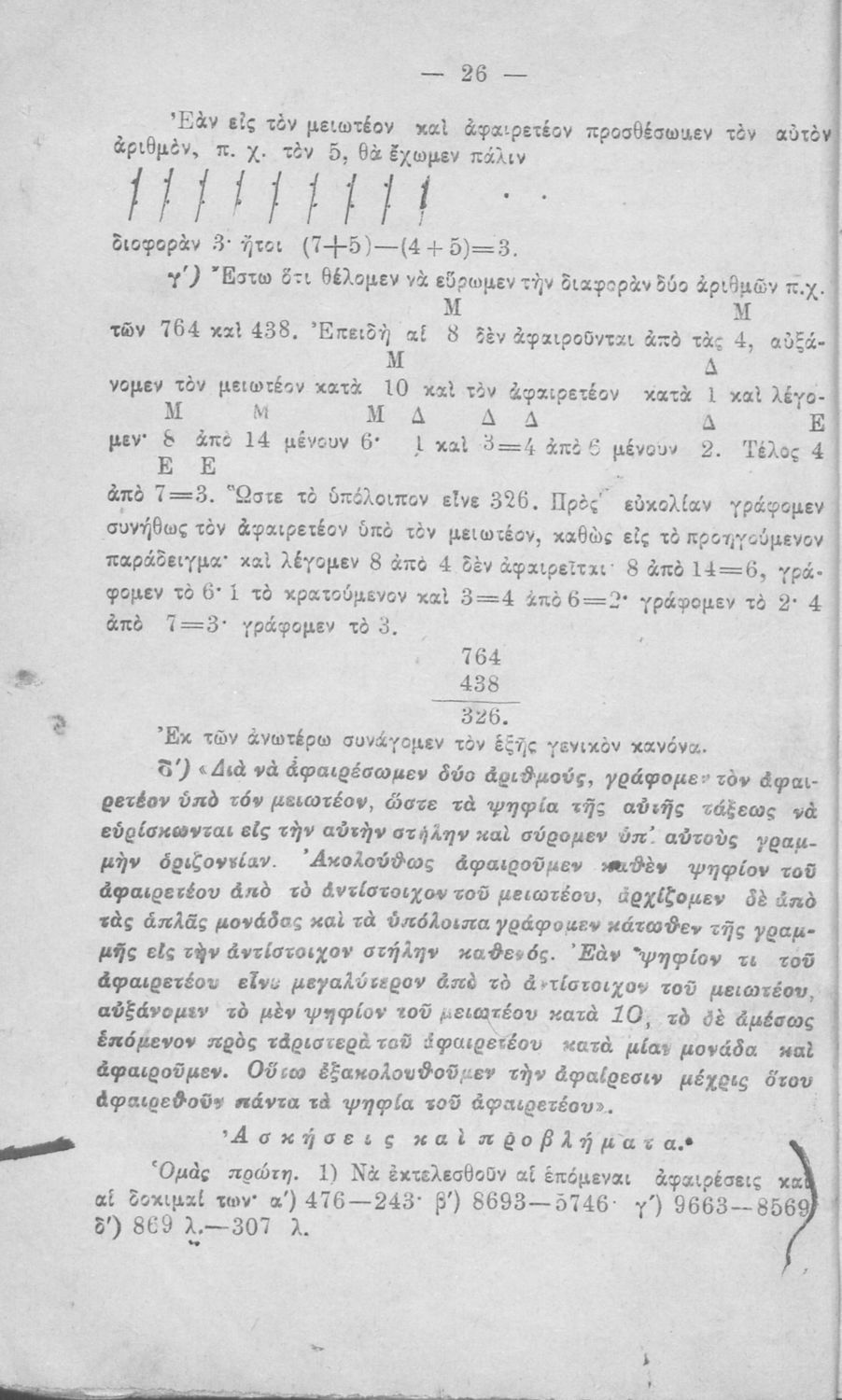 Σχολικό εγχειρίδιο Αριθμητικής για τα Ελληνικά και Αστικά Σχολεία και τα Παρθεναγωγεία που εστιάζει στις αριθμητικές πράξεις, τα κλάσματα, τους δεκαδικούς και συμμιγείς αριθμούς, και τις δυνάμεις. Περιέχει και