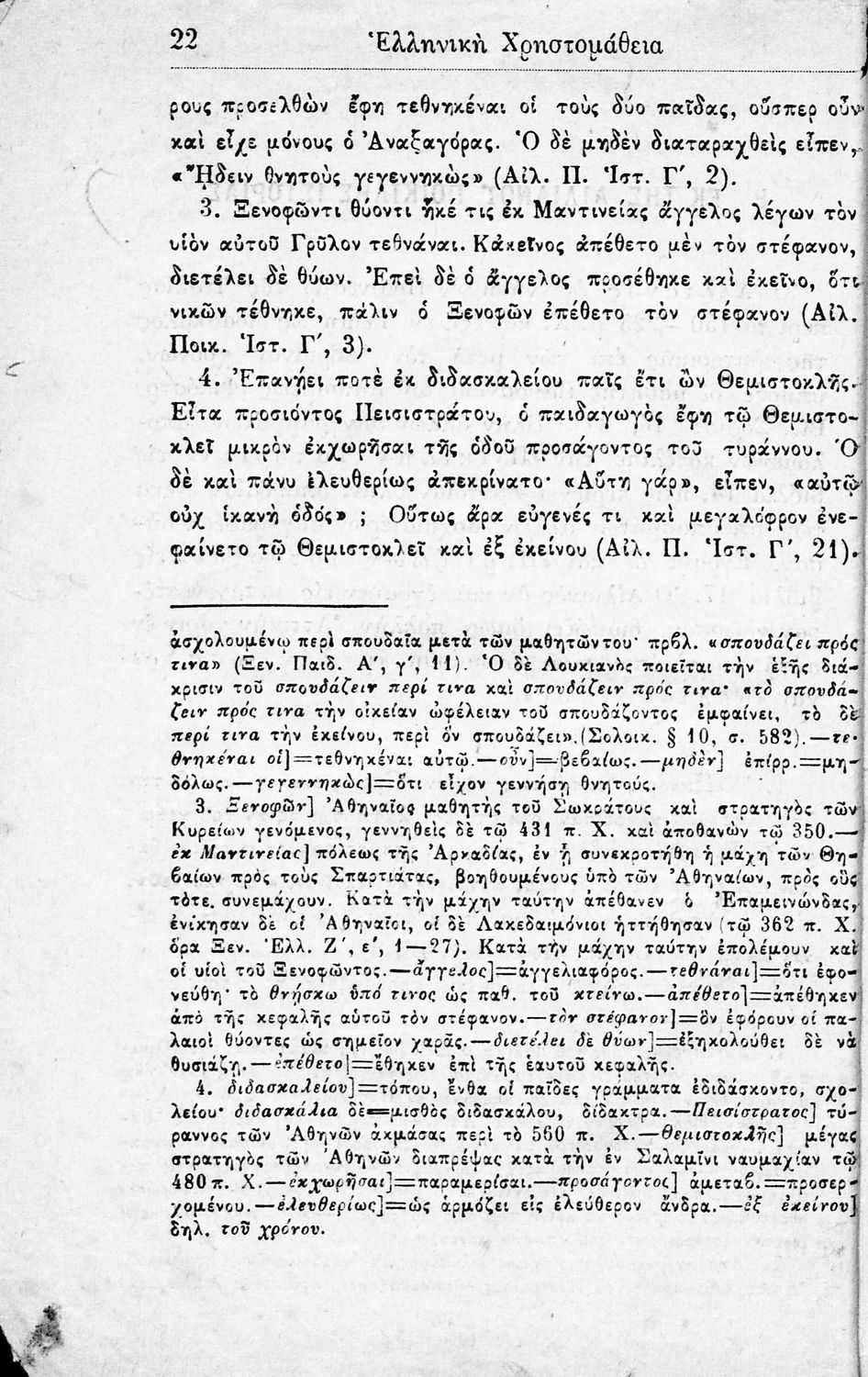 Μαθητικό βοήθημα Αρχαίων Ελληνικών για τα Ελληνικά Σχολεία και Παρθεναγωγεία που περιέχει αποσπάσματα από τα έργα του Ξενοφώντα Ελληνικά (βιβλία Α΄ έως Δ΄ ) σημειώσεις και ερμηνευτικά σχόλια.