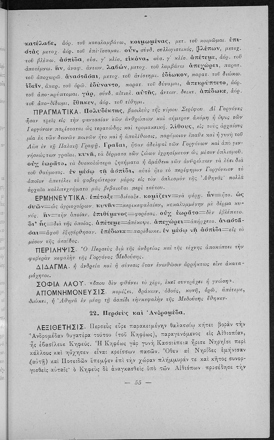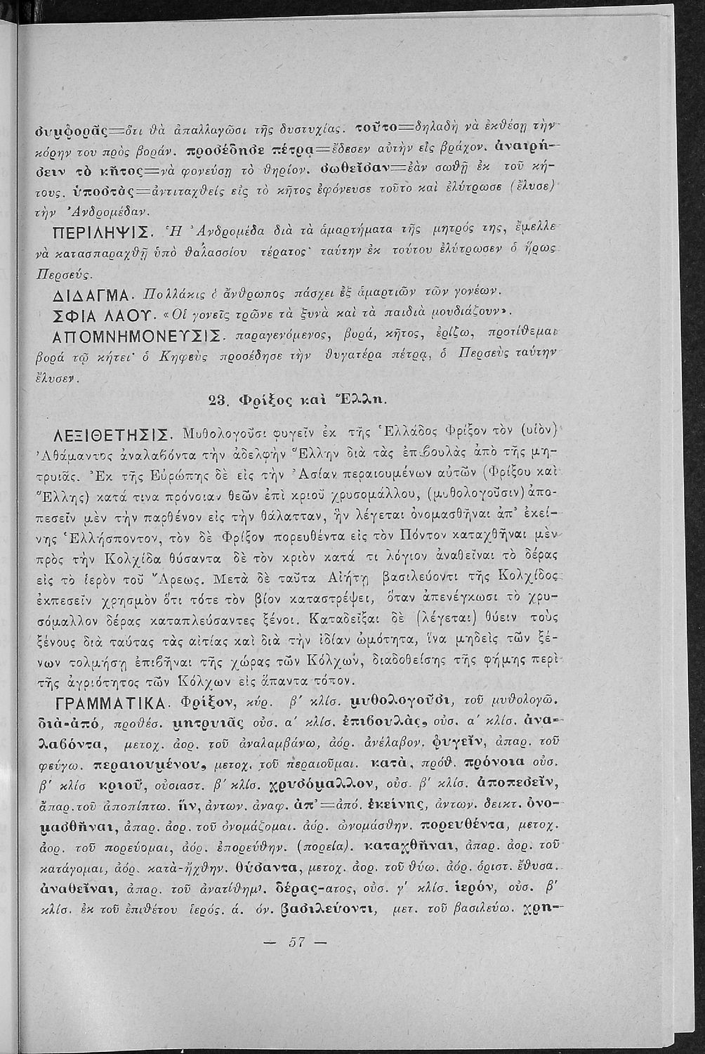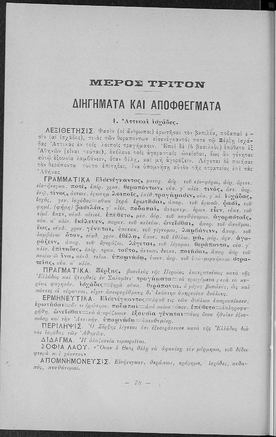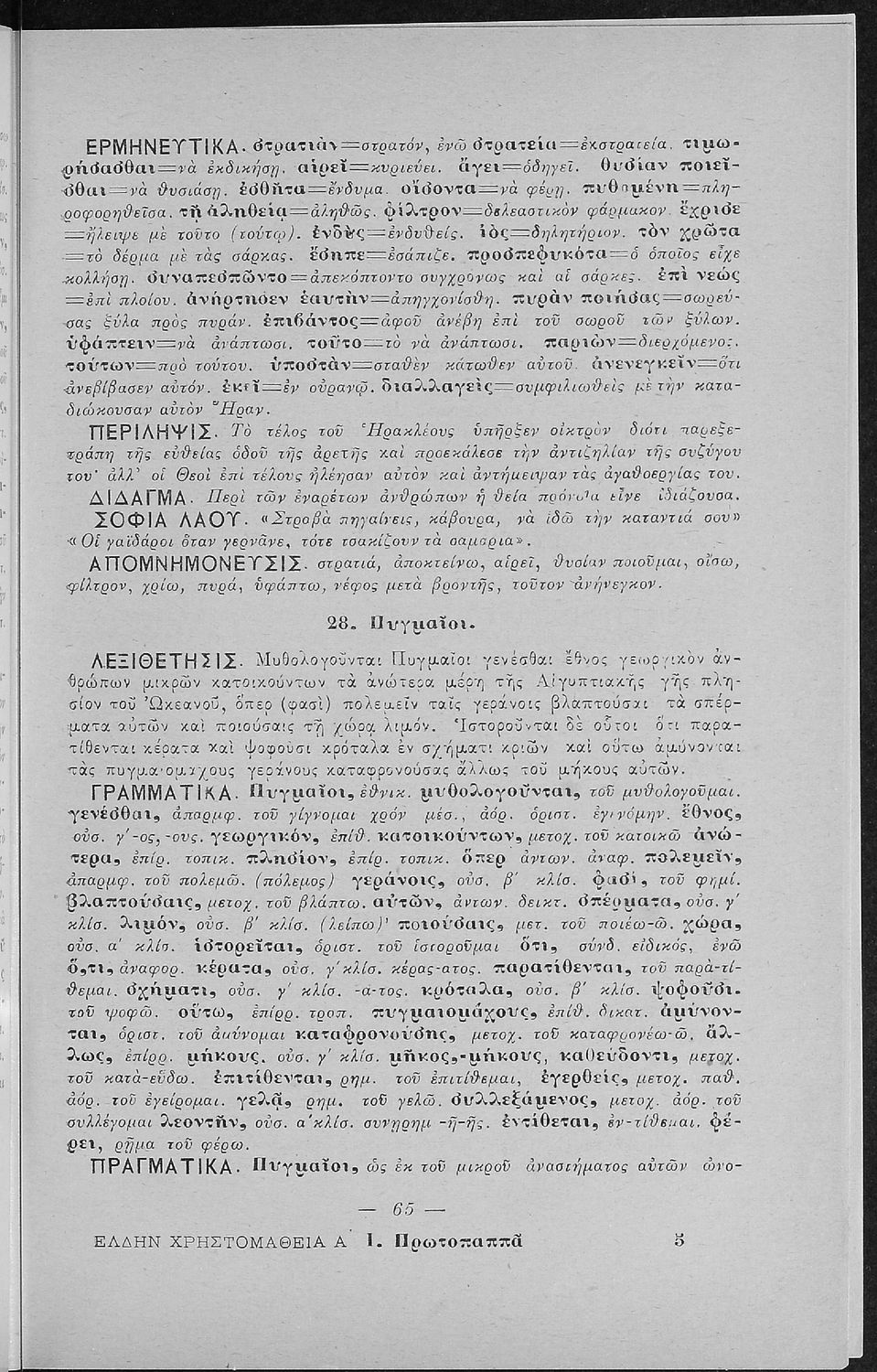 Σχολικό εγχειρίδιο Αρχαίων Ελληνικών για τις Α' Ελληνικού Σχολείου και Παρθεναγωγείου και την Ε΄ Δημοτικού που περιέχει κείμενα στην αρχαία ελληνική εμπνευσμένα από την ελληνική μυθολογία, και γραμματικές, πραγματολογικές και ερμηνευτικές σημειώσεις. Περιλαμβάνει προεισαγωγικές ασκήσεις για να κατανοήσει ο μαθητής την σχέση και τη διαφορά μεταξύ της αρχαίας και νέας ελληνικής. Κάθε κείμενο περιλαμβάνει την περίληψη του στην καθαρεύουσα και ένα δίδαγμα.