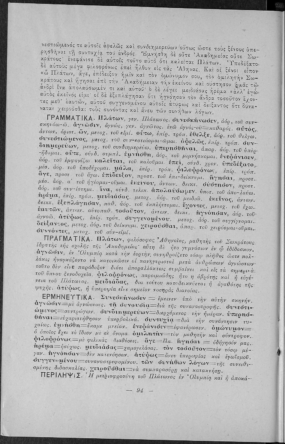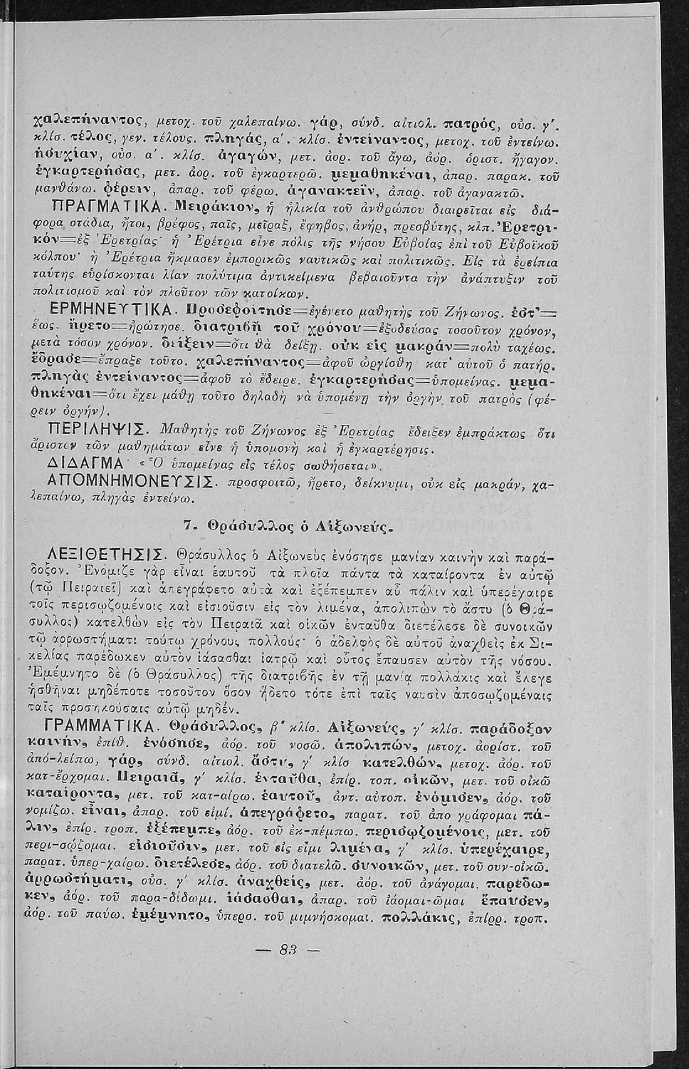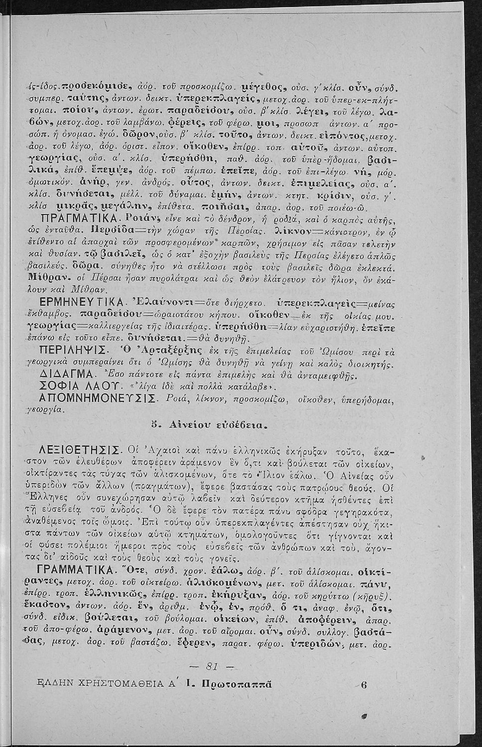 Βαθμίδα εκπαίδευσης: Πρωτοβάθμια, Δευτεροβάθμια Τάξη: Α΄ Ελληνικού Σχολείου / Παρθεναγωγείο / Ε' Δημοτικού Μάθημα: Νέα Ελληνικά Γλώσσα: Καθαρεύουσα Παρουσίαση περιεχομένου: Σχολικό εγχειρίδιο Αρχαίων Ελληνικών για τις Α' Ελληνικού Σχολείου και Παρθεναγωγείου και την Ε΄ Δημοτικού που περιέχει κείμενα στην αρχαία ελληνική εμπνευσμένα από την ελληνική μυθολογία, και γραμματικές, πραγματολογικές και ερμηνευτικές σημειώσεις. Περιλαμβάνει προεισαγωγικές ασκήσεις για να κατανοήσει ο μαθητής την σχέση και τη διαφορά μεταξύ της αρχαίας και νέας ελληνικής. Κάθε κείμενο περιλαμβάνει την περίληψη του στην καθαρεύουσα και ένα δίδαγμα. |