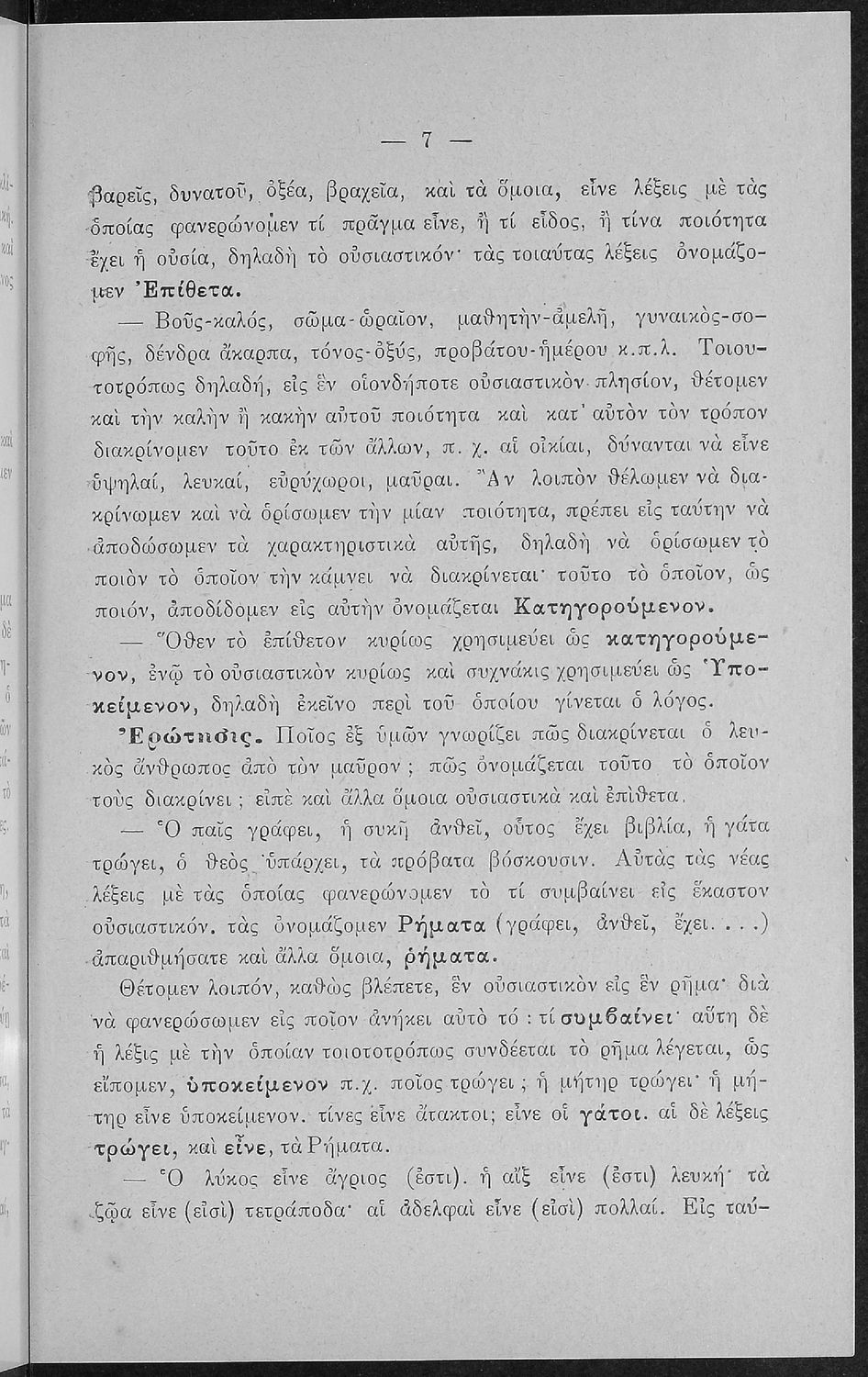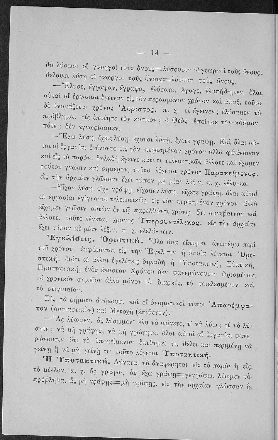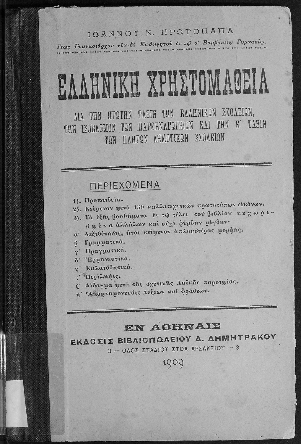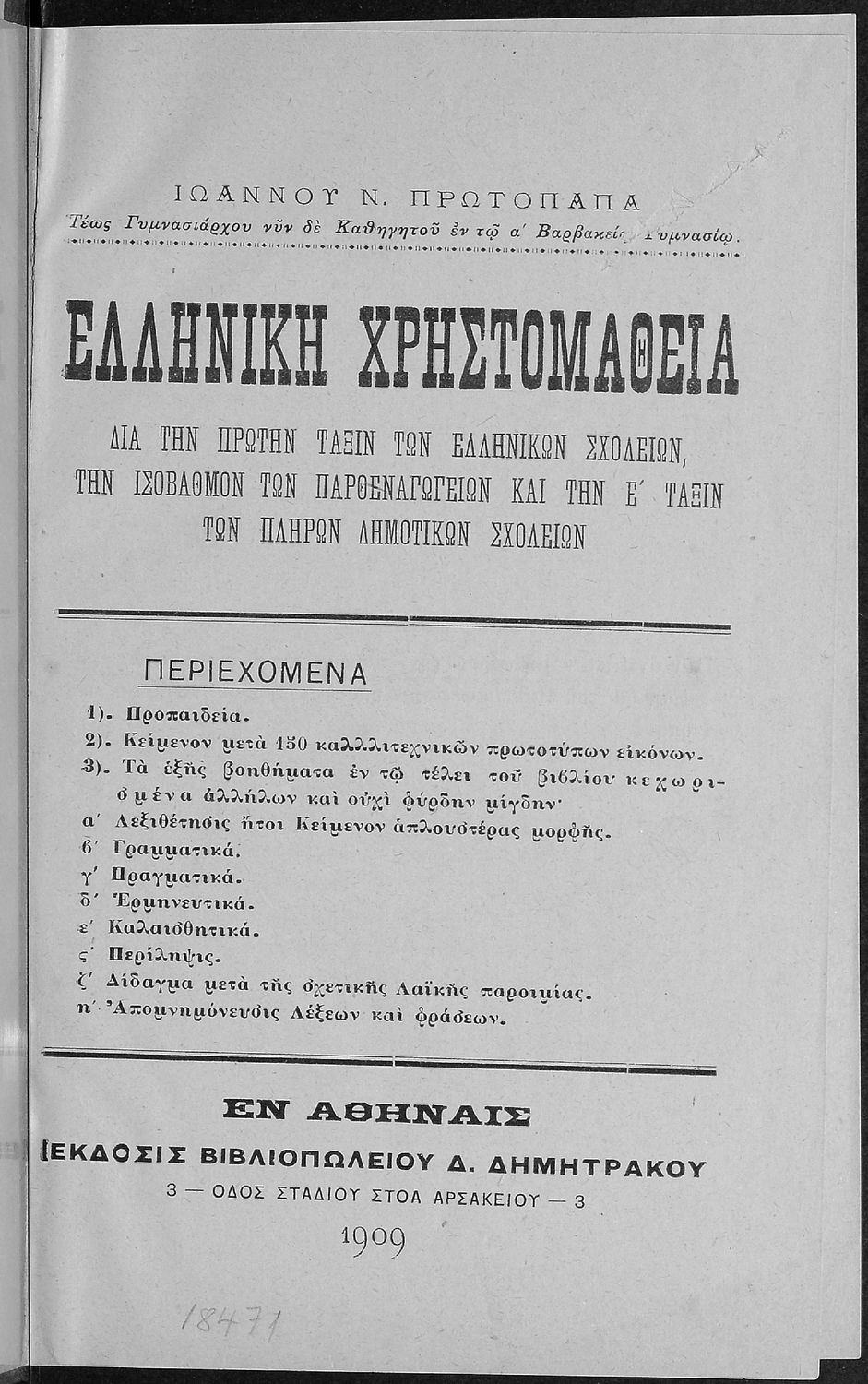 Βαθμίδα εκπαίδευσης: Πρωτοβάθμια, Δευτεροβάθμια Τάξη: Α΄ Ελληνικού Σχολείου / Παρθεναγωγείο / Ε' Δημοτικού Μάθημα: Νέα Ελληνικά Γλώσσα: Καθαρεύουσα Παρουσίαση περιεχομένου: Σχολικό εγχειρίδιο Αρχαίων Ελληνικών για τις Α' Ελληνικού Σχολείου και Παρθεναγωγείου και την Ε΄ Δημοτικού που περιέχει κείμενα στην αρχαία ελληνική εμπνευσμένα από την ελληνική μυθολογία, και γραμματικές, πραγματολογικές και ερμηνευτικές σημειώσεις. Περιλαμβάνει προεισαγωγικές ασκήσεις για να κατανοήσει ο μαθητής την σχέση και τη διαφορά μεταξύ της αρχαίας και νέας ελληνικής. Κάθε κείμενο περιλαμβάνει την περίληψη του στην καθαρεύουσα και ένα δίδαγμα. |