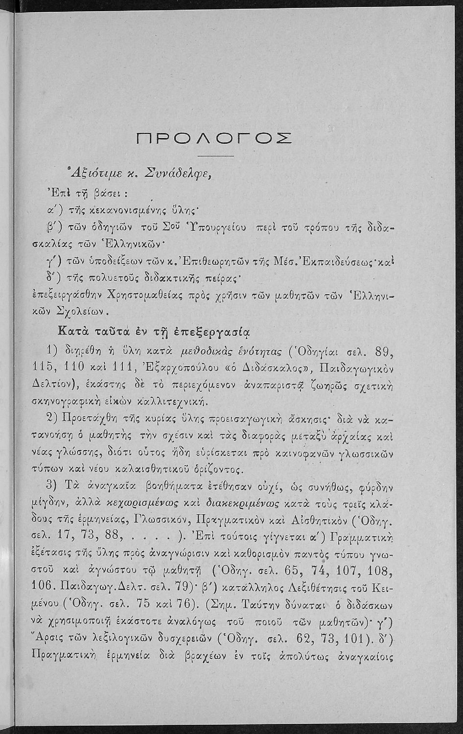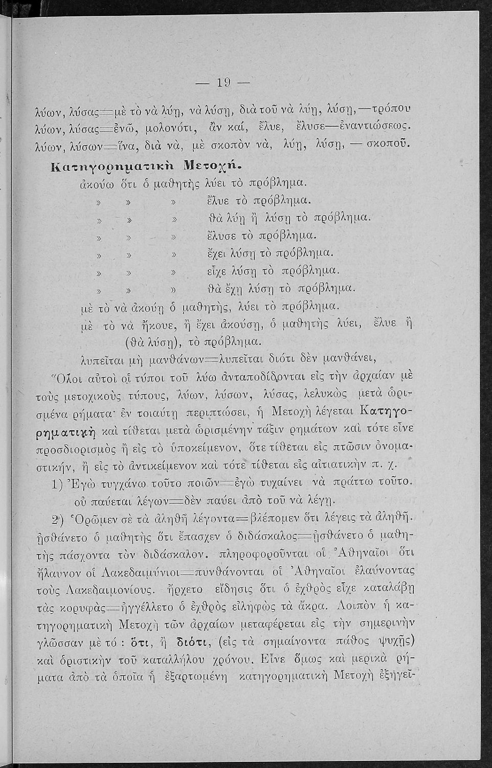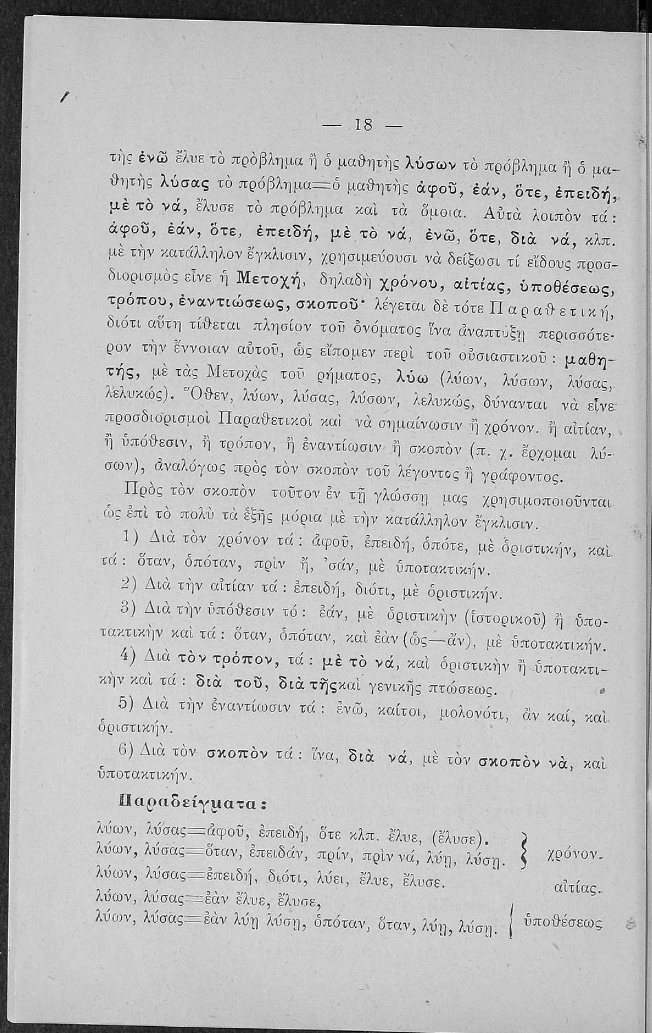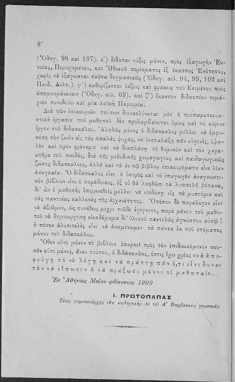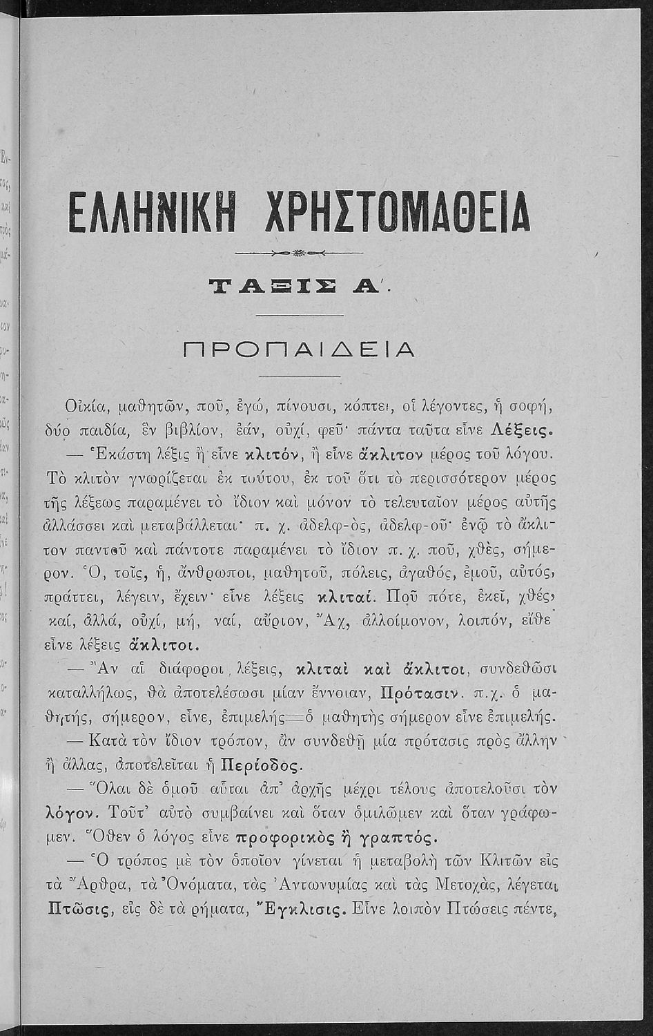 Σχολικό εγχειρίδιο Αρχαίων Ελληνικών για τις Α' Ελληνικού Σχολείου και Παρθεναγωγείου και την Ε΄ Δημοτικού που περιέχει κείμενα στην αρχαία ελληνική εμπνευσμένα από την ελληνική μυθολογία, και γραμματικές, πραγματολογικές και ερμηνευτικές σημειώσεις. Περιλαμβάνει προεισαγωγικές ασκήσεις για να κατανοήσει ο μαθητής την σχέση και τη διαφορά μεταξύ της αρχαίας και νέας ελληνικής. Κάθε κείμενο περιλαμβάνει την περίληψη του στην καθαρεύουσα και ένα δίδαγμα.
