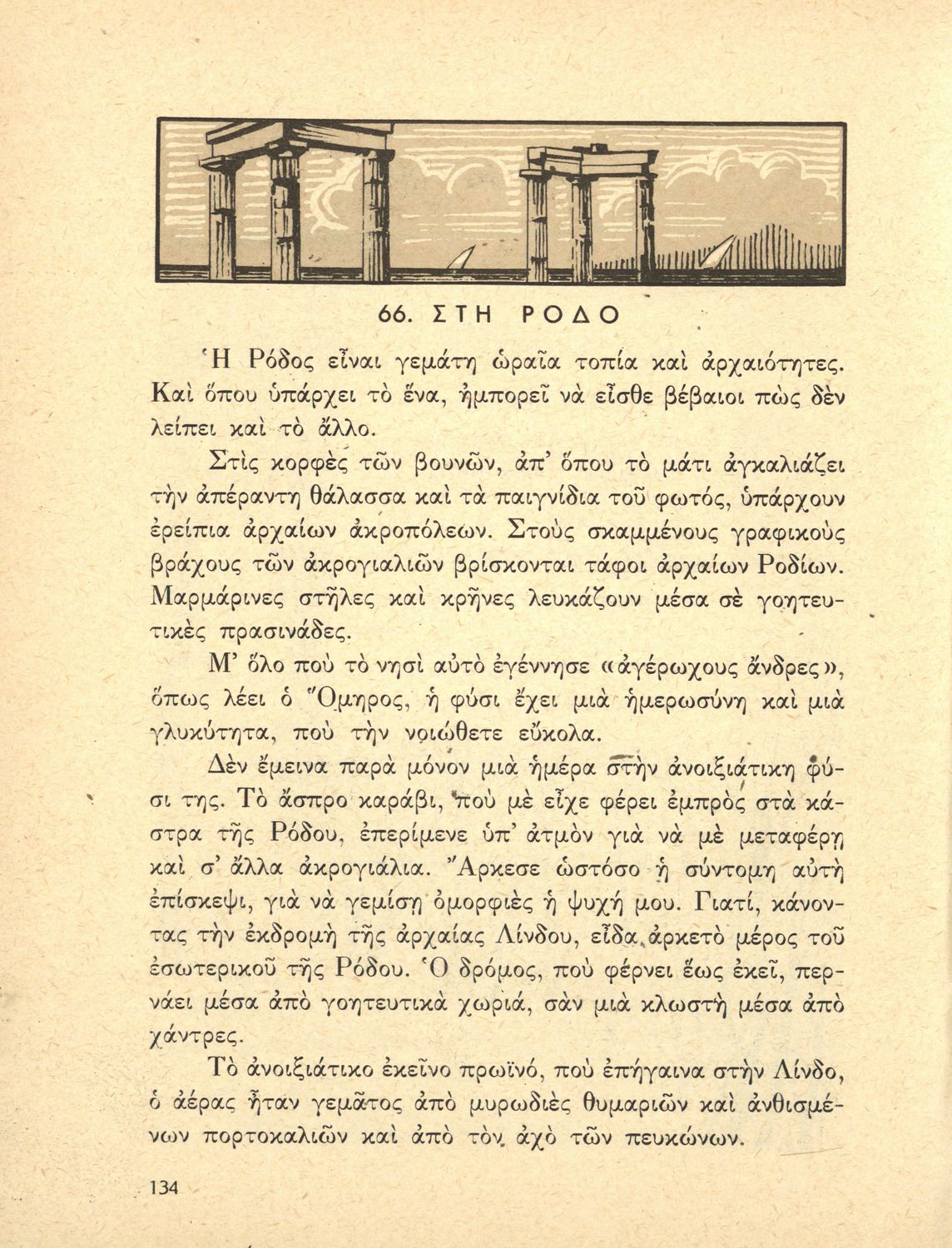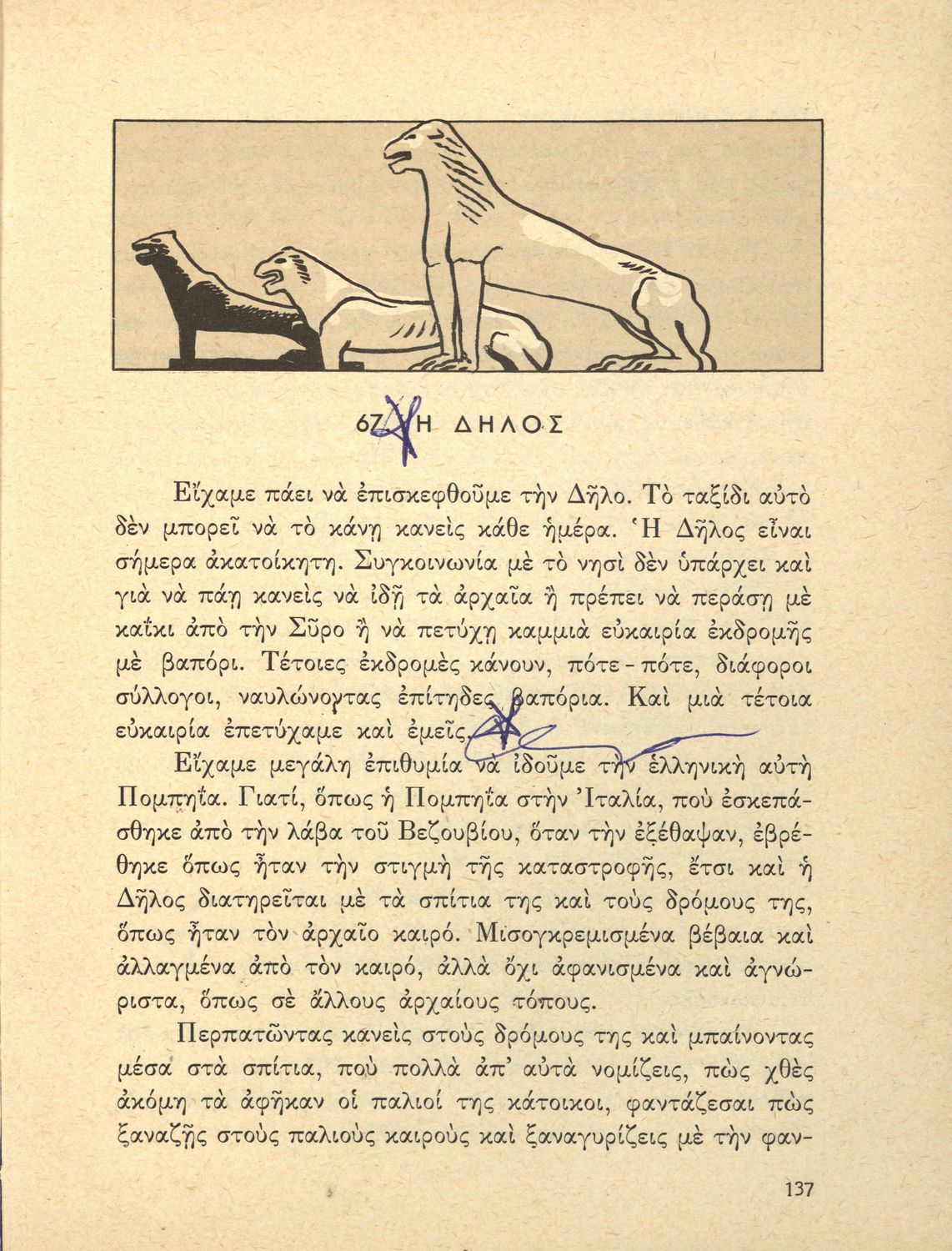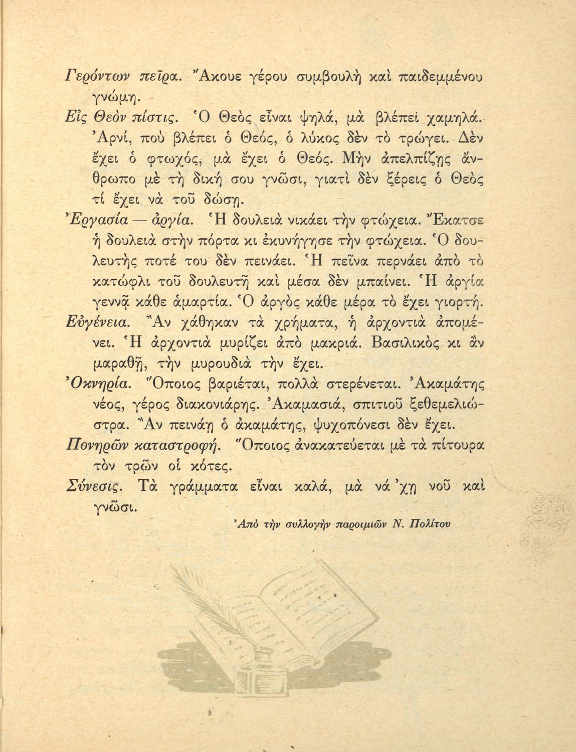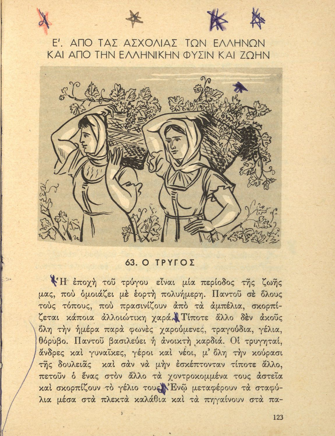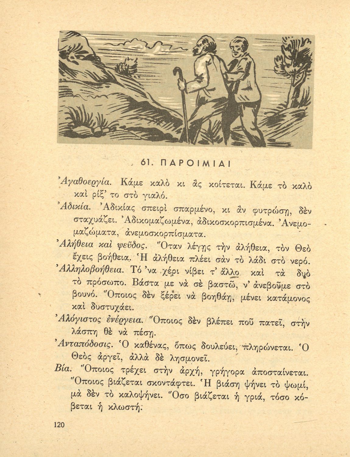 Αναγνωστικό ΣΤ΄ Δημοτικού που περιλαμβάνει θέματα από τις ελληνικές παραδόσεις και μύθους, την ελληνική φύση και θάλασσα και το τρίπτυχο "Πατρίς-θρησκεία-οικογένειαα".