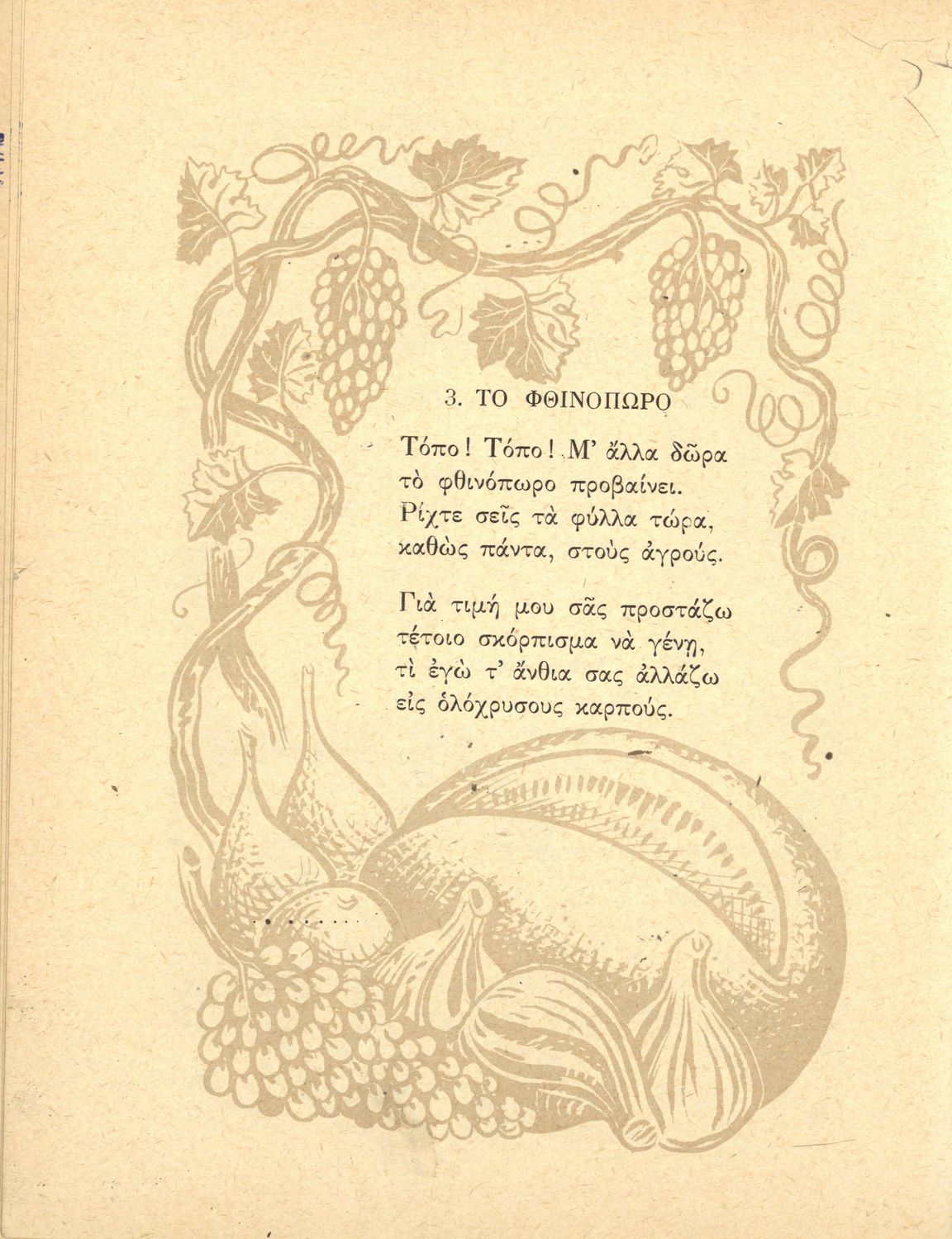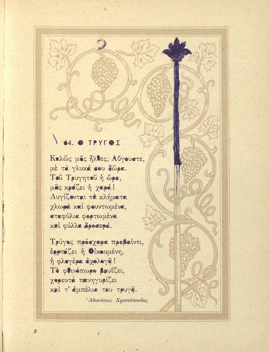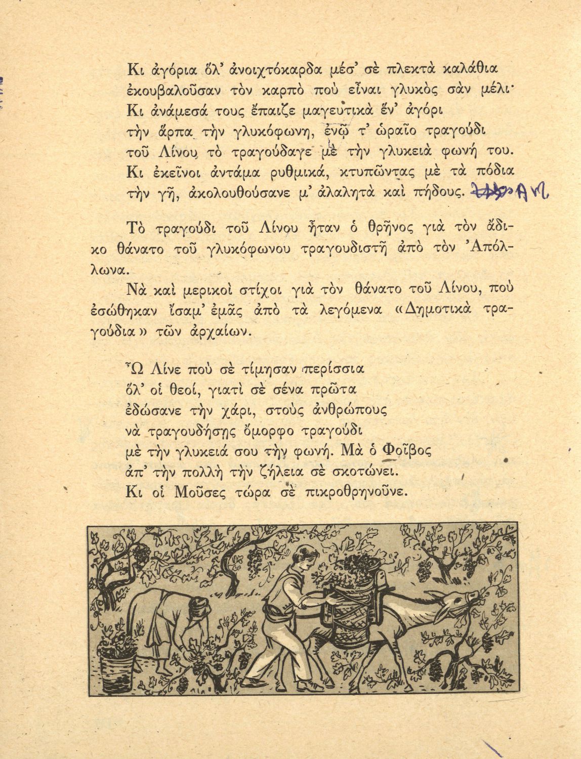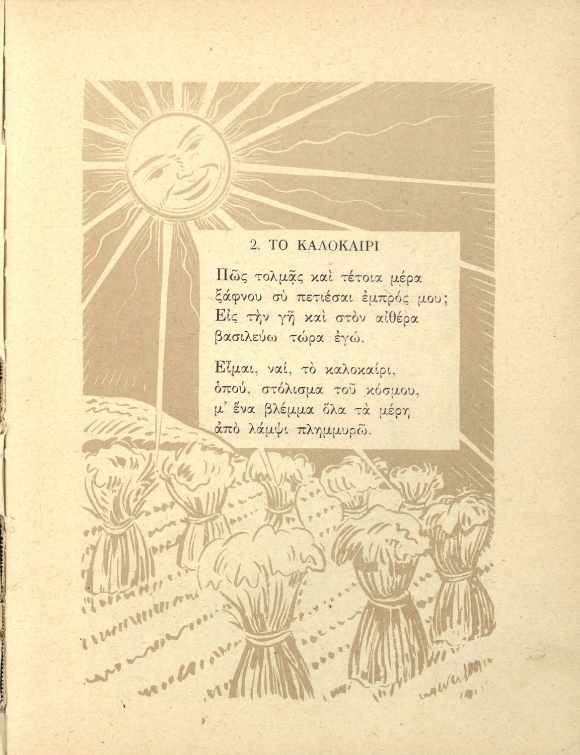 Αναγνωστικό ΣΤ΄ Δημοτικού που περιλαμβάνει θέματα από τις ελληνικές παραδόσεις και μύθους, την ελληνική φύση και θάλασσα και το τρίπτυχο "Πατρίς-θρησκεία-οικογένειαα".