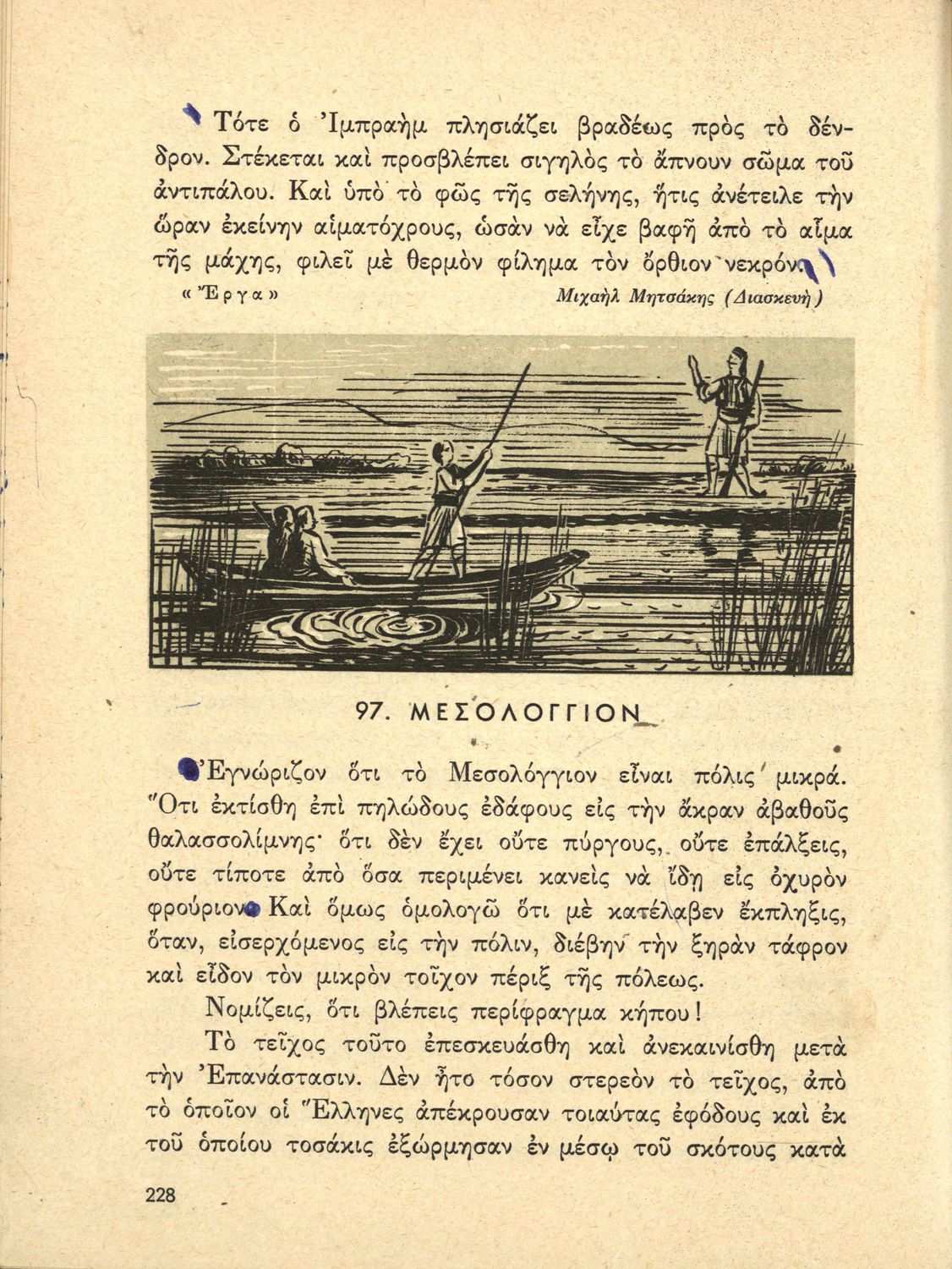 Αναγνωστικό ΣΤ΄ Δημοτικού που περιλαμβάνει θέματα από τις ελληνικές παραδόσεις και μύθους, την ελληνική φύση και θάλασσα και το τρίπτυχο "Πατρίς-θρησκεία-οικογένειαα".