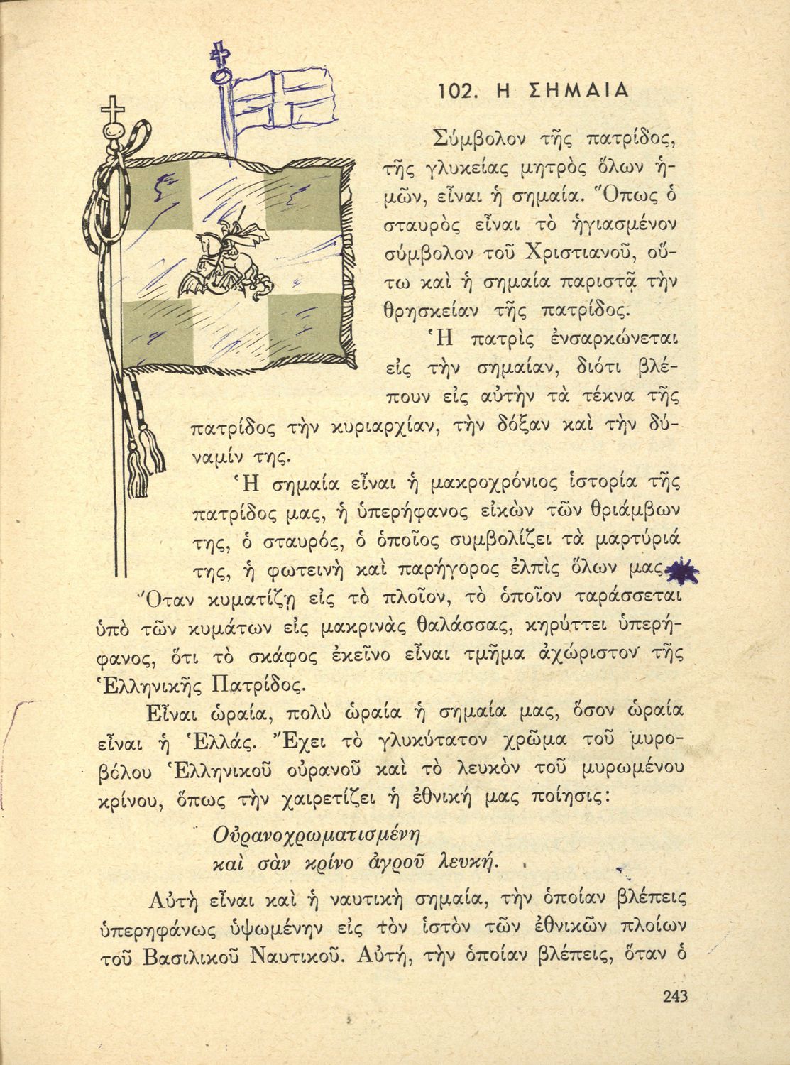 Αναγνωστικό ΣΤ΄ Δημοτικού που περιλαμβάνει θέματα από τις ελληνικές παραδόσεις και μύθους, την ελληνική φύση και θάλασσα και το τρίπτυχο "Πατρίς-θρησκεία-οικογένειαα".