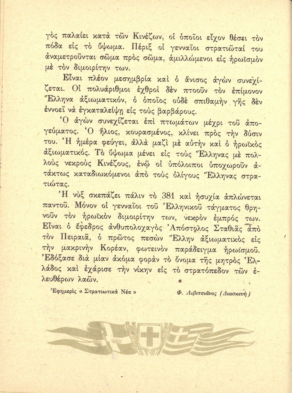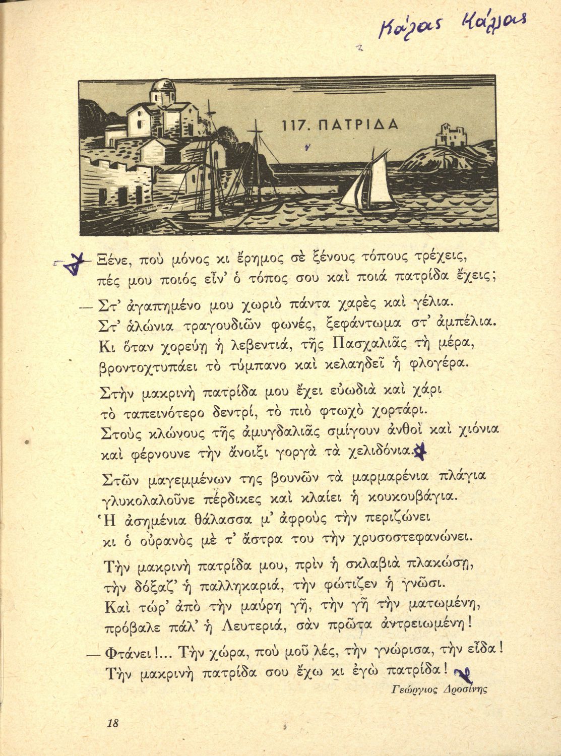 Αναγνωστικό ΣΤ΄ Δημοτικού που περιλαμβάνει θέματα από τις ελληνικές παραδόσεις και μύθους, την ελληνική φύση και θάλασσα και το τρίπτυχο "Πατρίς-θρησκεία-οικογένειαα".