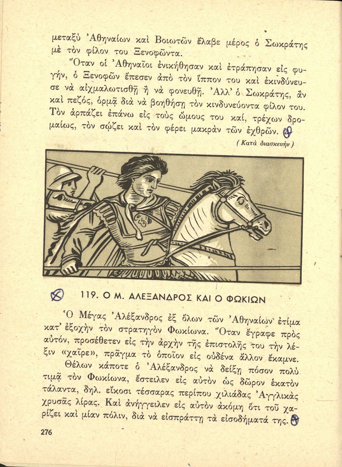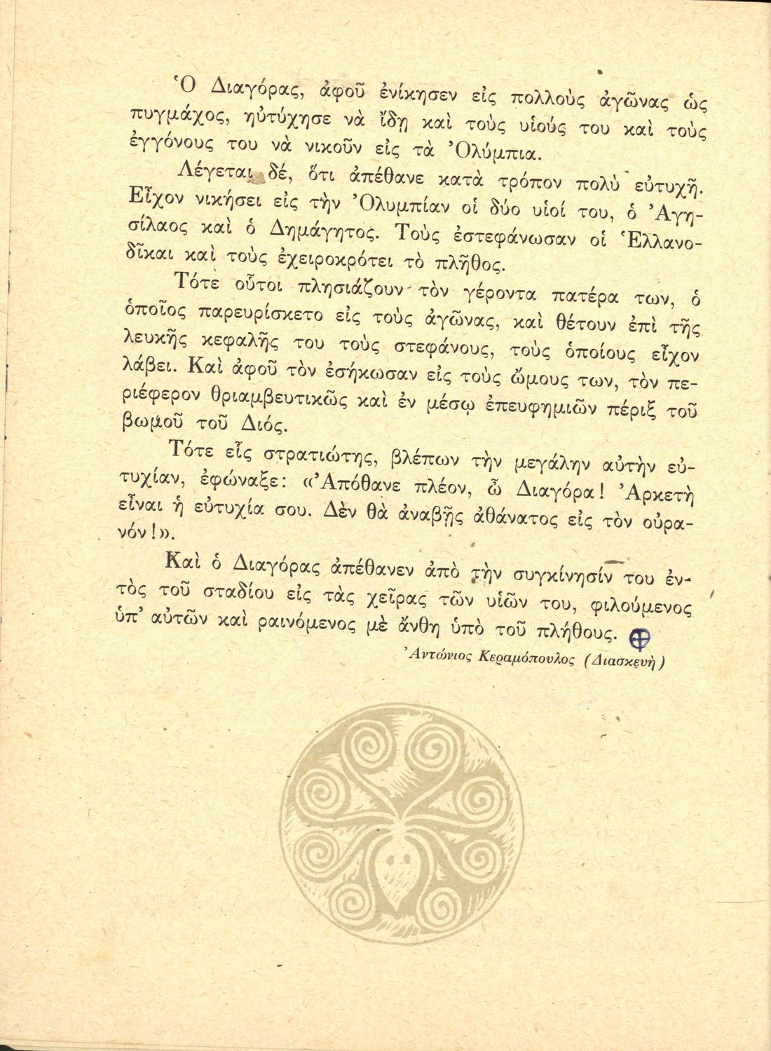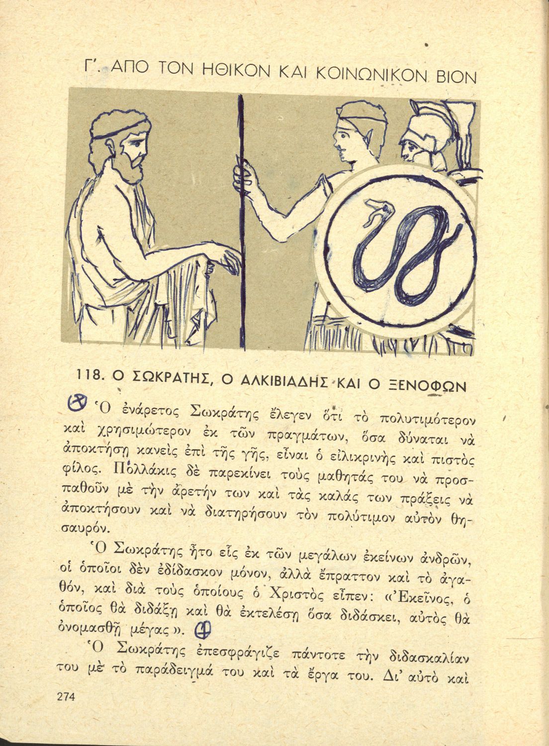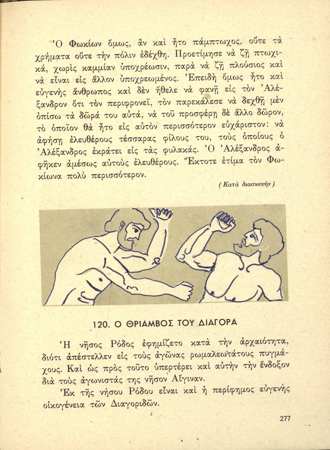Αναγνωστικό ΣΤ΄ Δημοτικού που περιλαμβάνει θέματα από τις ελληνικές παραδόσεις και μύθους, την ελληνική φύση και θάλασσα και το τρίπτυχο "Πατρίς-θρησκεία-οικογένειαα".