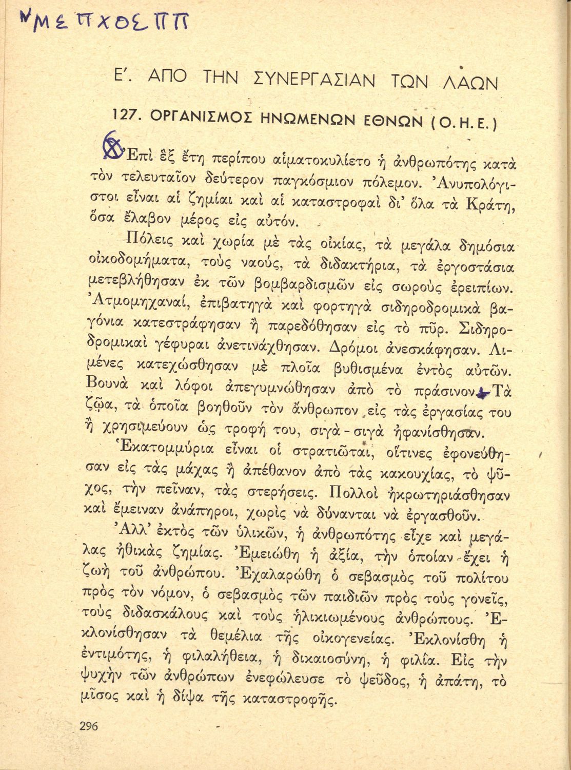 Αναγνωστικό της ΣΤ΄ Δημοτικού που κυκλοφόρησε σε 7.000 αντίτυπα 25 ημέρες πριν την 4η Αυγούστου 1936, οπότε κατά την επόμενη σχολική χρονιά διδάχτηκε ελάχιστα και η έκδοσή του με αυτή την μορφή σταμάτησε.