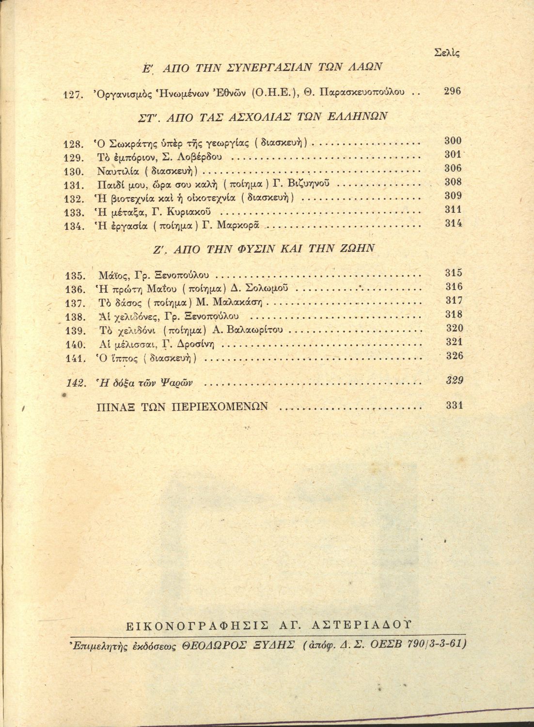 Αναγνωστικό ΣΤ΄ Δημοτικού που περιλαμβάνει θέματα από τις ελληνικές παραδόσεις και μύθους, την ελληνική φύση και θάλασσα και το τρίπτυχο "Πατρίς-θρησκεία-οικογένειαα".