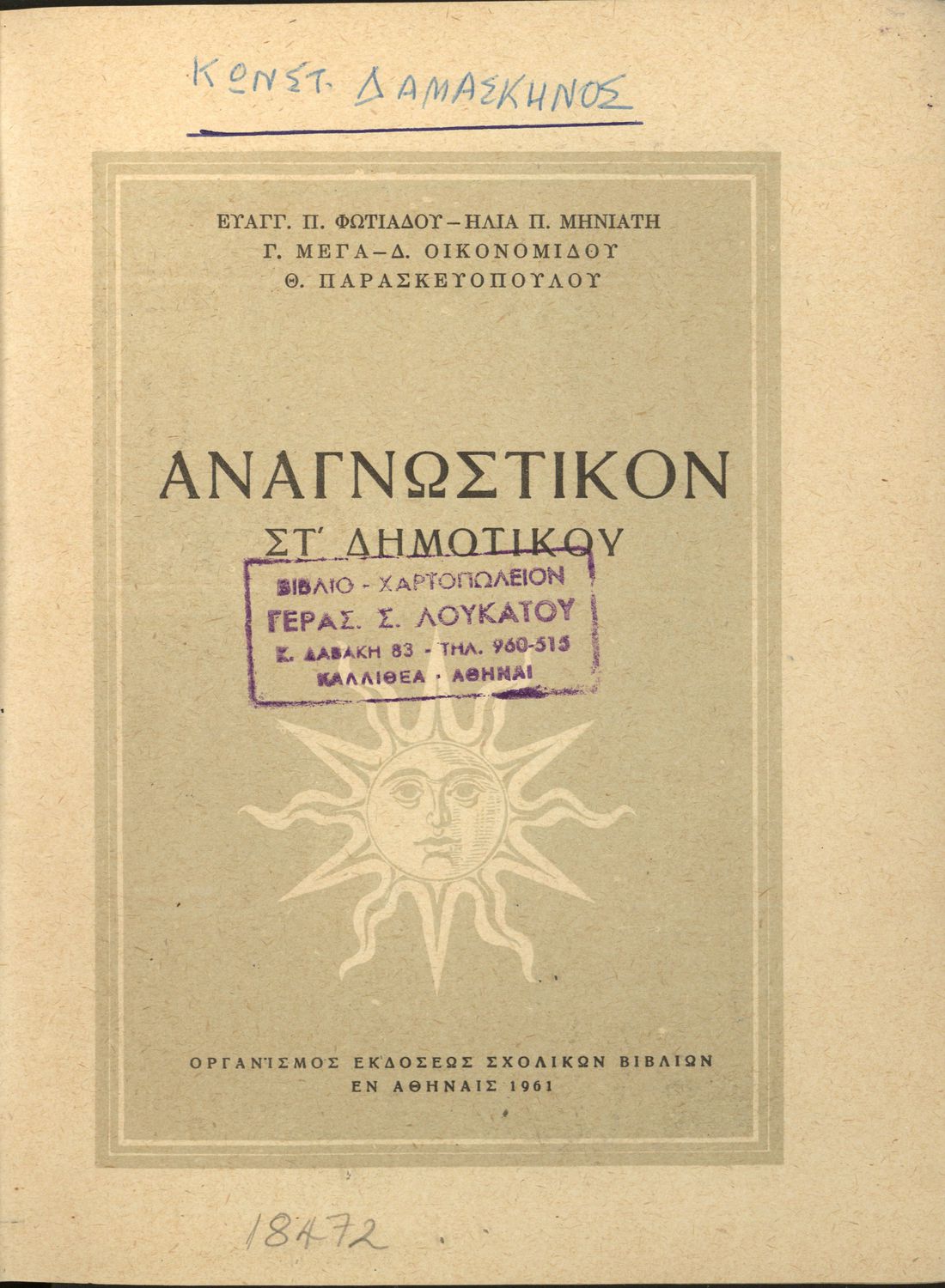 Κωδικός αναγνώρισης: 01-18472 Τίτλος: Αναγνωστικόν ΣΤ΄ Δημοτικού Συγγραφέας: Ευάγγ. Π. Φωτιάδης, Ηλίας Π. Μηνιάτης, Γ. Μέγας, Δ. Οικονομίδης, Θ. Παρασκευόπουλος Εικονογράφος: Αγ. Αστεριάδης Μέγεθος και υπόστρωμα: Σχολικό εγχειρίδιο, 20εκ., σκληρό εξώφυλλο, 336 σελίδες. Εικόνες (έγχρωμες). |