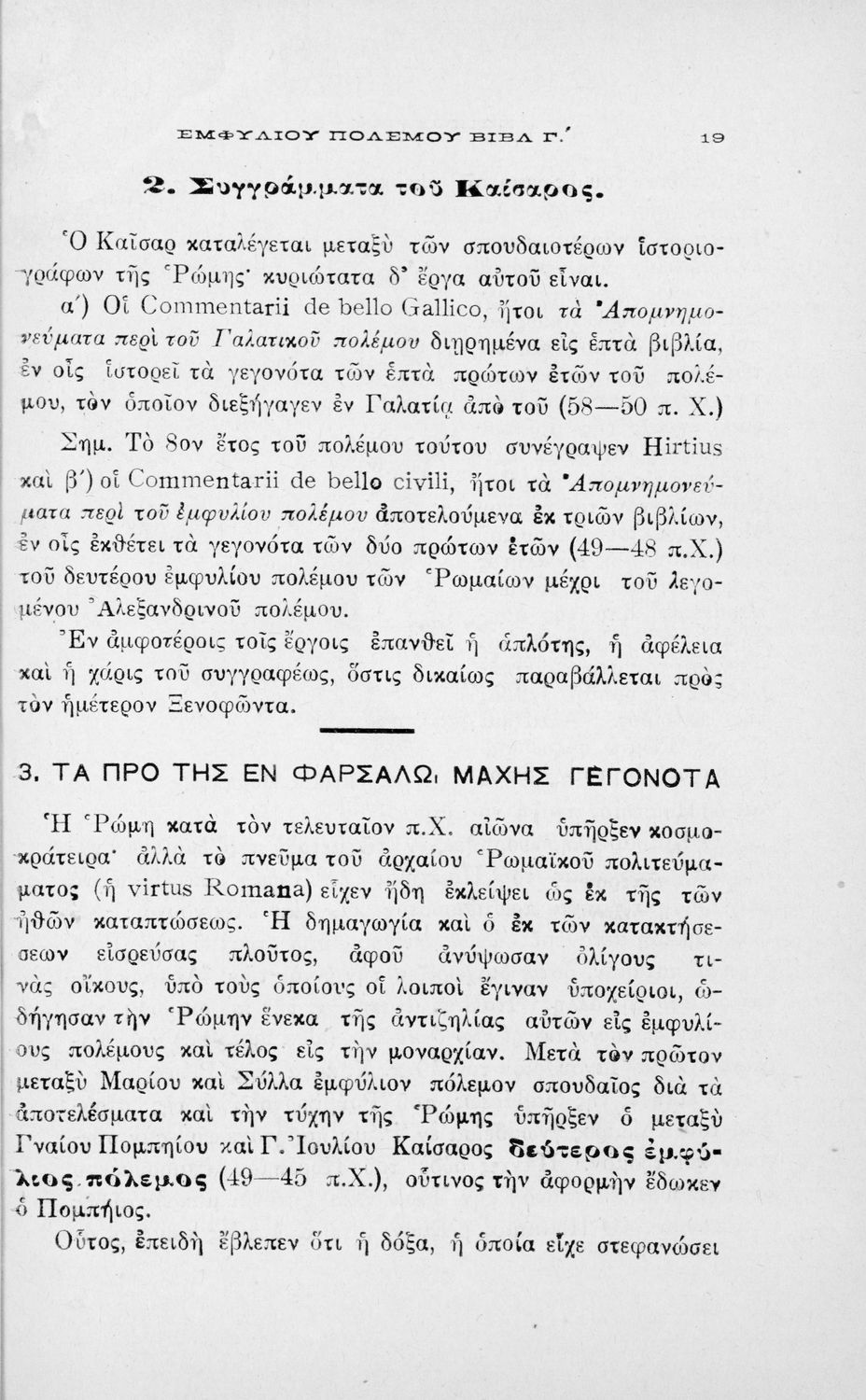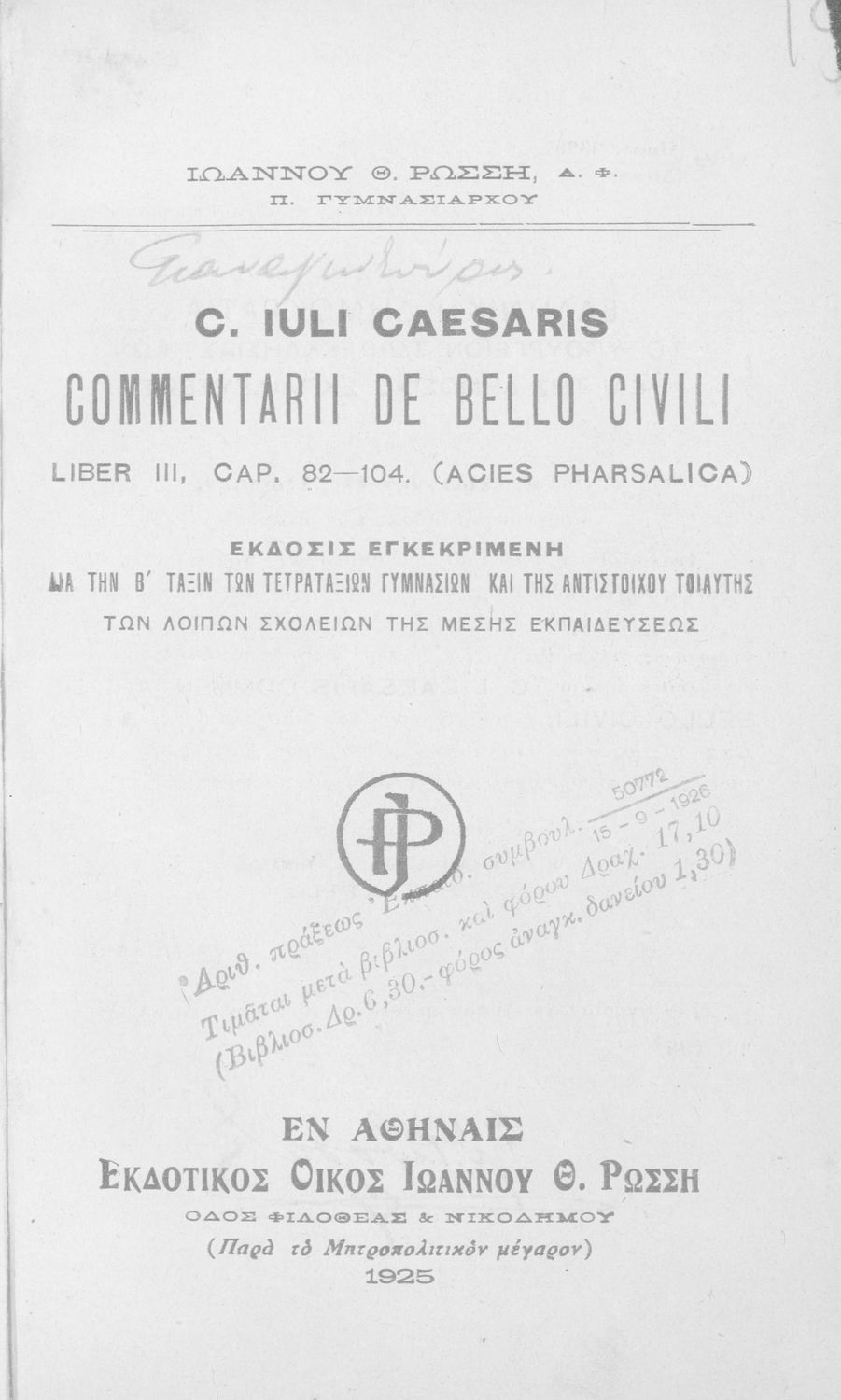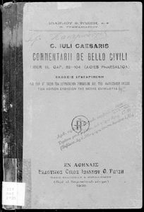 Κωδικός αναγνώρισης: 01-18477 Τίτλος: C. Iuli Caesaris comentarii de bello civili, liber iii, cap. 82-104, δια την Β΄ τάξιν των Τετραταξίων Γυμνασίων και της αντιστοίχου τοιαύτοις των λοιπών σχολείων της Μέσης Εκπαιδεύσεως Συγγραφέας: Γ. Ιούλιος Καίσαρας (C. Julius Caesar), Ιωάννης Θ. Ρώσσης (εισαγωγή, σχόλια) Μέγεθος και υπόστρωμα: Σχολικό εγχειρίδιο, 19εκ., 94 σελίδες. |
