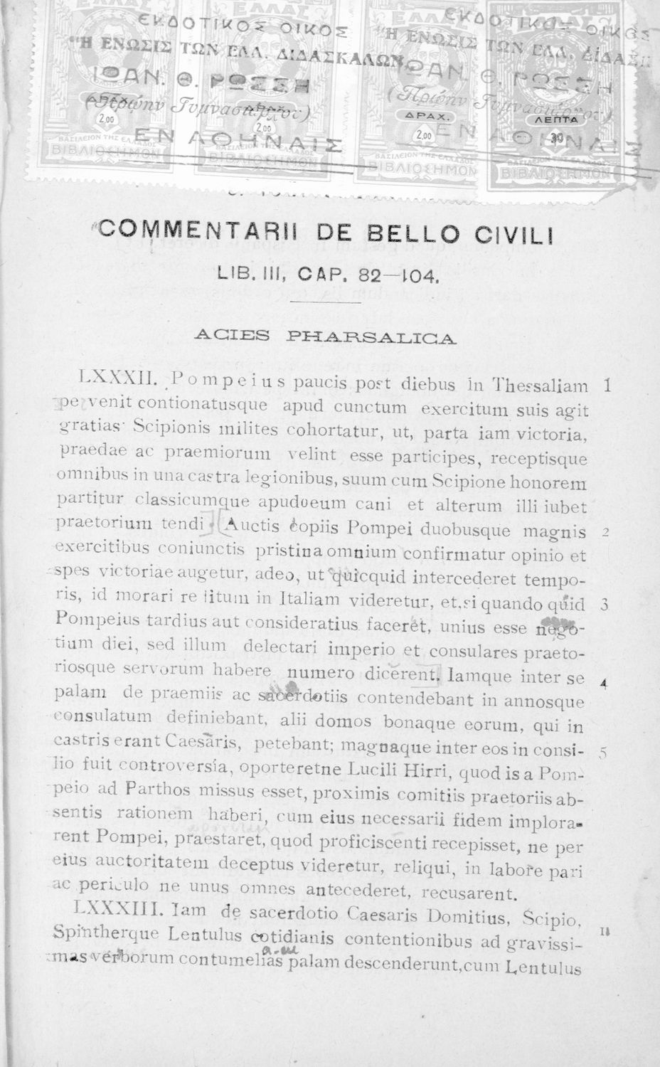 LDR 01310 2200193 4500 035 ## _a01-18477 040 ## _aΙνστιτούτο Εκπαιδευτικής Πολιτικής 041 ## _ael 100 ## _aΓ. Ιούλιος Καίσαρας (C. Julius Caesar) _aΙωάννης Θ. Ρώσσης (εισαγωγή _aσχόλια) 110 ## _a18477 245 0# _aC. Iuli Caesaris comentarii de bello civili, liber iii, cap. 82-104, δια την Β΄ τάξιν των Τετραταξίων Γυμνασίων και της αντιστοίχου τοιαύτοις των λοιπών σχολείων της Μέσης Εκπαιδεύσεως 260 ## _aΑθήνα _bΙωάννης Θ. Ρώσσης _c1925 300 ## _a94 _c19 520 ## _aΣχολικό εγχειρίδιο Λατινικών για τη Β΄ Γυμνασίου που περιέχει αποσπάσματα από τα απομνημονεύματα του Ιούλιου Καίσαρα, σύντομο βιογραφικό σημείωμα, εισαγωγή στο έργο και πραγματολογικά και γλωσσικά σχόλια. 521 ## _aΒ' Γυμνασίου 522 ## _aΕλλάδα 546 ## _aΚαθαρεύουσα 583 ## _a13997/7-4-1925 _c1925 650 #4 _aΠομπήιος _aΣκιπίωνας _aΦάρσαλα