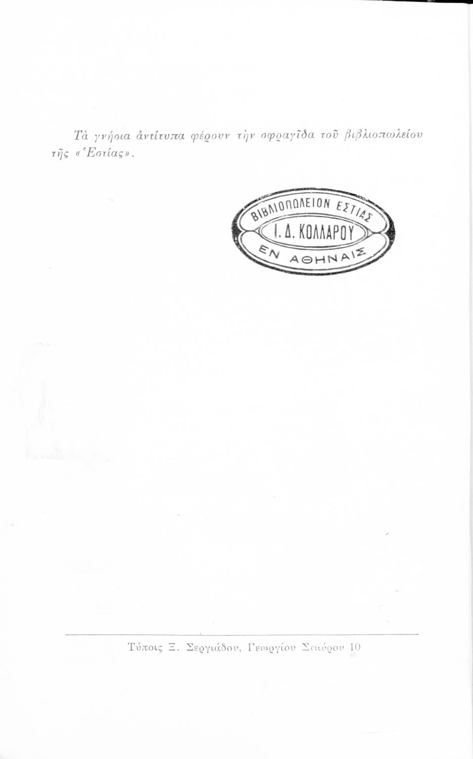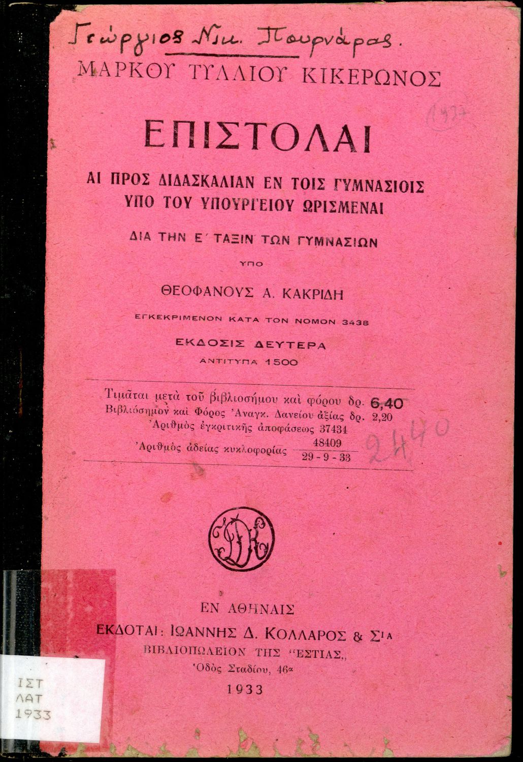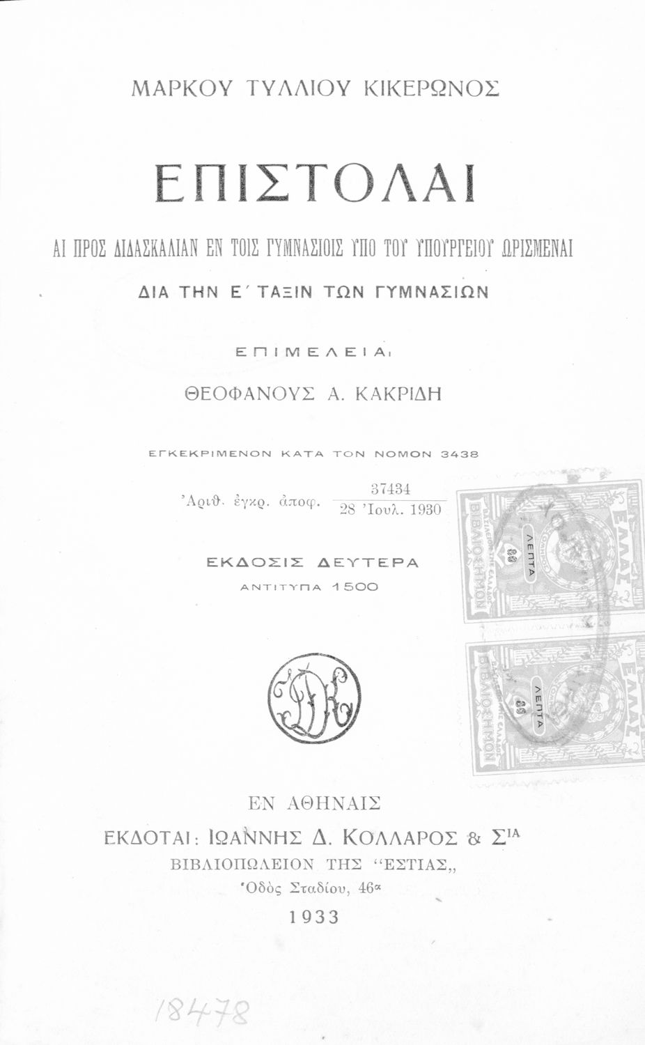 Εκδότης: Ιωάννης Δ. Κολλάρος Έτος έκδοσης: 1933 Τόπος έκδοσης: Αθήνα Έκδοση: 2η Υπουργική απόφαση / Σύμβαση: 37434/28-7-1930 Έτος έγκρισης: 1933 |