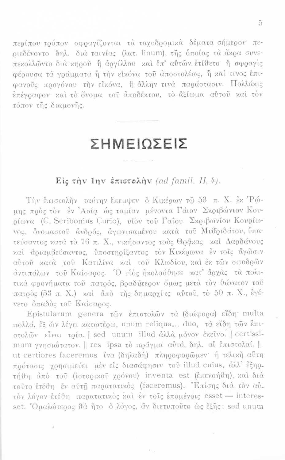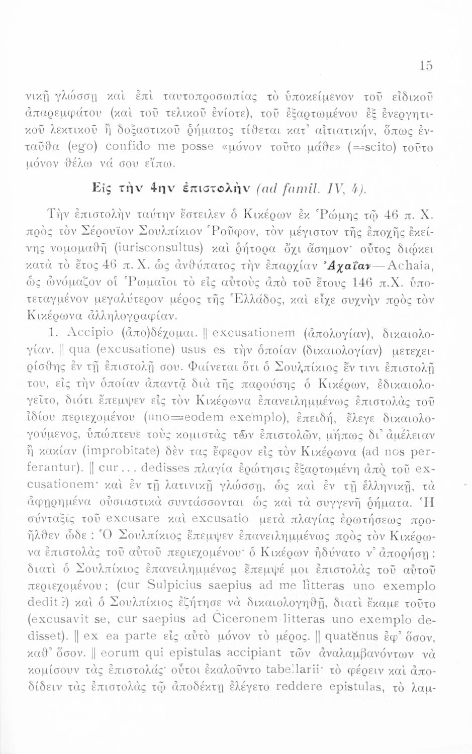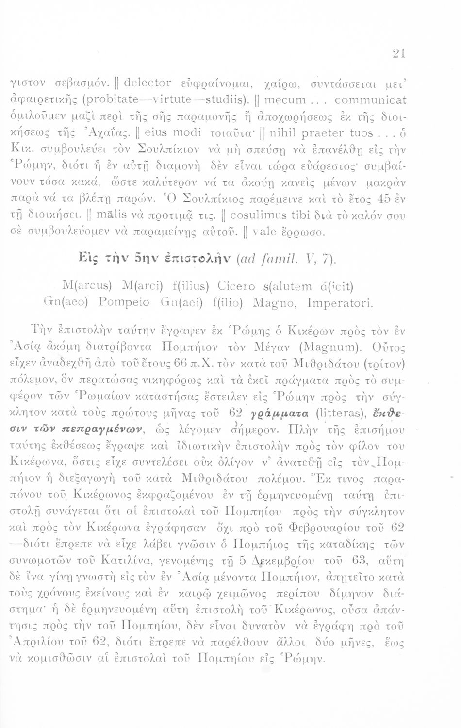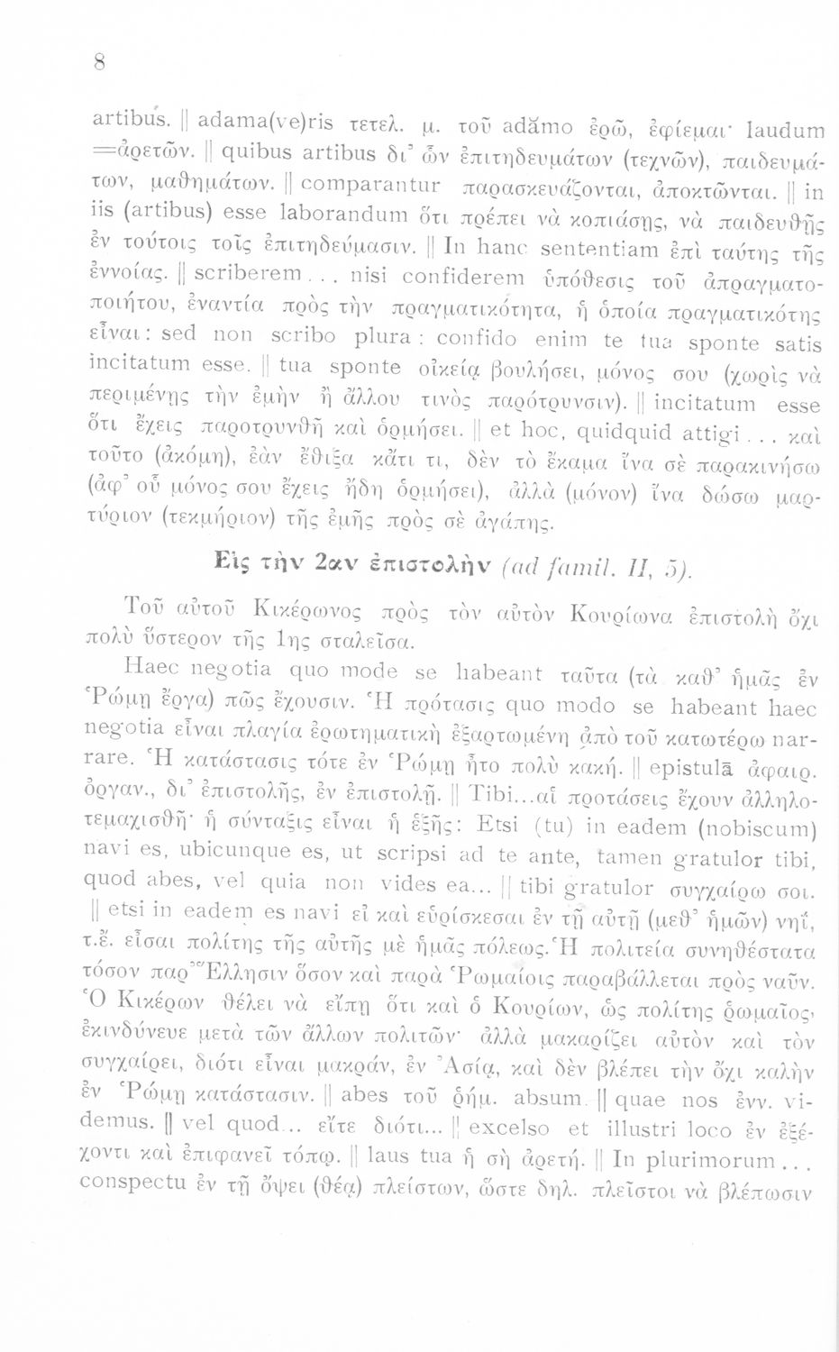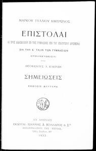 Σχολικό εγχειρίδιο Λατινικών για την Ε΄ Γυμνασίου που περιλαμβάνει ερμηνευτικά σχόλια πάνω στις επιστολές του Κικέρωνα προς τους οικείους του και προς τον Αττικό.