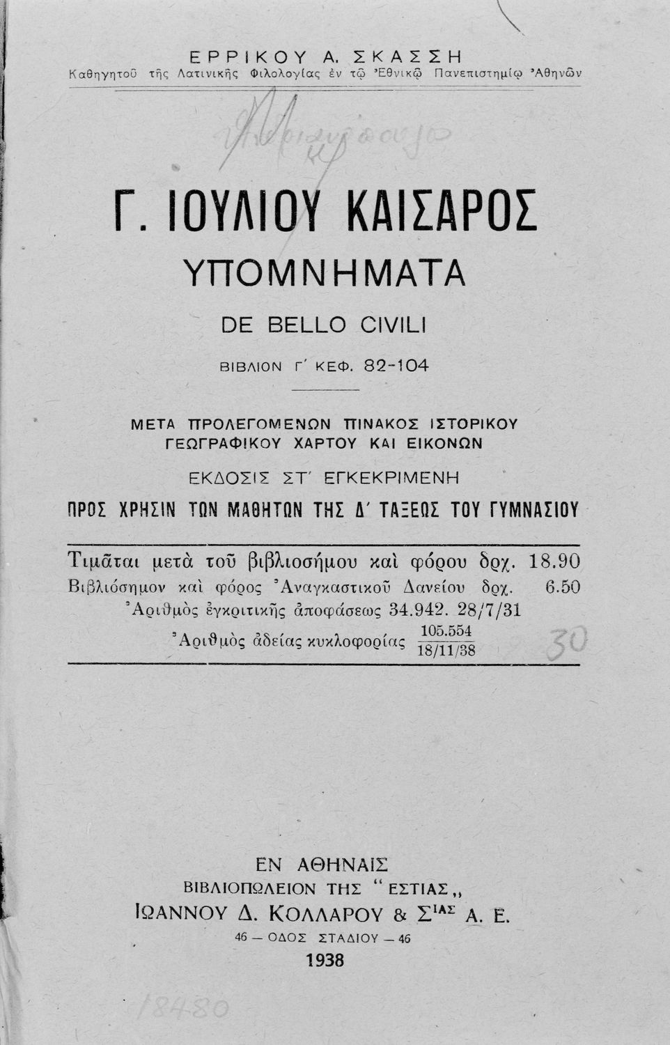 Κωδικός αναγνώρισης: 01-18480 Τίτλος: Γ. Ιουλίου Καίσαρος Υπομνήματα De bello civili Βιβλίον Γ΄ κεφ. 82-104 προς χρήσιν μαθητών της Δ΄ τάξεως του Γυμνασίου Συγγραφέας: Γ. Ιούλιος Καίσαρας (C. Julius Caesar), Ερρίκος Α. Σκάσσης (επιμέλεια) Μέγεθος και υπόστρωμα: Σχολικό εγχειρίδιο, 20εκ., σκληρό εξώφυλλο, 72 σελίδες. Σκίτσα και χάρτες (ασπρόμαυρα). |
